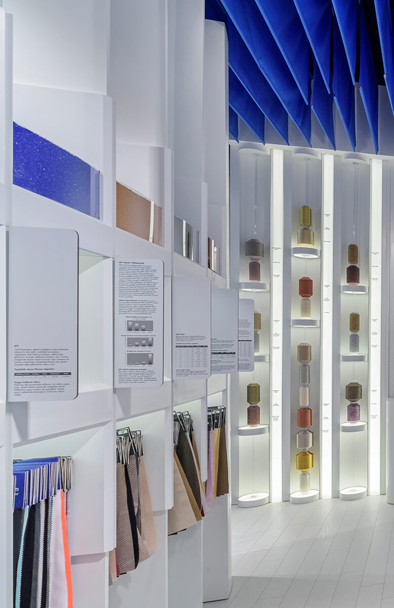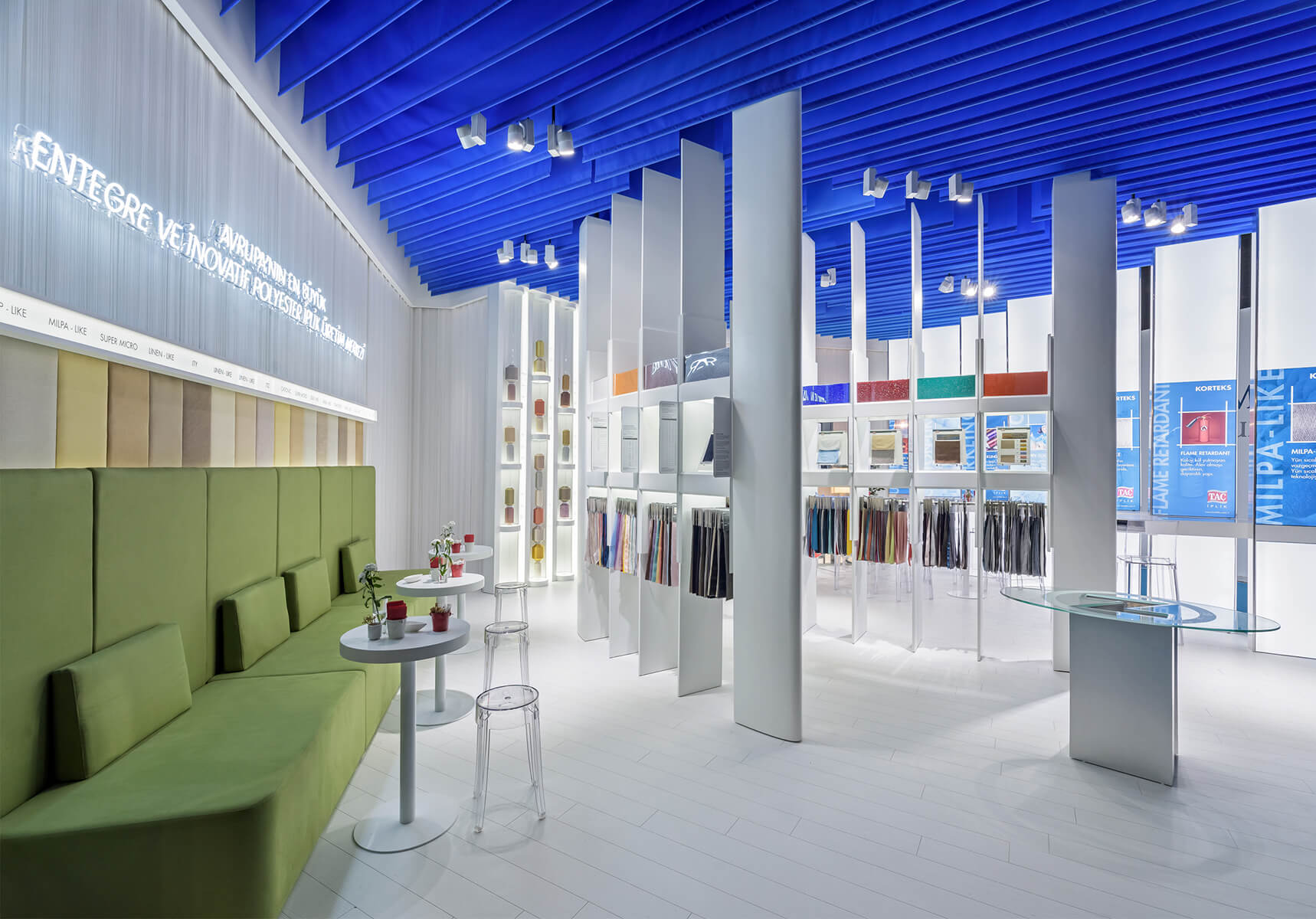 Natural materials, pure geometries, and carefully designed lighting reflected Korteks’s commitment to innovation, sustainability, and cutting-edge production. The temporary structure was envisioned not merely as a display zone, but as a spatial representation of the brand’s forward-thinking ethos.