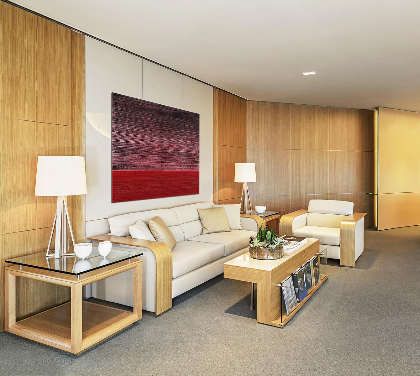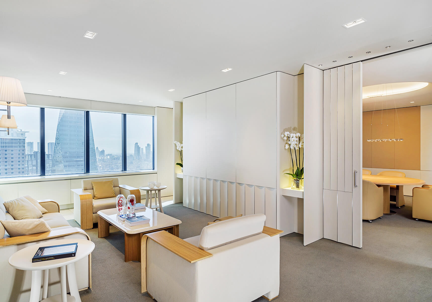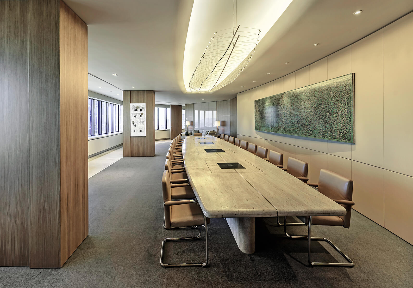 The head office of one of the world’s leading cement manufacturers is set off by a sculptural concrete information desk gradually transforming into a light structured staircase. Escalating through a vast gallery space, the staircase becomes the focal point of the whole design, amidst a lounge area luminous with natural light equipped for use by both employees and visitors of the company.