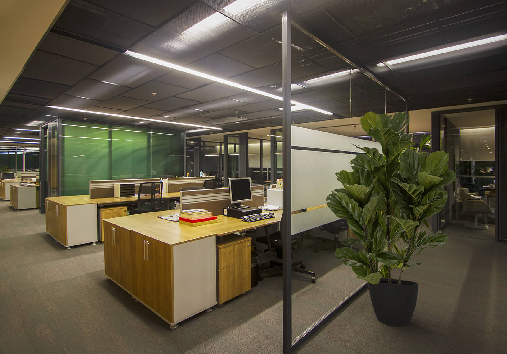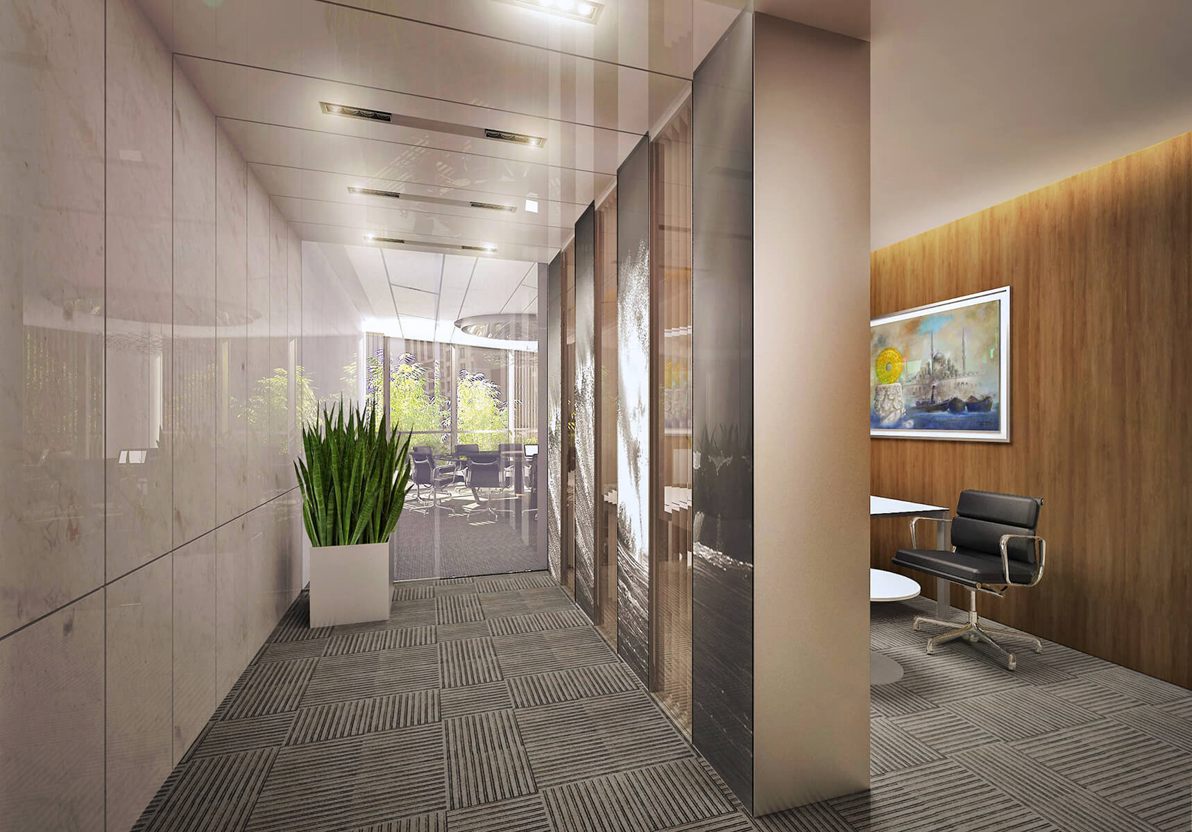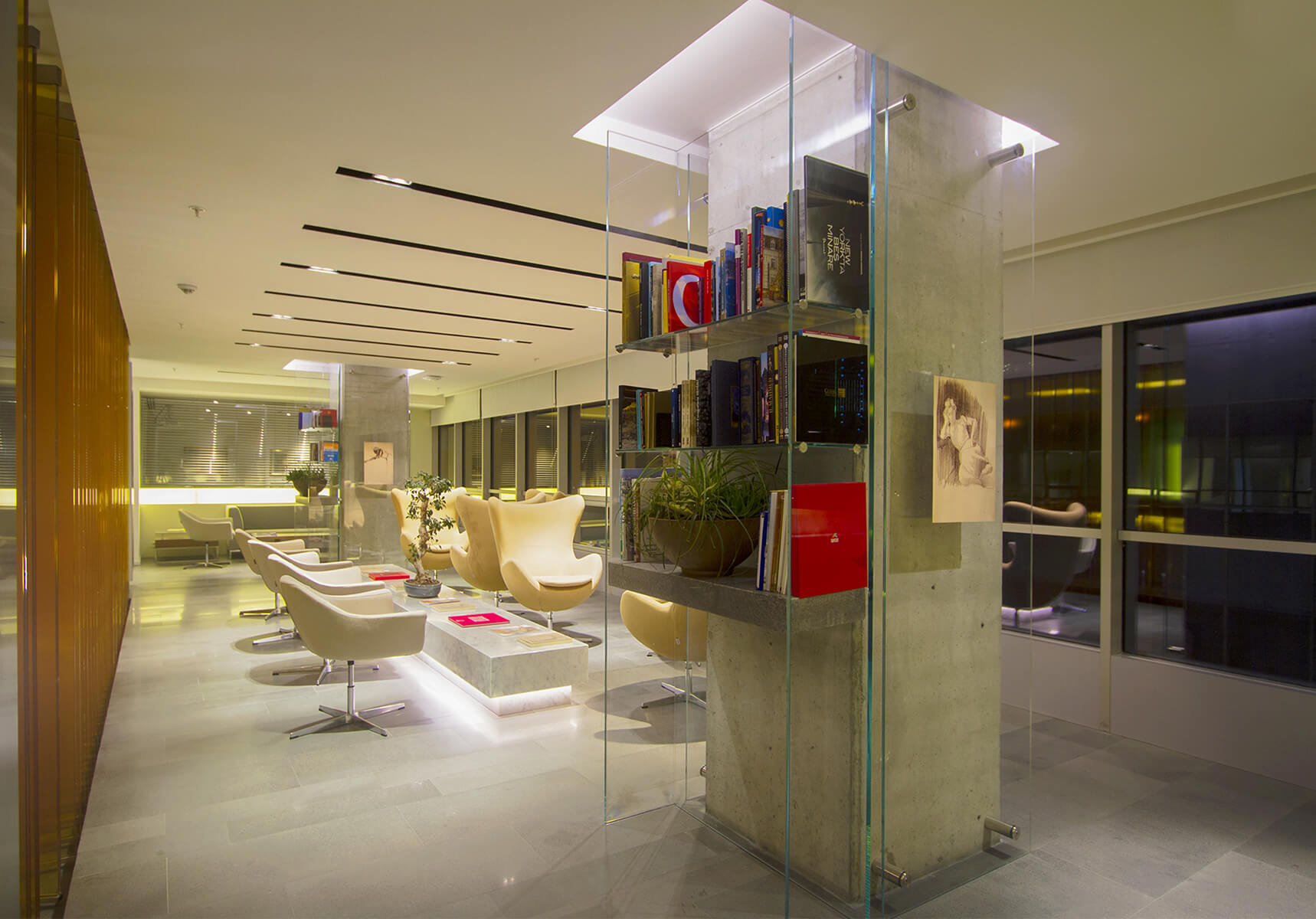 The design approach, material and color selections were all inspired by the main product of the company, high strength white cement. It was also implemented on wall panels, floor coverings, open office area dividing plant containers, ceiling fixtures and furniture.