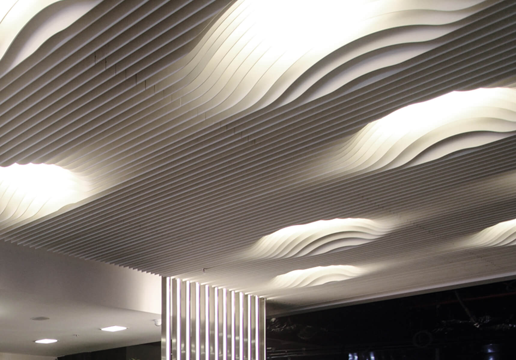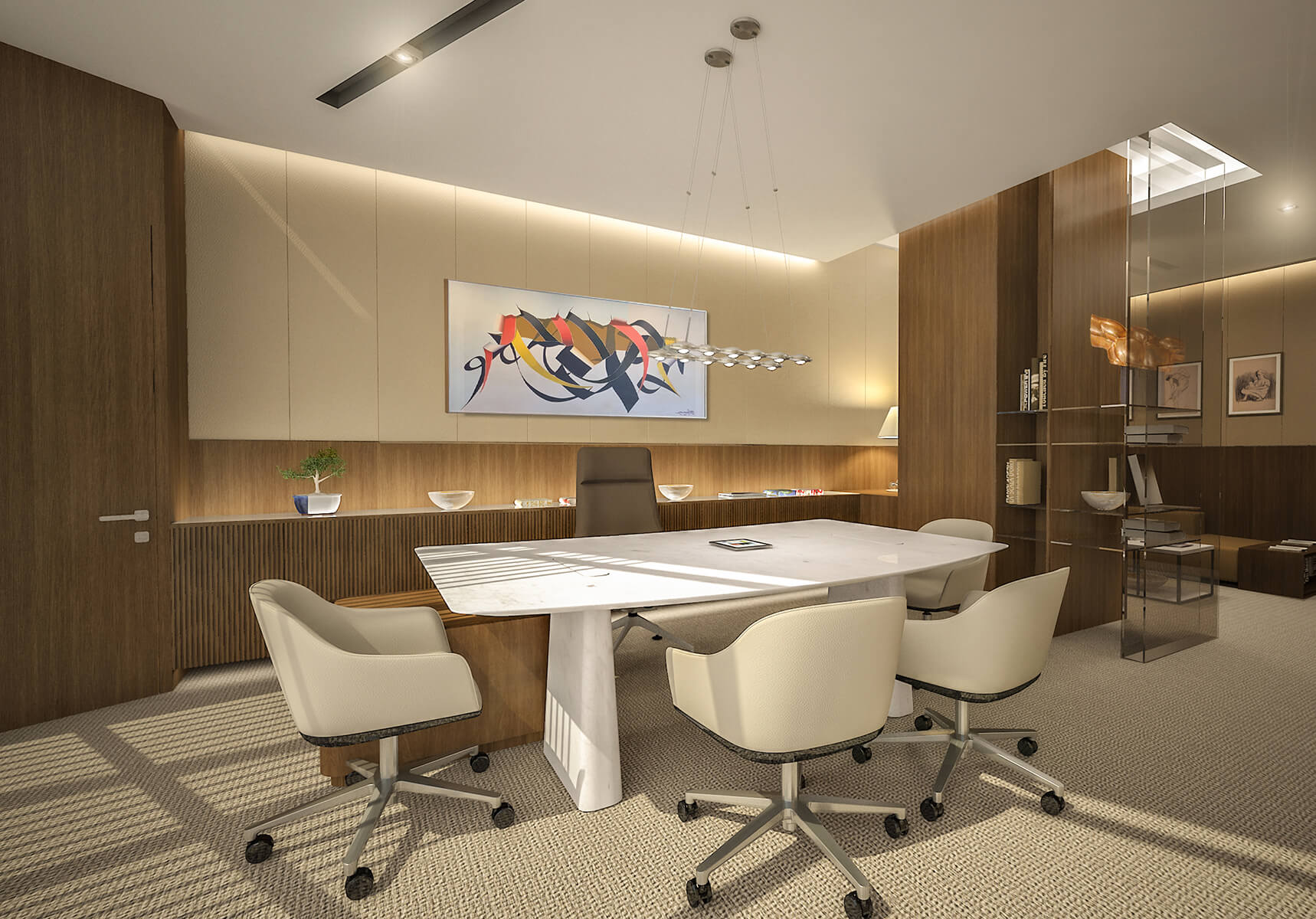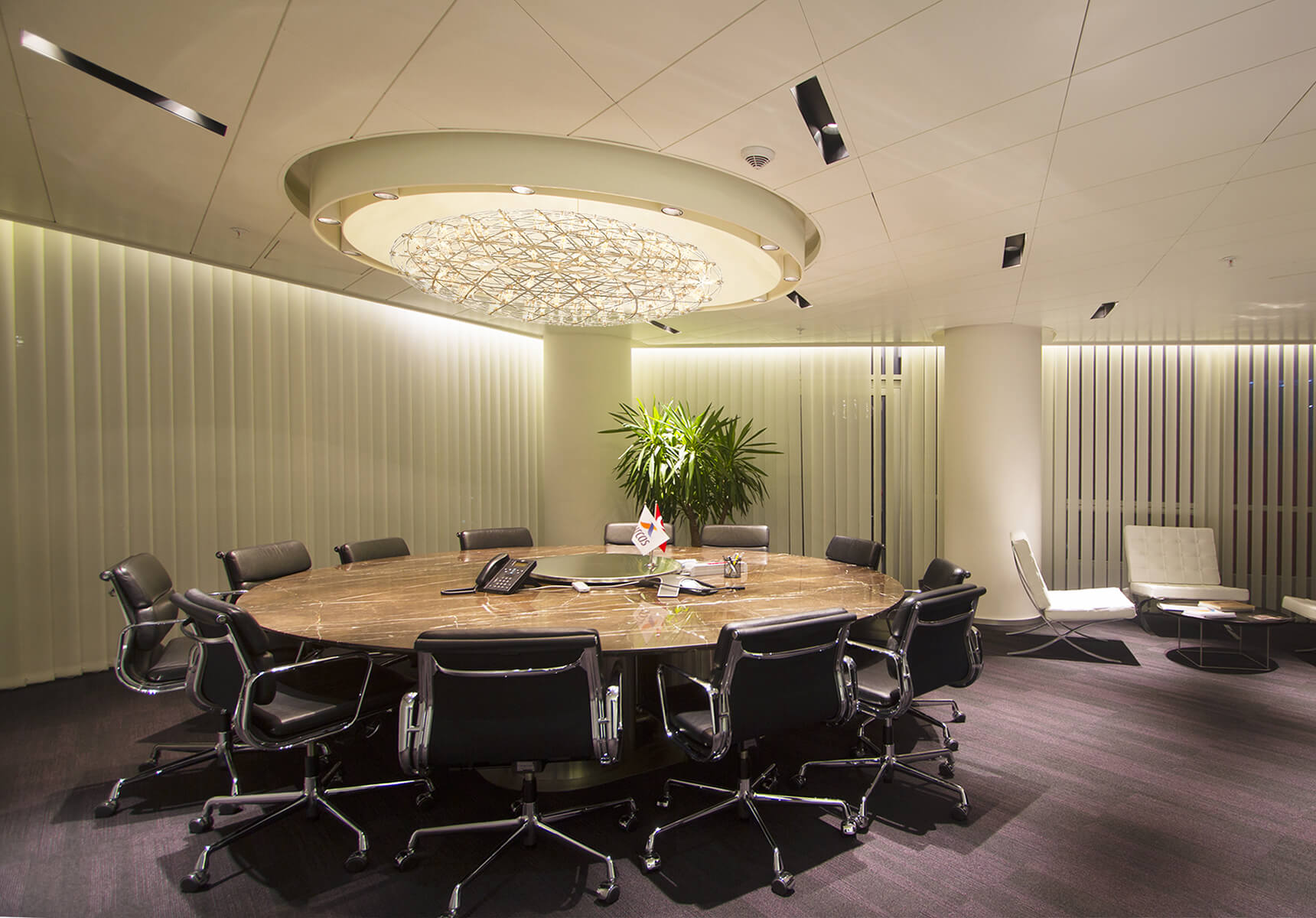 The design approach, material and color selections were all inspired by the main product of the company, high strength white cement. It was also implemented on wall panels, floor coverings, open office area dividing plant containers, ceiling fixtures and furniture.