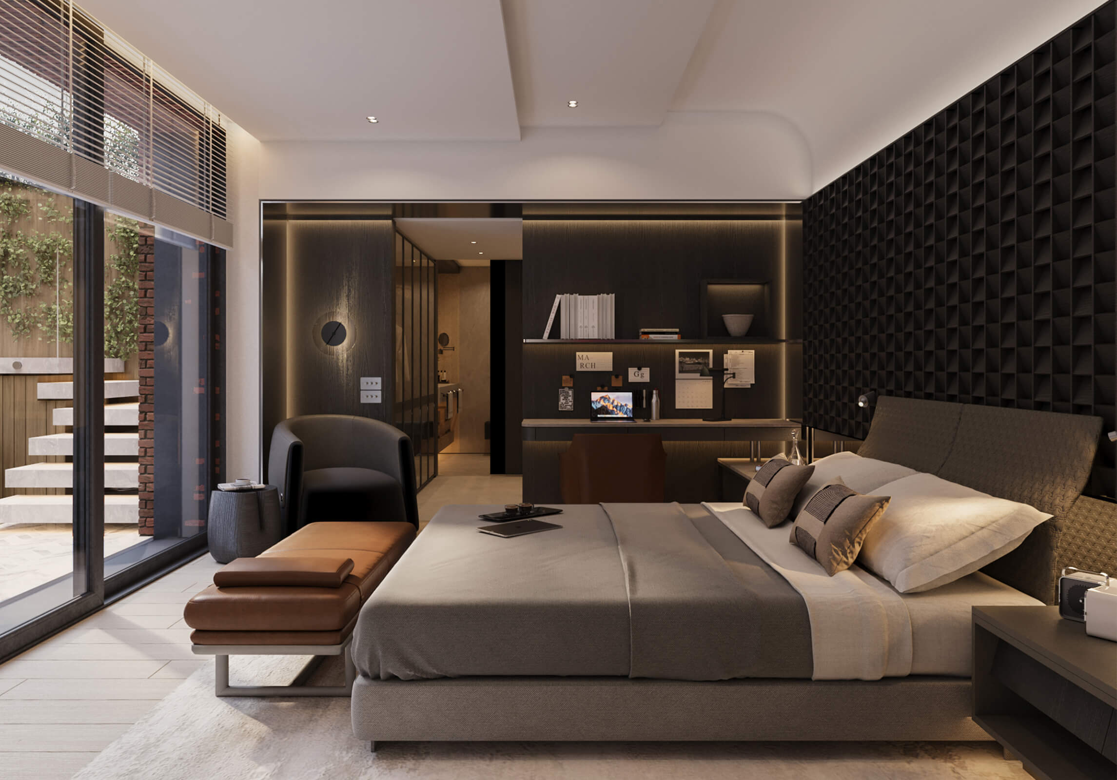 At the center of the apartment is a sculptural, steel-constructed staircase that dominates the interior courtyard. The U-shaped layout creates a spacious relationship between rooms, all opening to the internal garden. The internal garden allows natural light to flood the space, adding an element of tranquility and nature. Large glass surfaces enhance the interaction with light and shadow, enriching the interior. High ceilings and expansive terraces provide a commanding view of the front garden. Masculine and sculptural forms, with clean lines in the furniture and structural elements, strengthen the modern identity of the space.