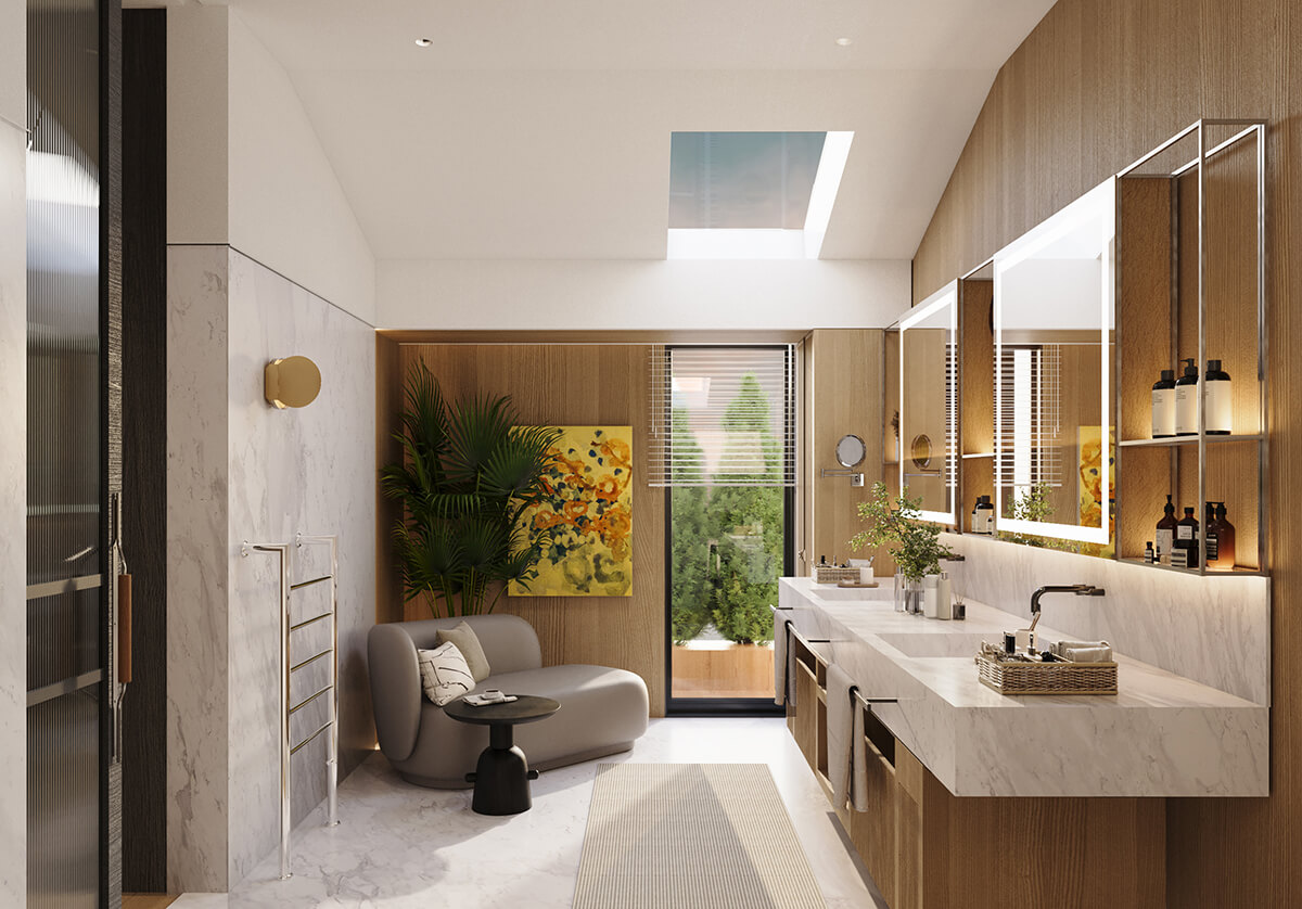 The interior seamlessly extends toward the terraces, creating fluid living spaces that open up to the Bosphorus skyline. As the daylight shifts throughout the day, so does the atmosphere of the space — revealing new depths and subtleties within the design.