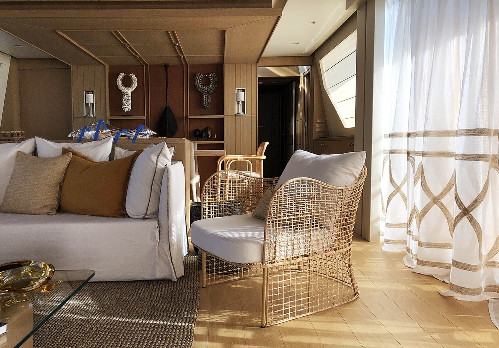 The core focus of the design is to evoke refined expressions of the art of living in every corner of the yacht—creating serene, timeless spaces. Light-toned natural woods, natural woven wall coverings, and textured fabrics define a modern, understated, and warm atmosphere. From built-in furniture to the art collection, every detail has been custom-designed to reflect the owners' personal preferences.