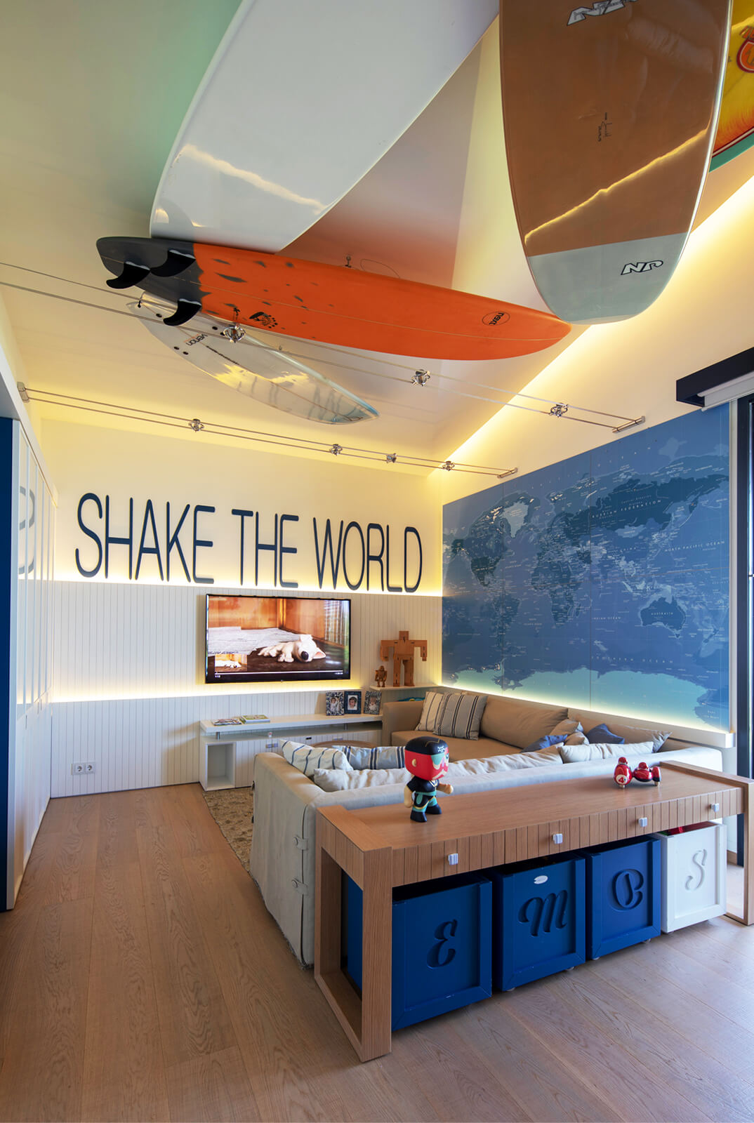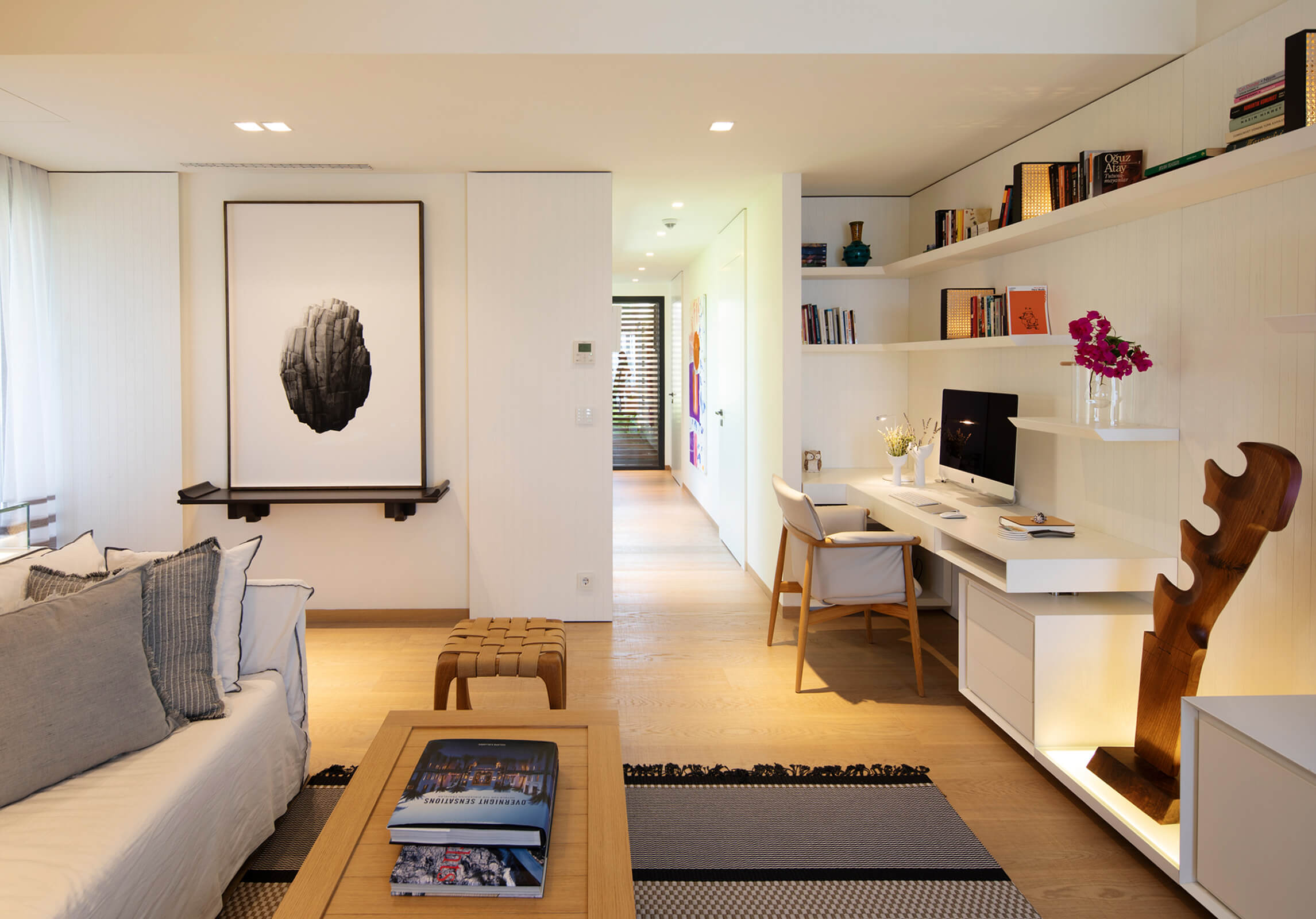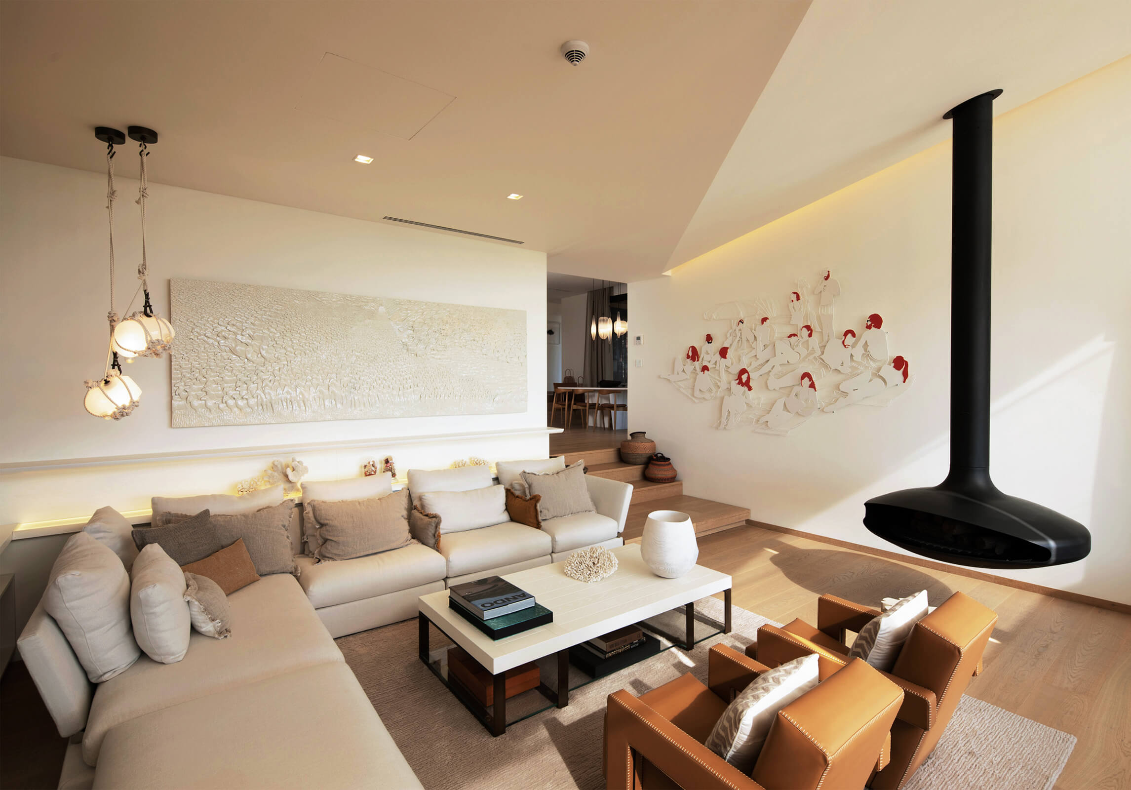 Modern yet full of summer breeze.. Located on the beautiful Aegean coast, across the bay from Bodrum, this three storey contemporary villa is part of an exclusive project designed by architect Carlos Ferrater. For this particular project KM selected a soft palette of whites, earth tones and natural textures with carefully placed contrasting blacks. The furnishings tailored to the residence are designed to complement a number of artworks that the owner has acquired from around the world. Others were purchased specifically to enrich the summery Mediterranean ambience with a contemporary twist. Equipped with a garden and swimming pool, the three storey family house also contains a small patio. A separate common area was needed for the family’s four young children. KM designed a colorful canopy of surf boards that hovers above the children’s lounge, a playroom to capture the children’s attention and stimulate their imagination.