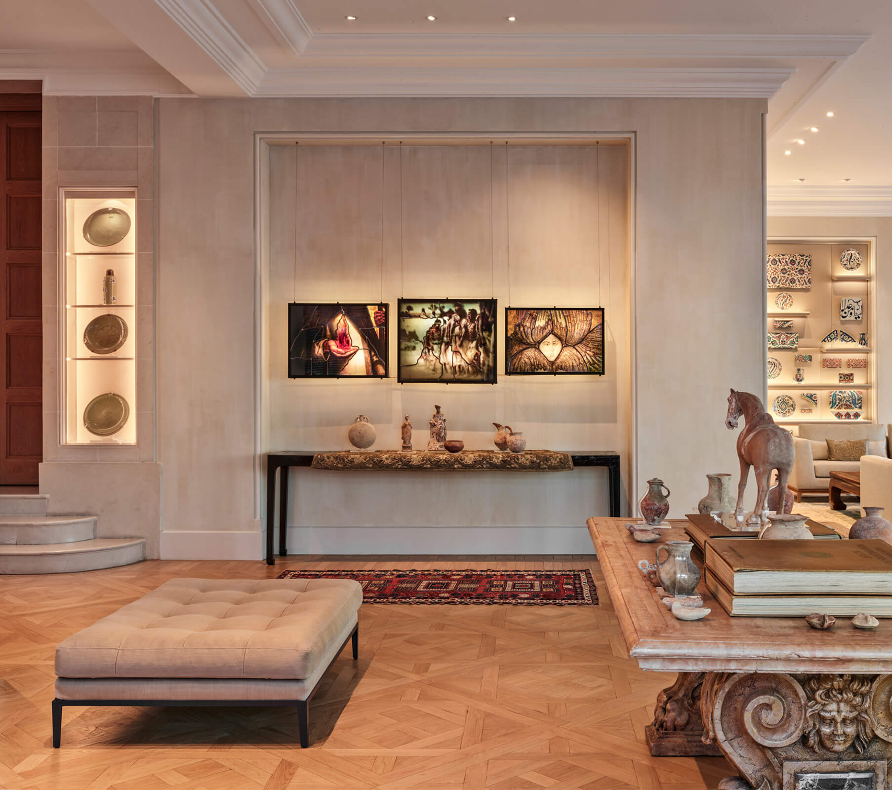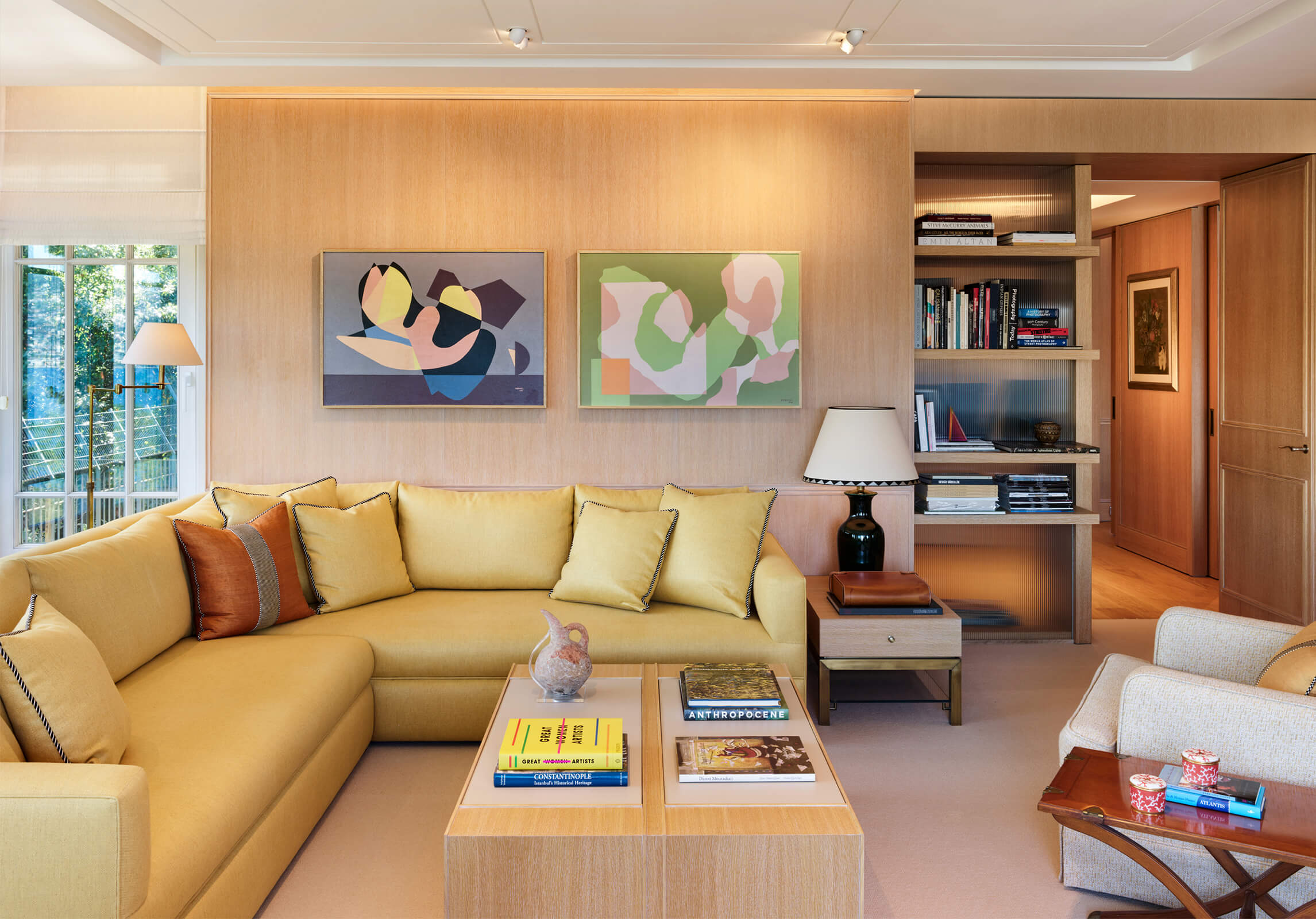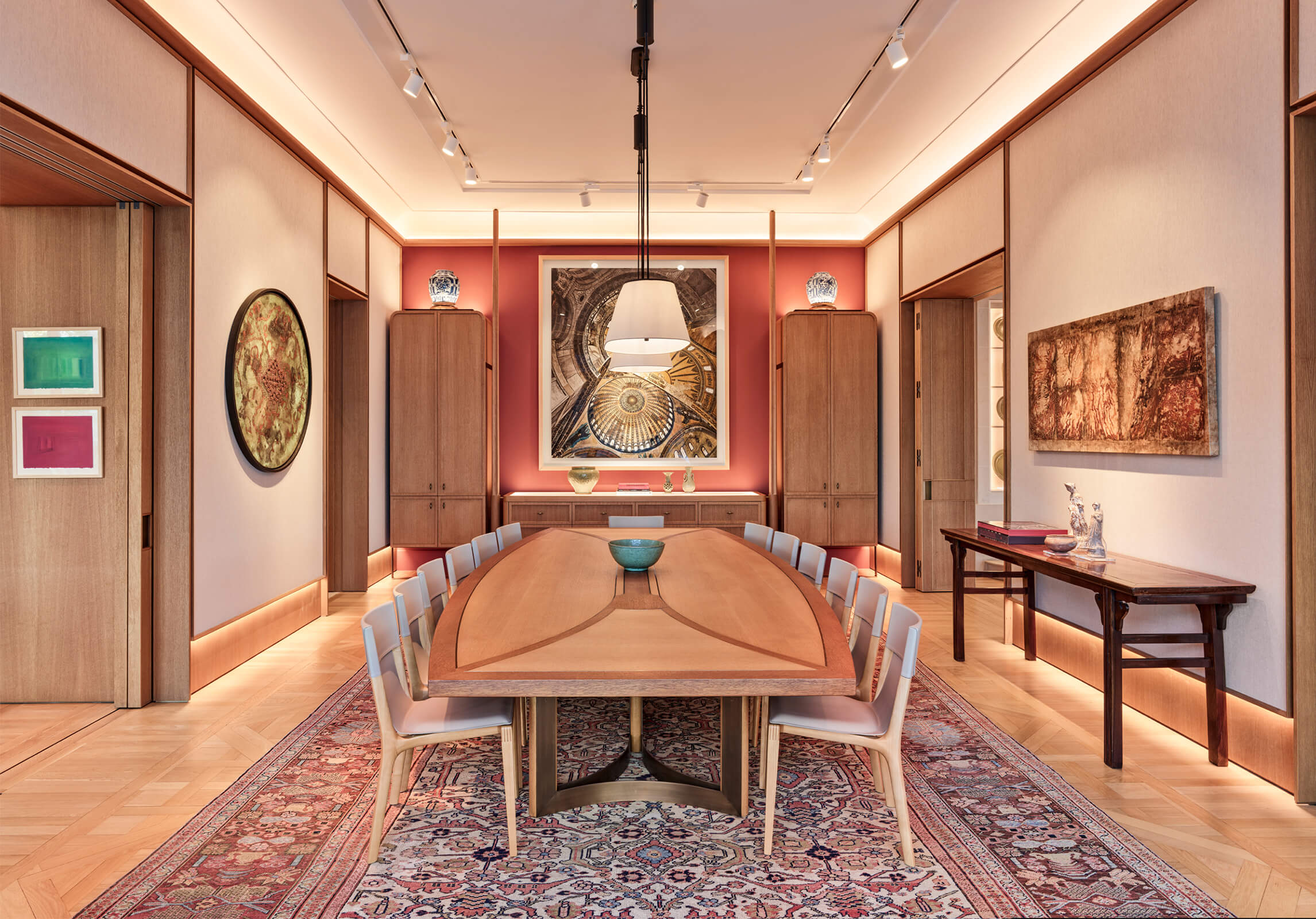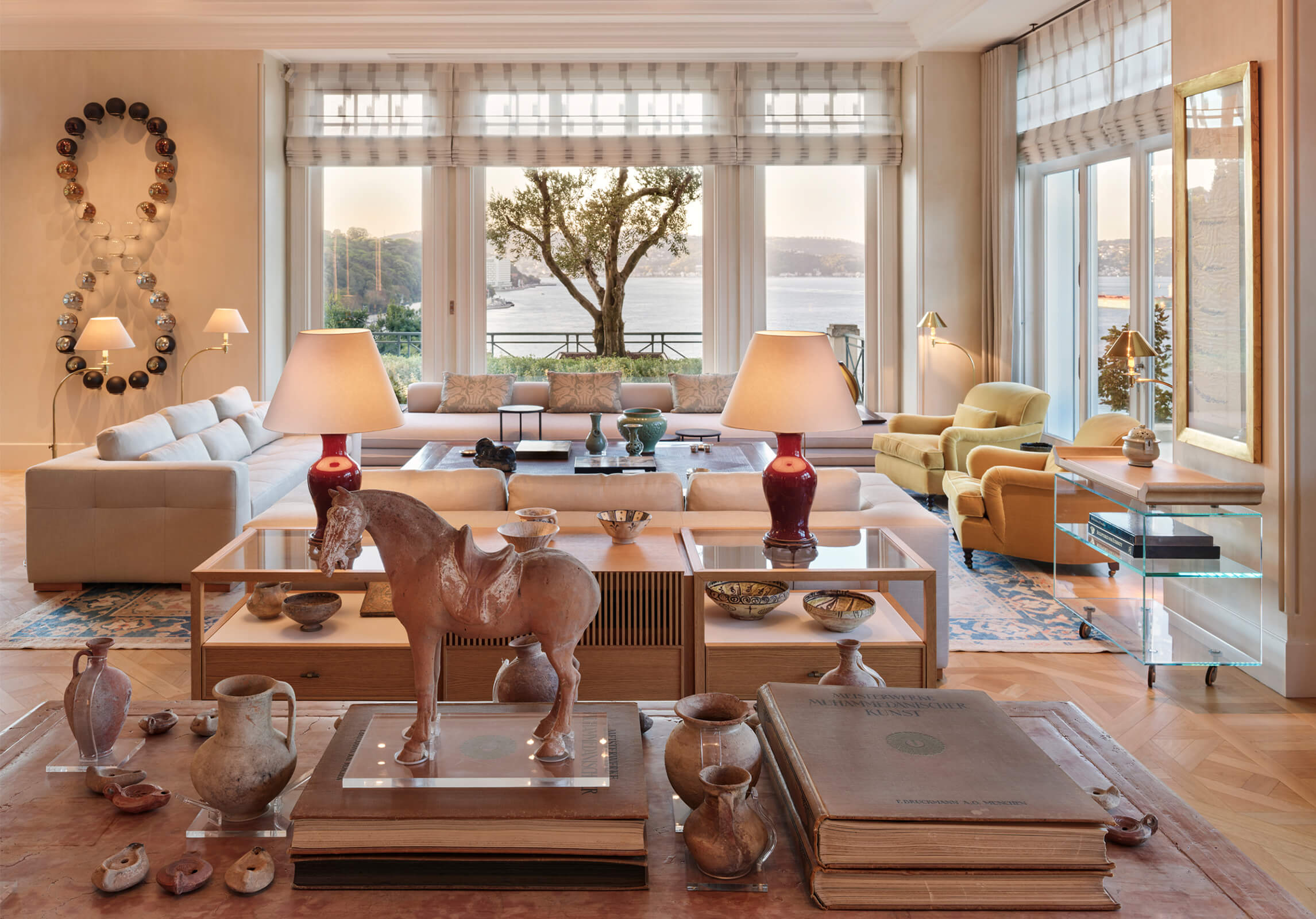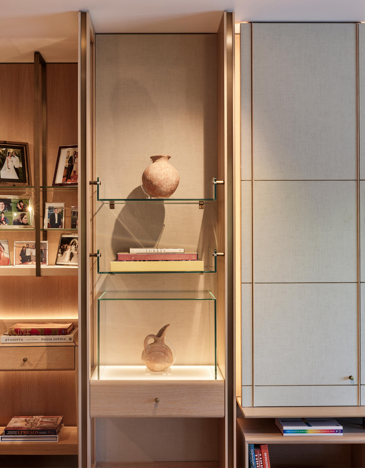 The main feature of this mansion set atop a hill in Istanbul’s leafy Yeniköy district is its sweeping views of the Bosphorus. The program called for a redesign of the original interior to meet the needs of a middle aged couple whose children had grown. On the first floor the children’s bedrooms were canceled to enlarge the sitting room and the home office/lounge room. The rooms were connected through a wide opening that can be closed when needed with sliding oak panels. On the ground floor a series of spaces were joined together, starting from a breakfast lounge, leading to a dining room which then opens to the grand living room. The arrangement of finely crafted built-in furniture, for example the wide oak panel sliding doors between the breakfast lounge and dining room can completely disappear or one can be left as a separator, to allow direct visual contact between these spaces. This serves to highlight space saving and augmenting qualities of the design. Living potentialities of each room are maximized where each room is given individual qualities while being part of the whole.