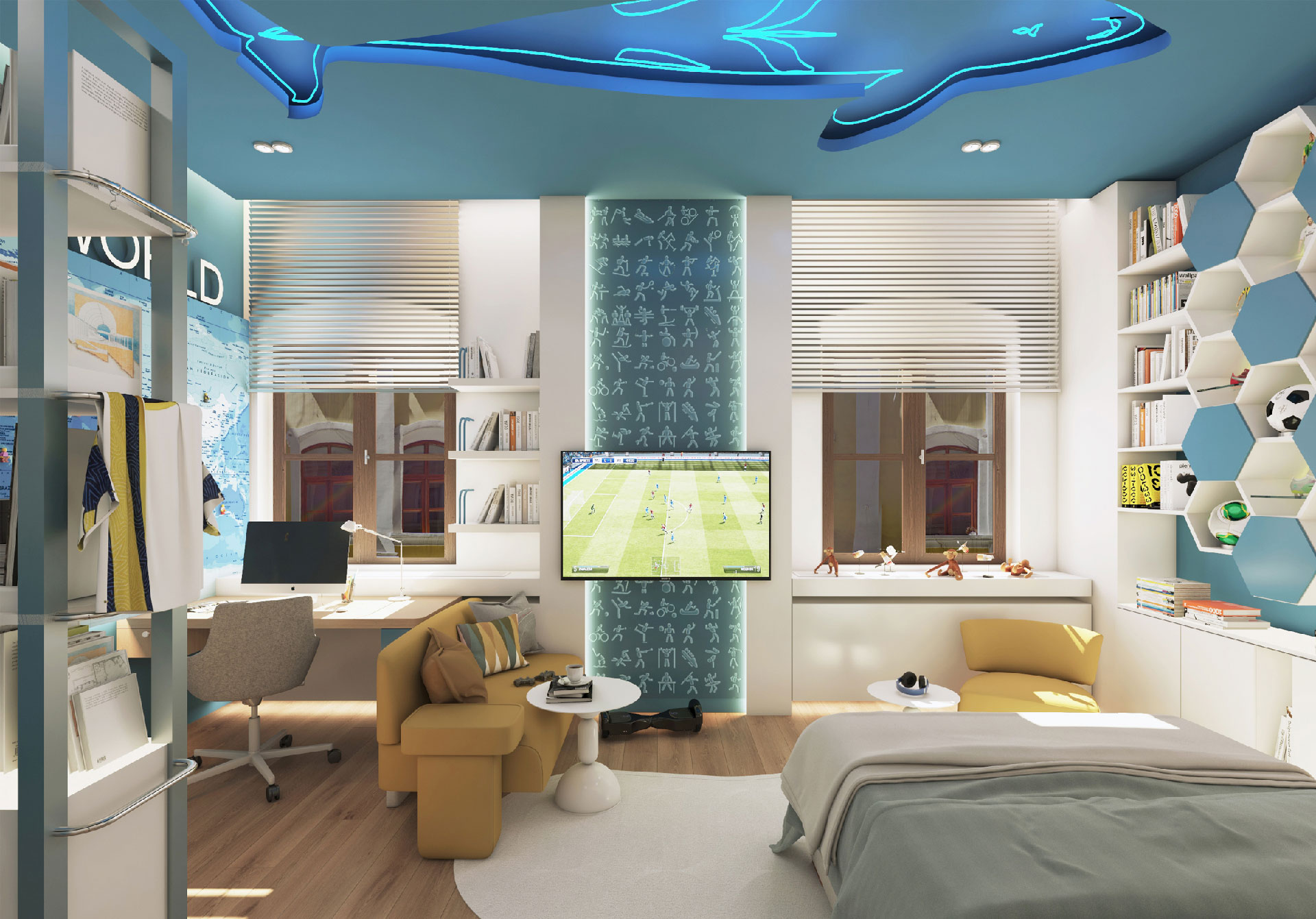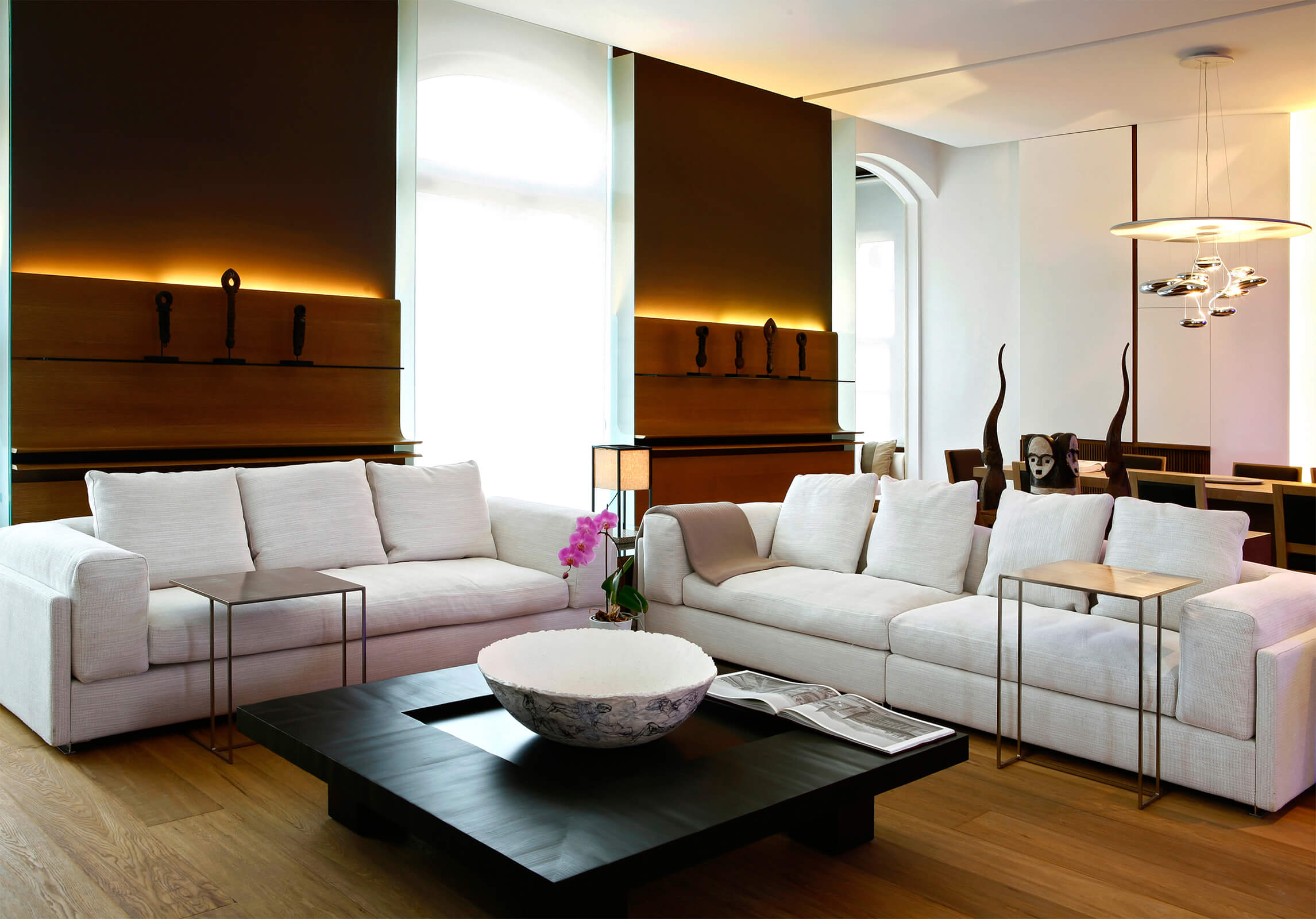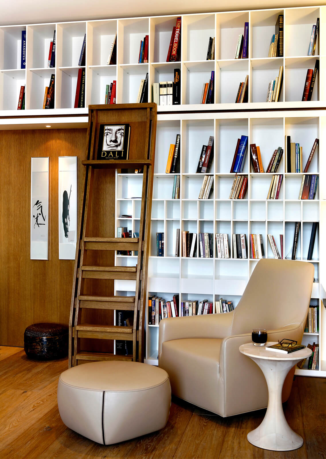 In this flat overlooking the Historic Peninsula with views of the Topkapı Palace, KM uses a vigorous layer of built-in units and furniture, which intelligently blends in with the walls, hiding its functionality while creating a subtle yet unique design aesthetic. As seen in the dining area, this play between form and function is enriched with curvy forms and indirect lighting. The most intriguing part of the house is perhaps the bookcase, a built-in unit separating the kitchen and living room, also connecting them through a window and counter. Floor to ceiling shelves with various sized grids emphasize the high ceiling of the historic building. Also giving considerable character and warmth to the space, the bookcase design is topped with an oak custom made sliding ladder, the perfect addition to a modern home library.