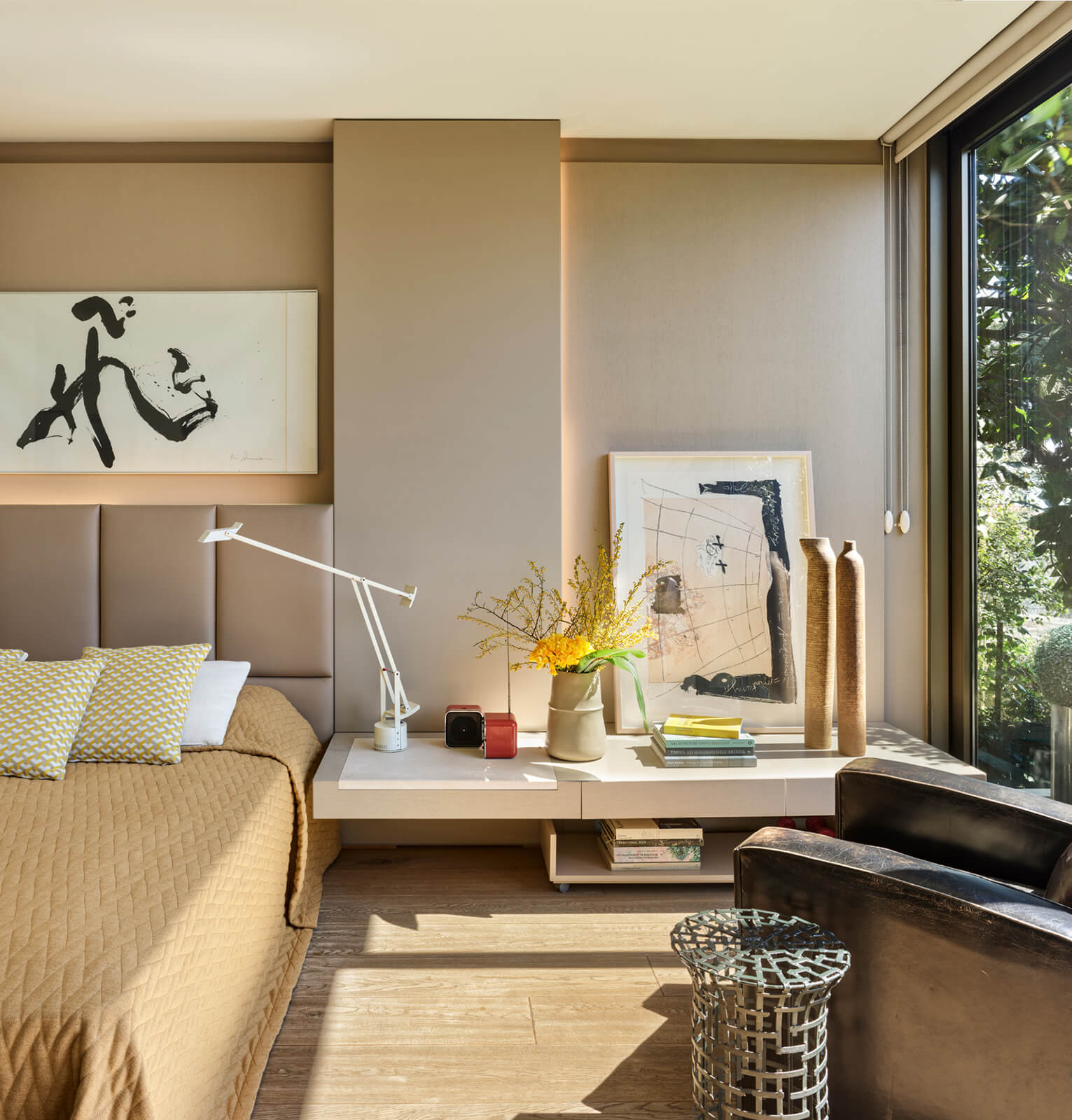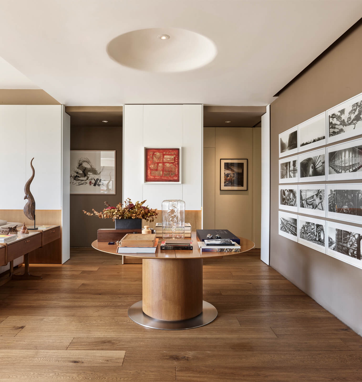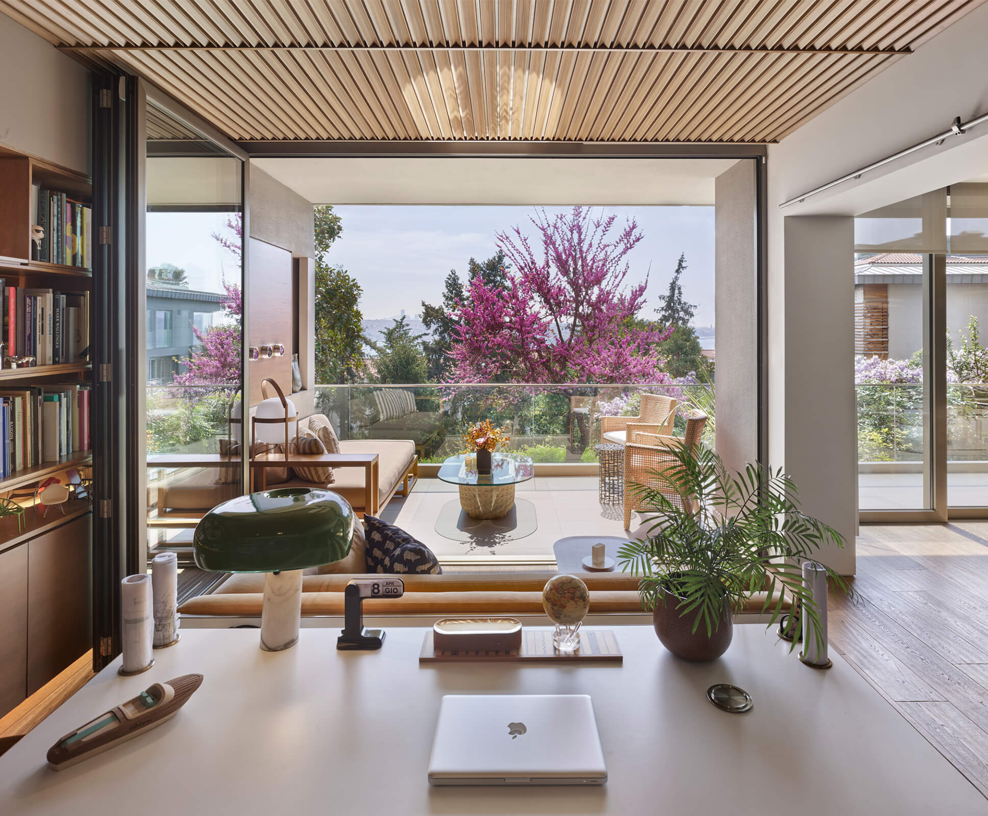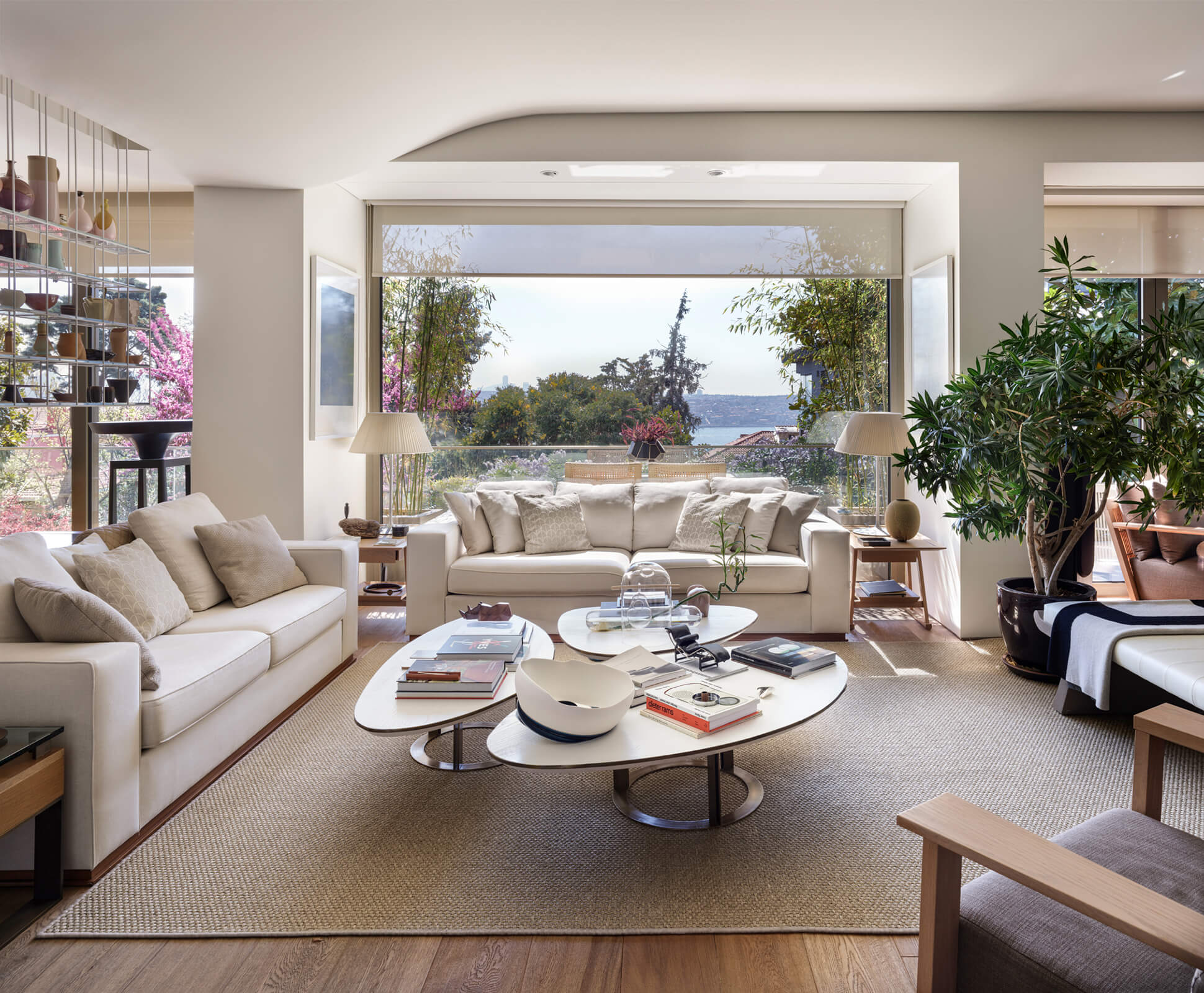 A family home for three, the architect’s own apartment provides a large and elongated living room, subtly divided by permeable separators to create a harmonious and calm common area for the family, allowing its members to spend time individually in the same space. These subtle dividers vary in color, material and form; some also function as display units or shelving, a design aspect commonly used in KM interiors. The curvilinear plaster ceiling adds distinct character, punctuates the harmony and continuity of the space while aptly concealing the beam across the ceiling. The front of the apartment is a 30 meters long fully glass façade that opens on to a 30 meters long terrace which looks out to an old green garden with typical Istanbul trees and plants through which one can get occasional glimpses of the Bosphorus.