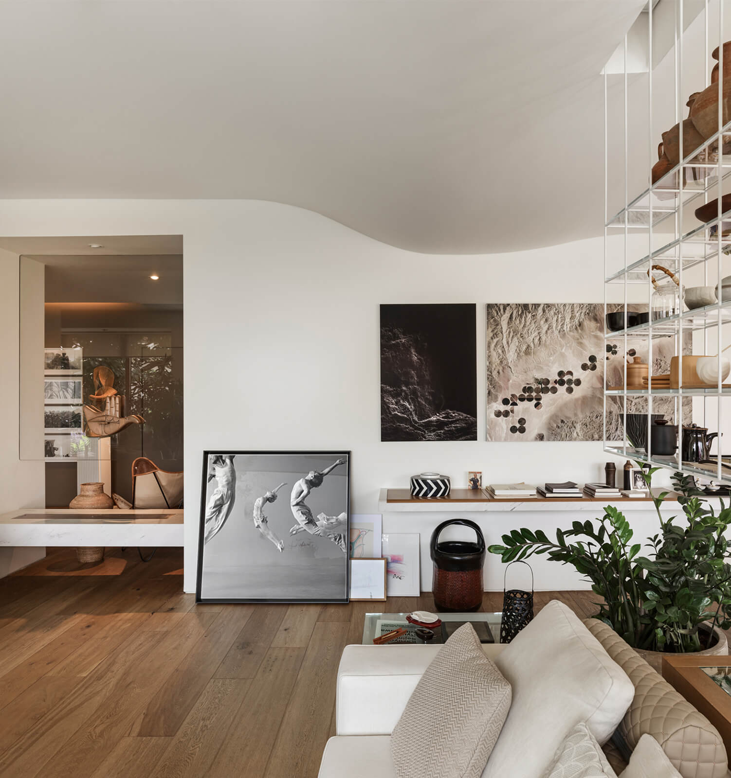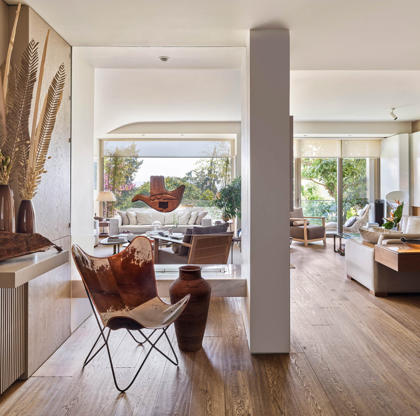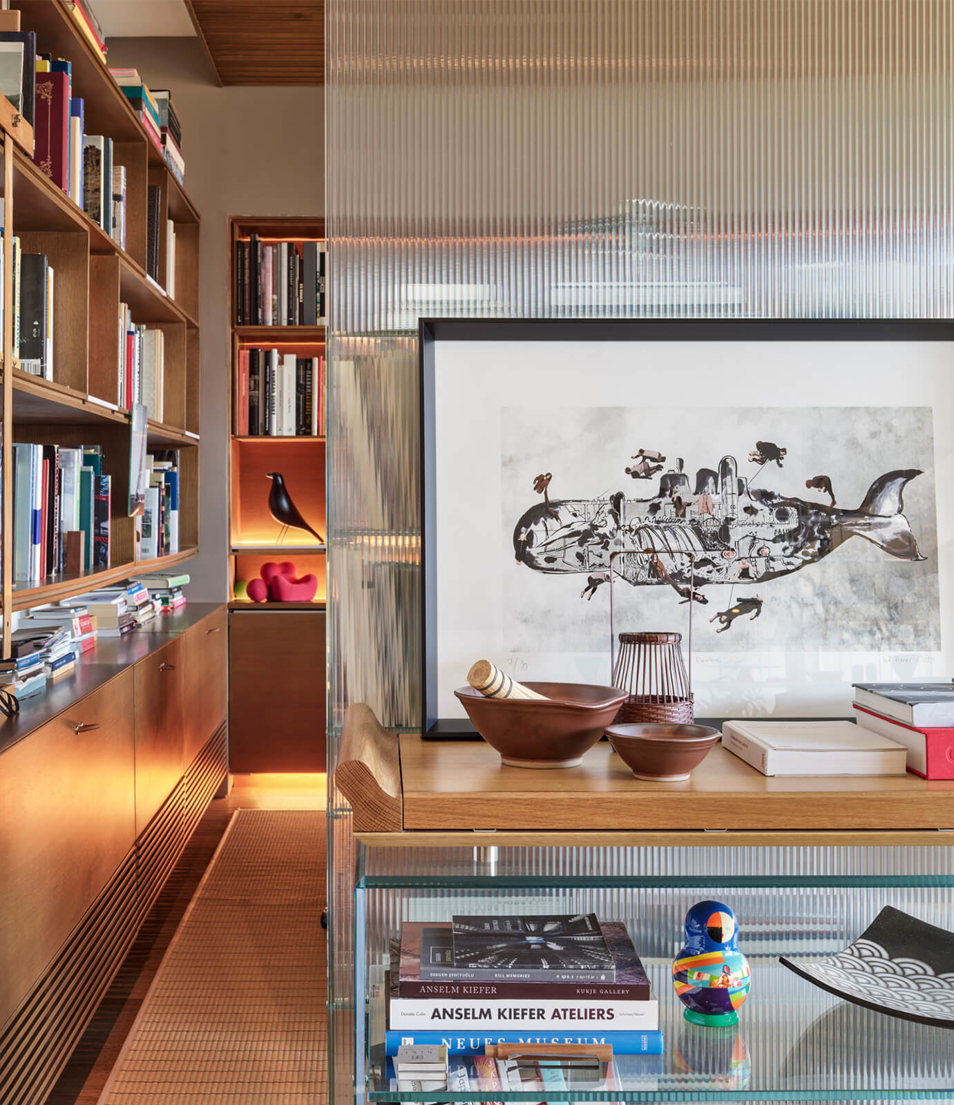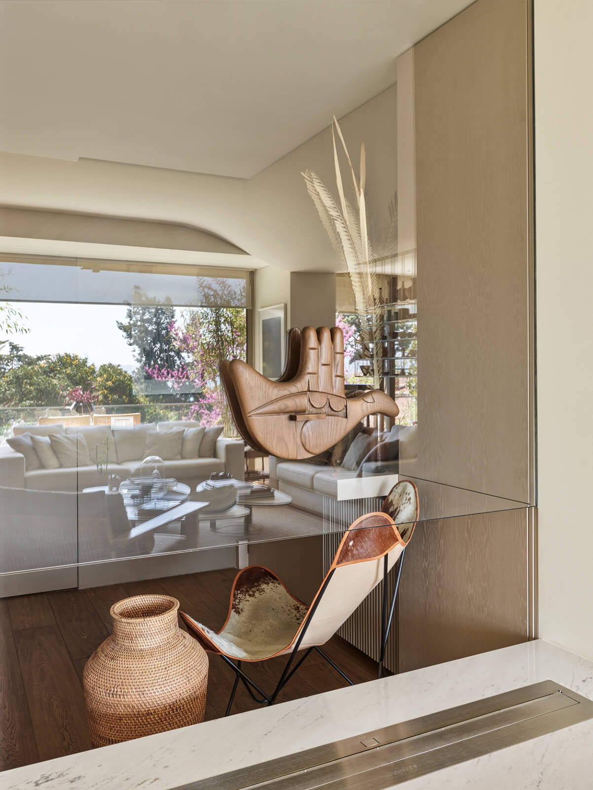 A family home for three, the architect’s own apartment provides a large and elongated living room, subtly divided by permeable separators to create a harmonious and calm common area for the family, allowing its members to spend time individually in the same space. These subtle dividers vary in color, material and form; some also function as display units or shelving, a design aspect commonly used in KM interiors. The curvilinear plaster ceiling adds distinct character, punctuates the harmony and continuity of the space while aptly concealing the beam across the ceiling. The front of the apartment is a 30 meters long fully glass façade that opens on to a 30 meters long terrace which looks out to an old green garden with typical Istanbul trees and plants through which one can get occasional glimpses of the Bosphorus.
