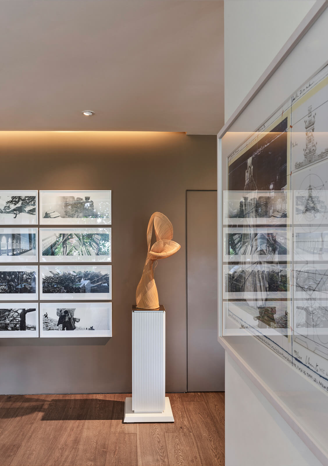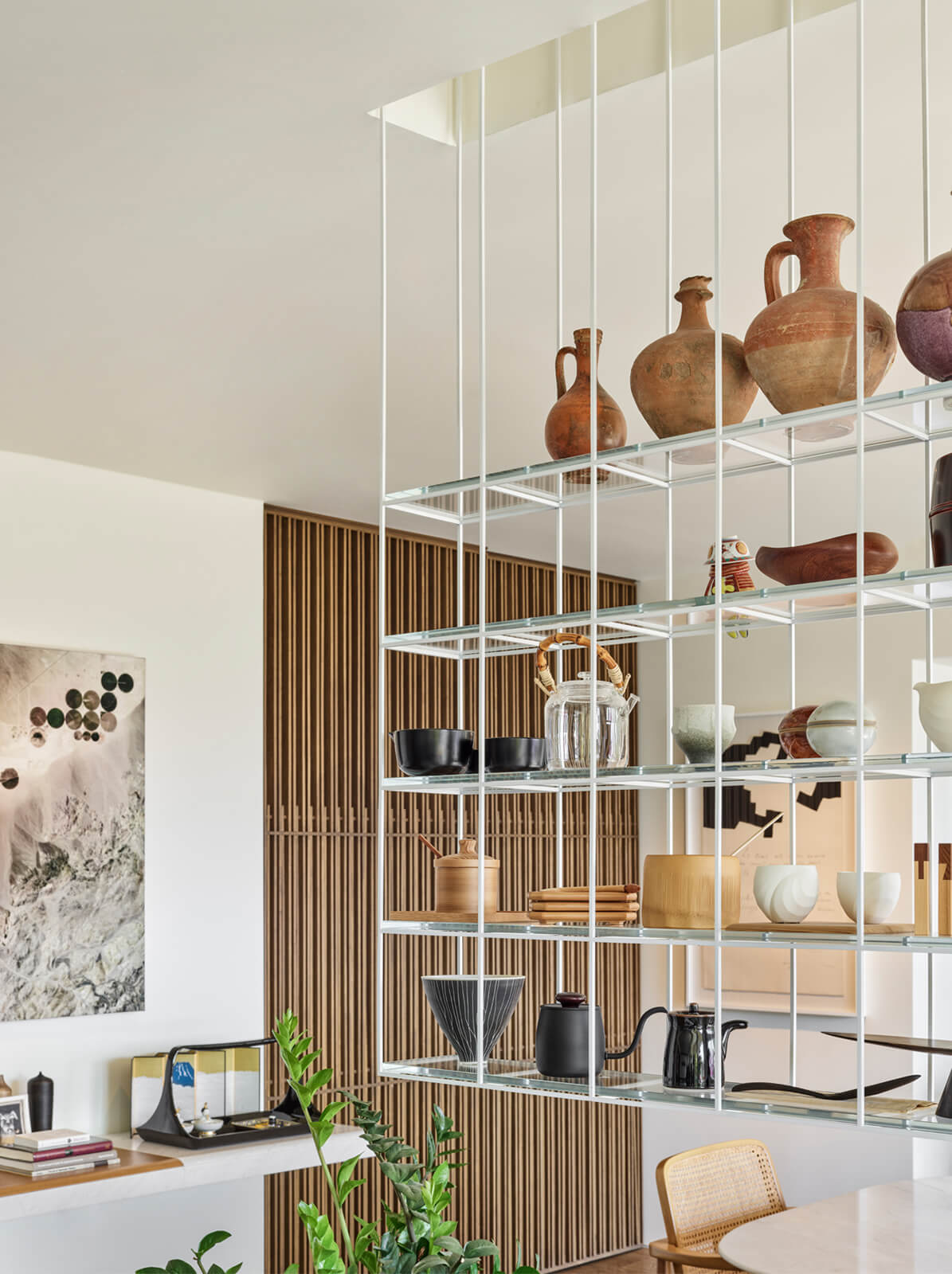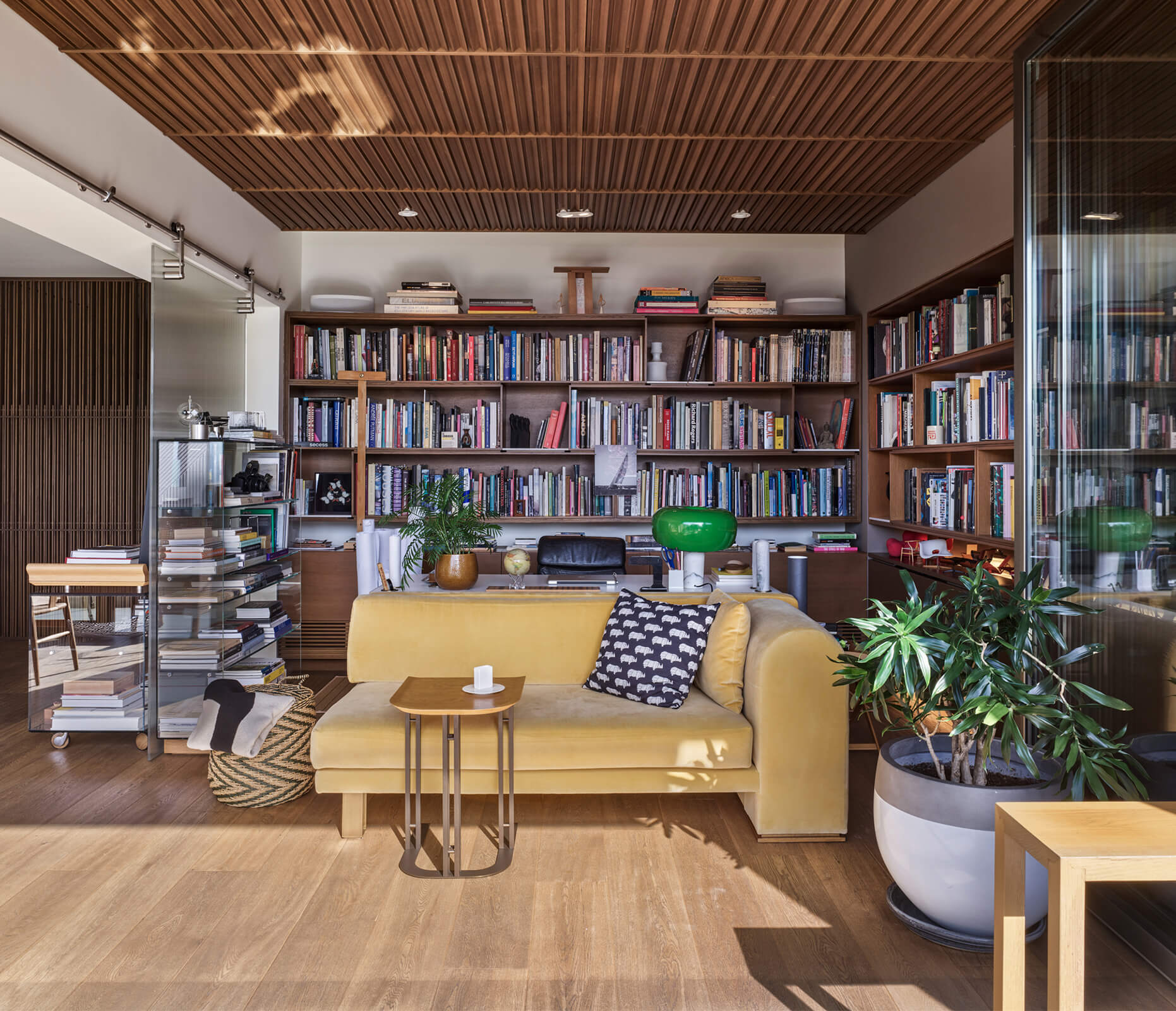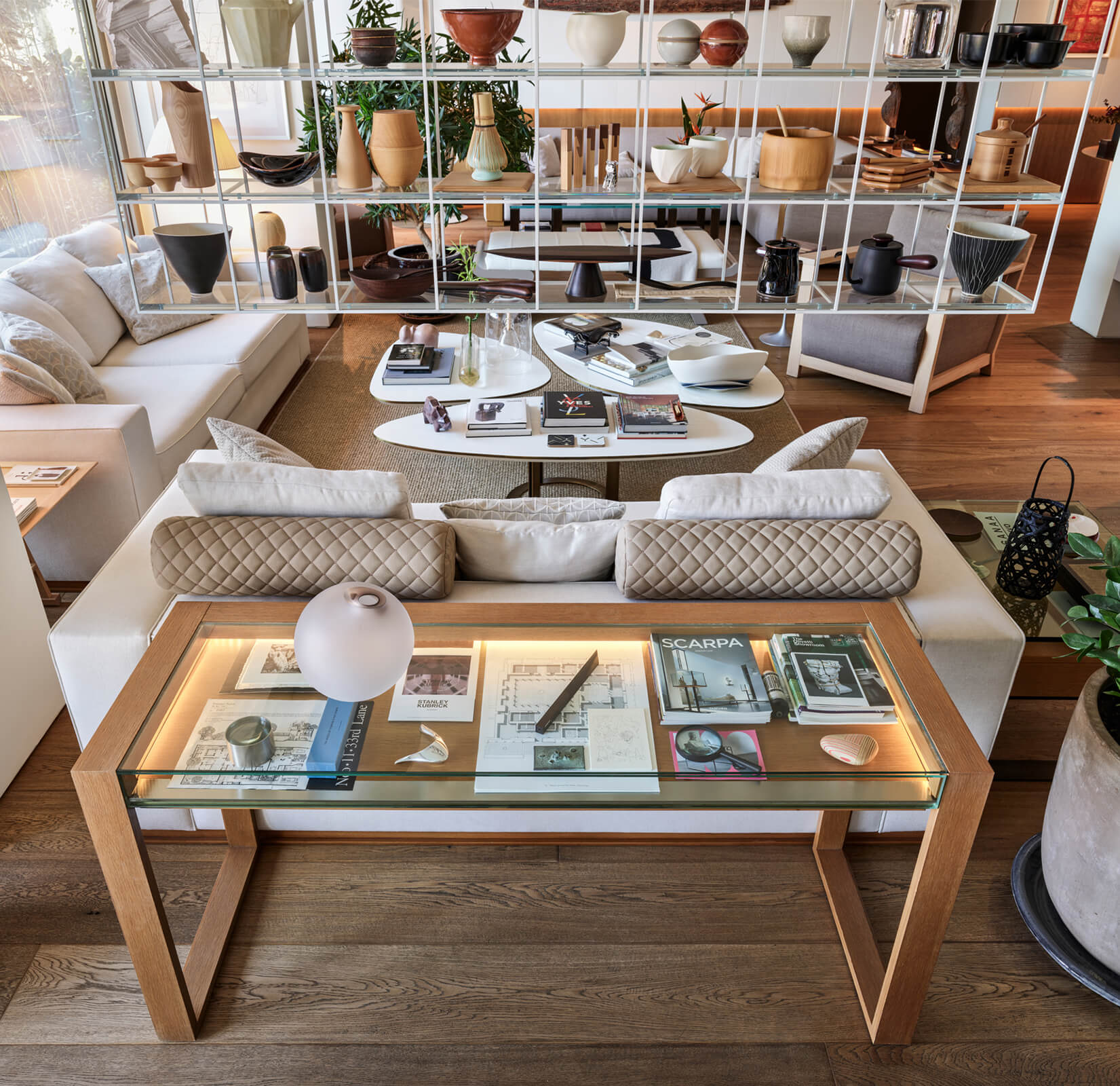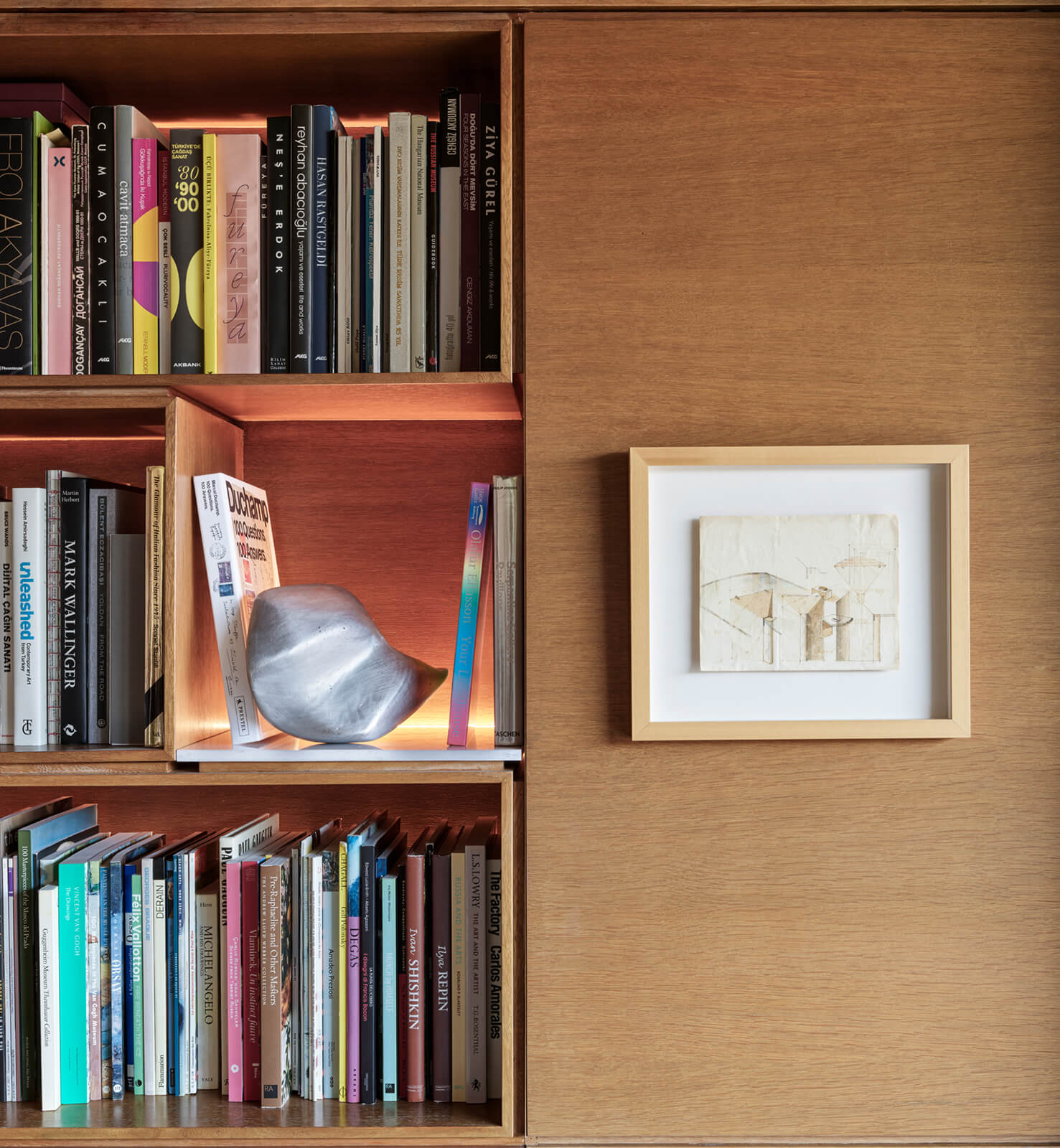 A family home for three, the architect’s own apartment provides a large and elongated living room, subtly divided by permeable separators to create a harmonious and calm common area for the family, allowing its members to spend time individually in the same space. These subtle dividers vary in color, material and form; some also function as display units or shelving, a design aspect commonly used in KM interiors. The curvilinear plaster ceiling adds distinct character, punctuates the harmony and continuity of the space while aptly concealing the beam across the ceiling. The front of the apartment is a 30 meters long fully glass façade that opens on to a 30 meters long terrace which looks out to an old green garden with typical Istanbul trees and plants through which one can get occasional glimpses of the Bosphorus.