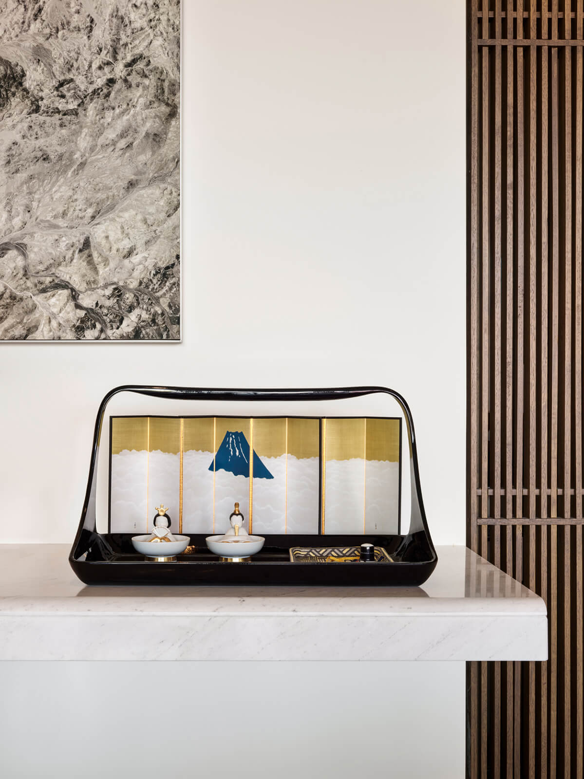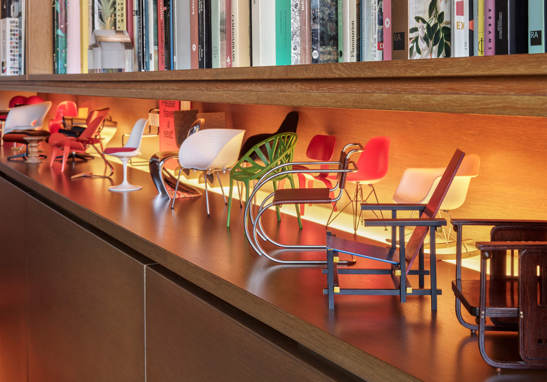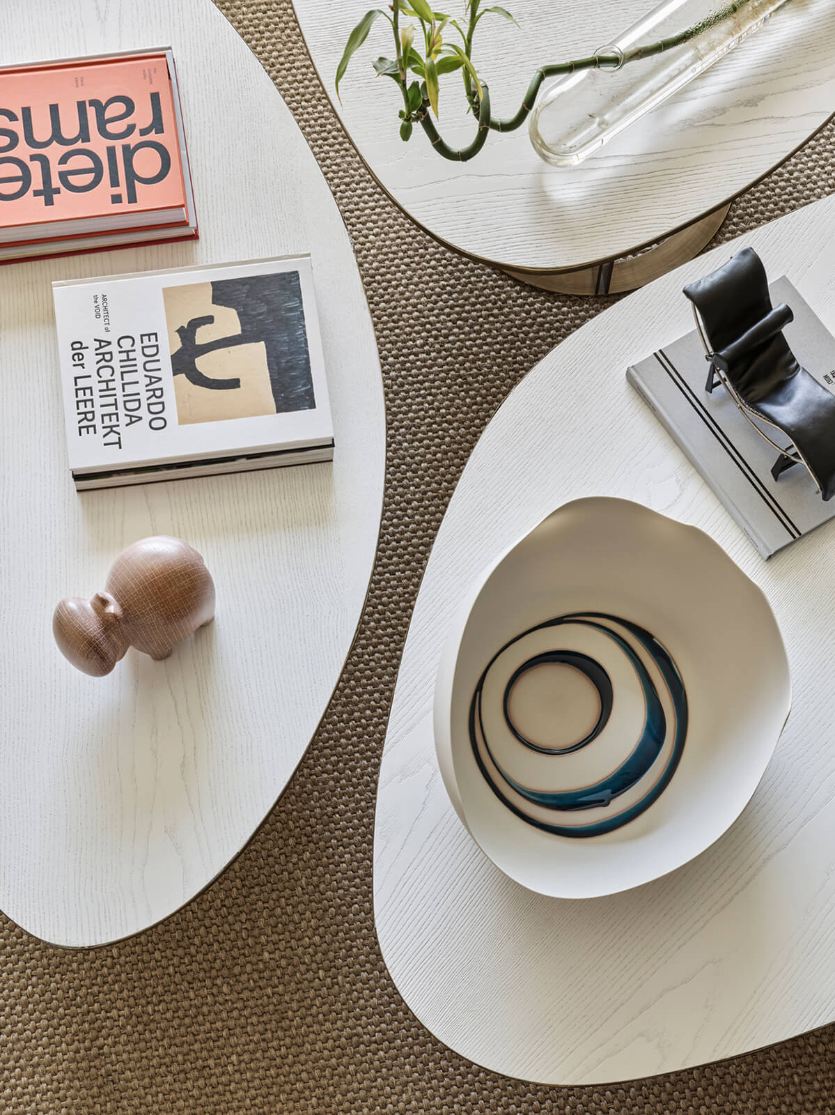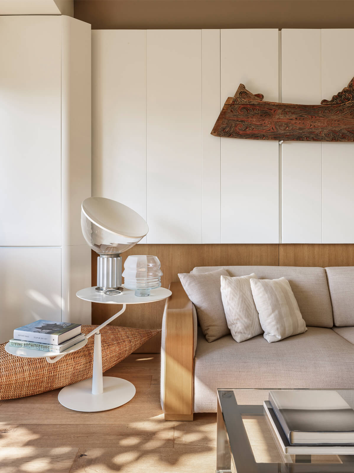 A family home for three, the architect’s own apartment provides a large and elongated living room, subtly divided by permeable separators to create a harmonious and calm common area for the family, allowing its members to spend time individually in the same space. These subtle dividers vary in color, material and form; some also function as display units or shelving, a design aspect commonly used in KM interiors. The curvilinear plaster ceiling adds distinct character, punctuates the harmony and continuity of the space while aptly concealing the beam across the ceiling. The front of the apartment is a 30 meters long fully glass façade that opens on to a 30 meters long terrace which looks out to an old green garden with typical Istanbul trees and plants through which one can get occasional glimpses of the Bosphorus.