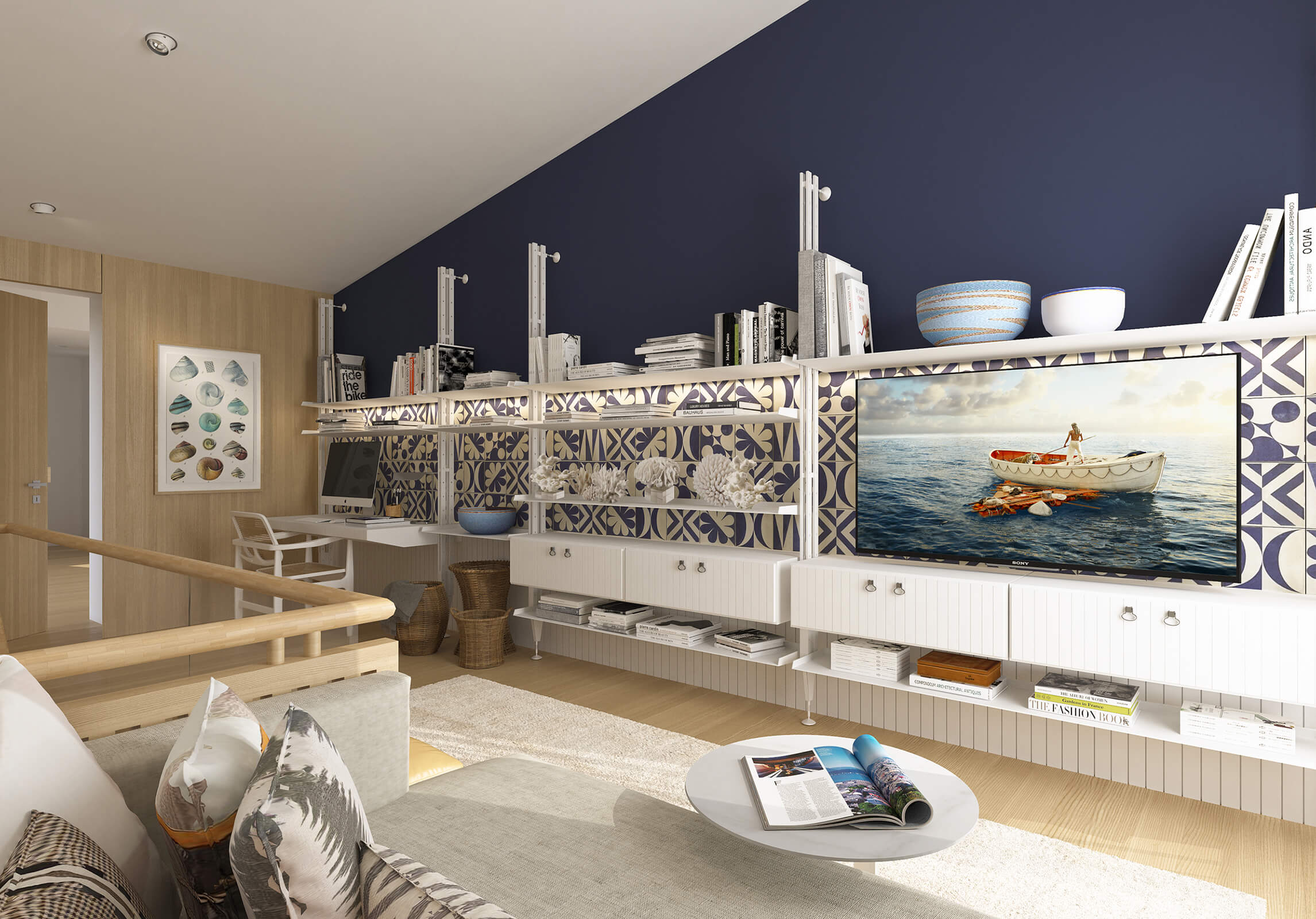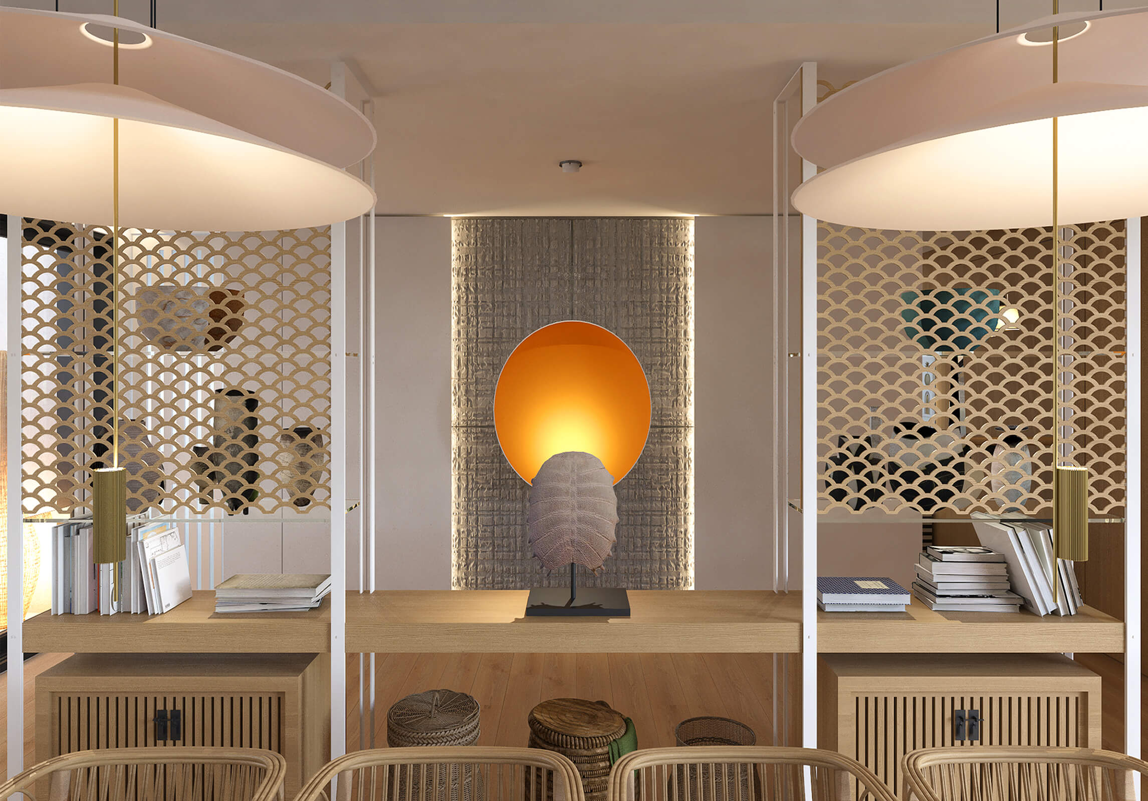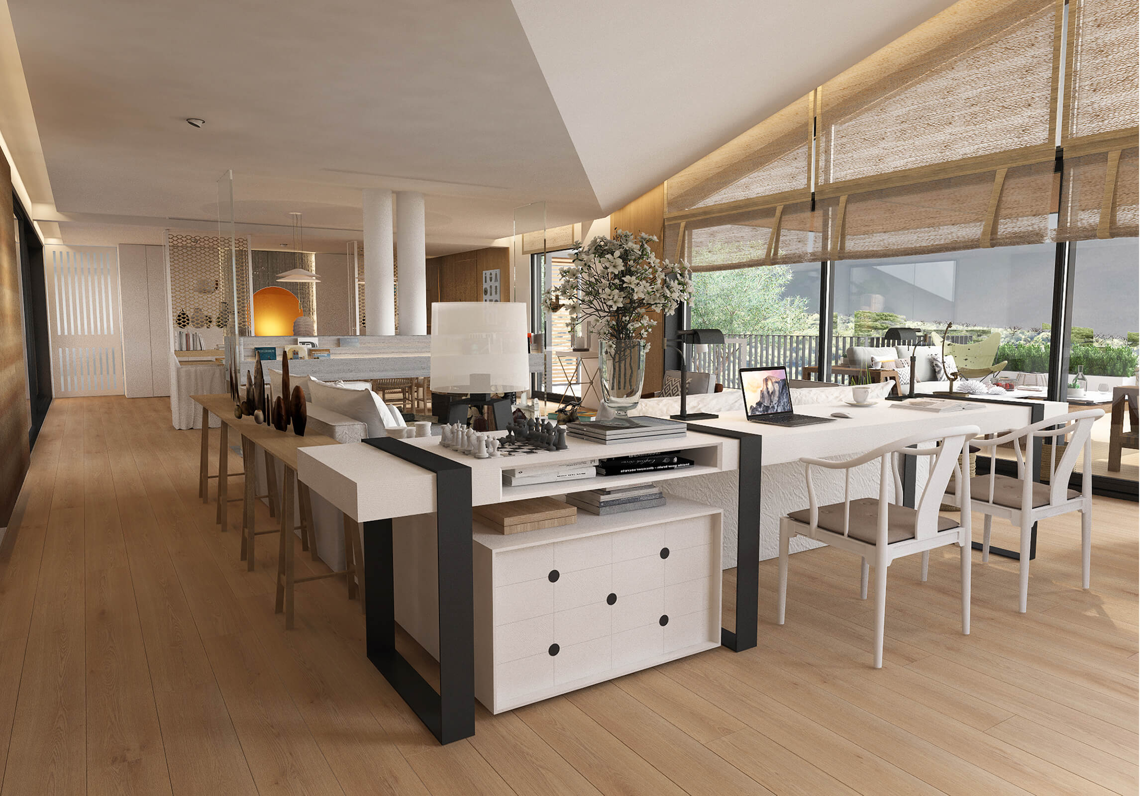 Located on the legendary Aegean coast across from Bodrum, this two storey contemporary villa dissolves seamlessly into the surrounding environment designed by architect Carlos Ferrater. A soft palette of whites and beiges and patterned upholstery exude the airy charm of a Mediterranean vacation home. The monumental fireplace in the center of the living area, with horizontal serpeggiante marble slabs standing on clear glass pillars, instantly adds unique character and subtle contrast to the space. Equipped with a garden and swimming pool, the family house also contains a small patio filled with vegetation and a decorative pool, offering a secluded and serene experience to its inhabitants, a hideaway from the strong winds of Mandalya Bay.