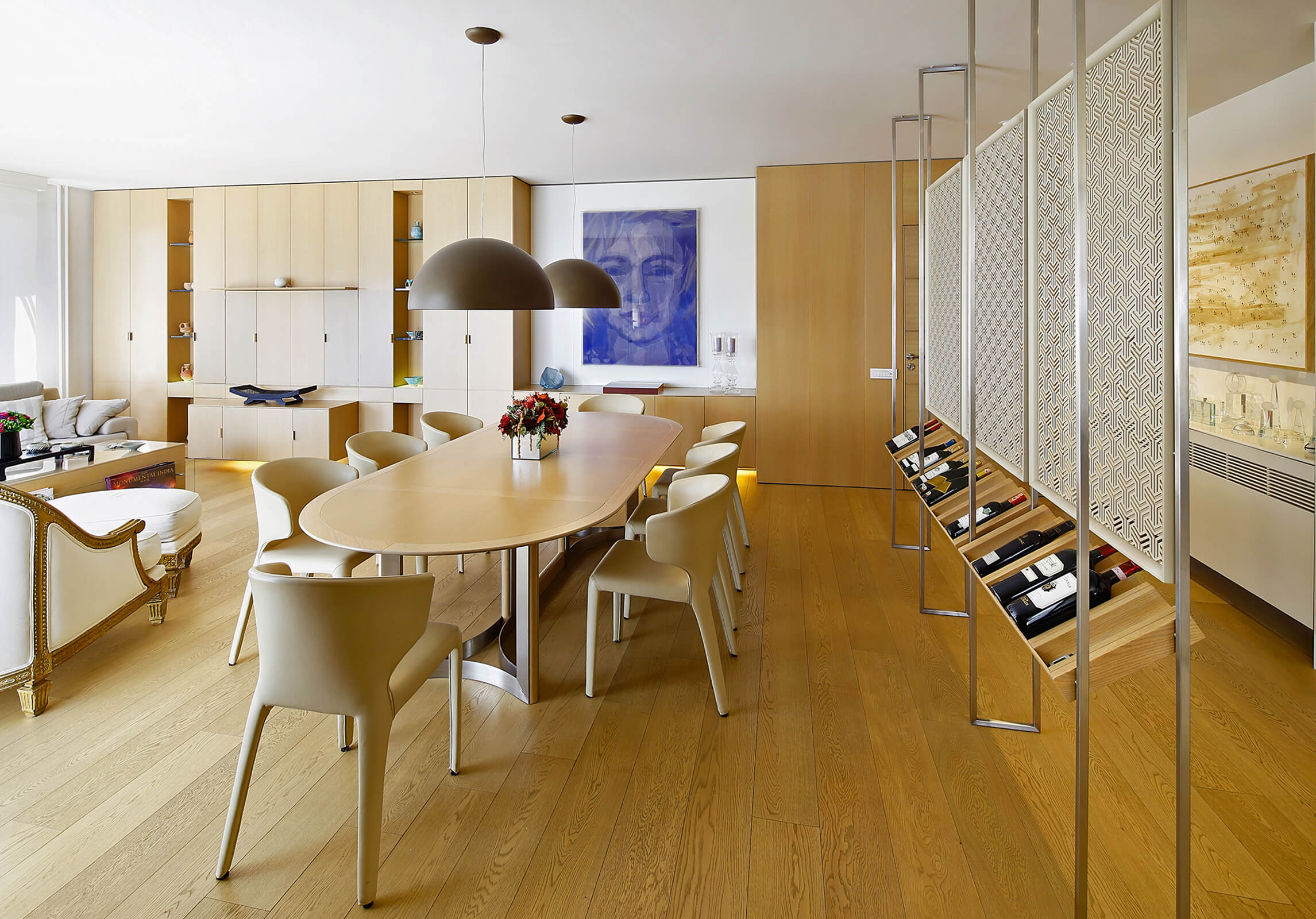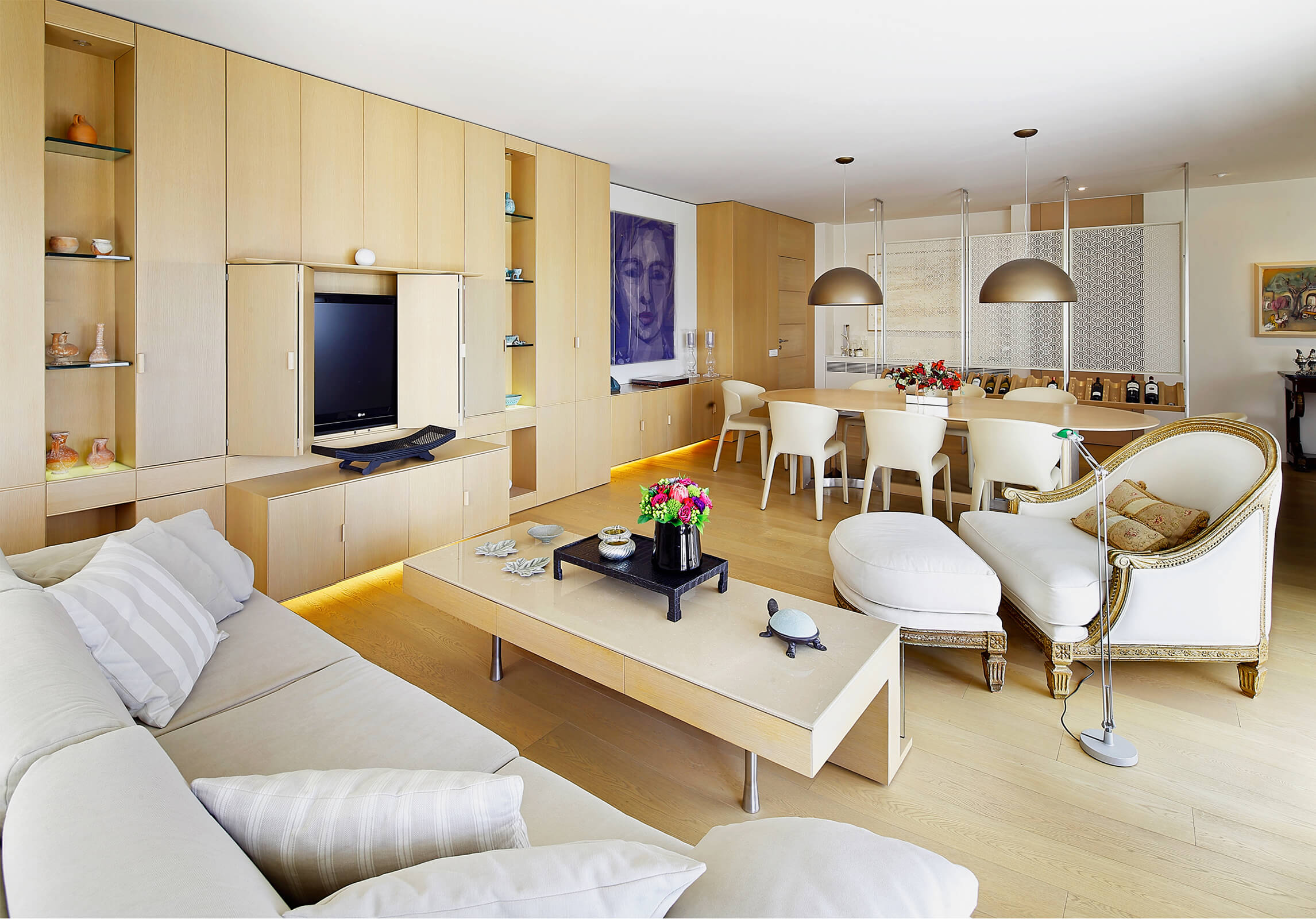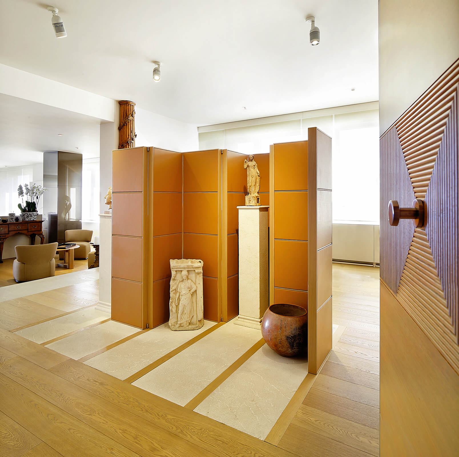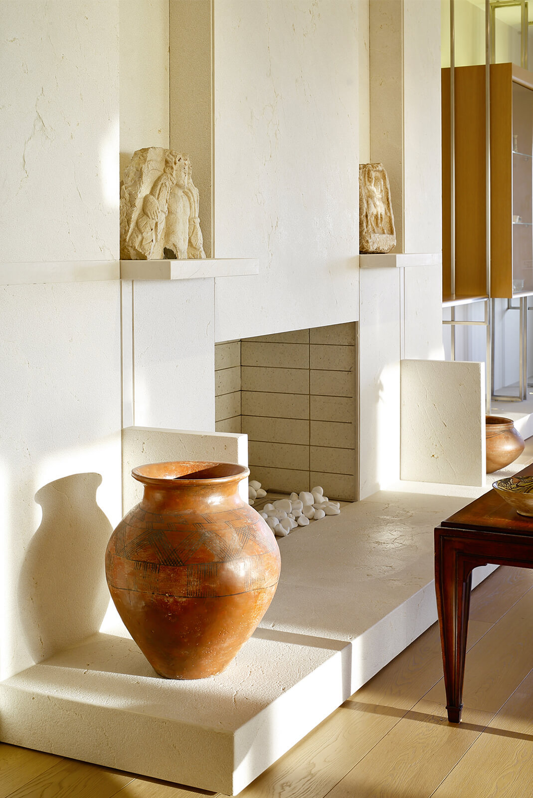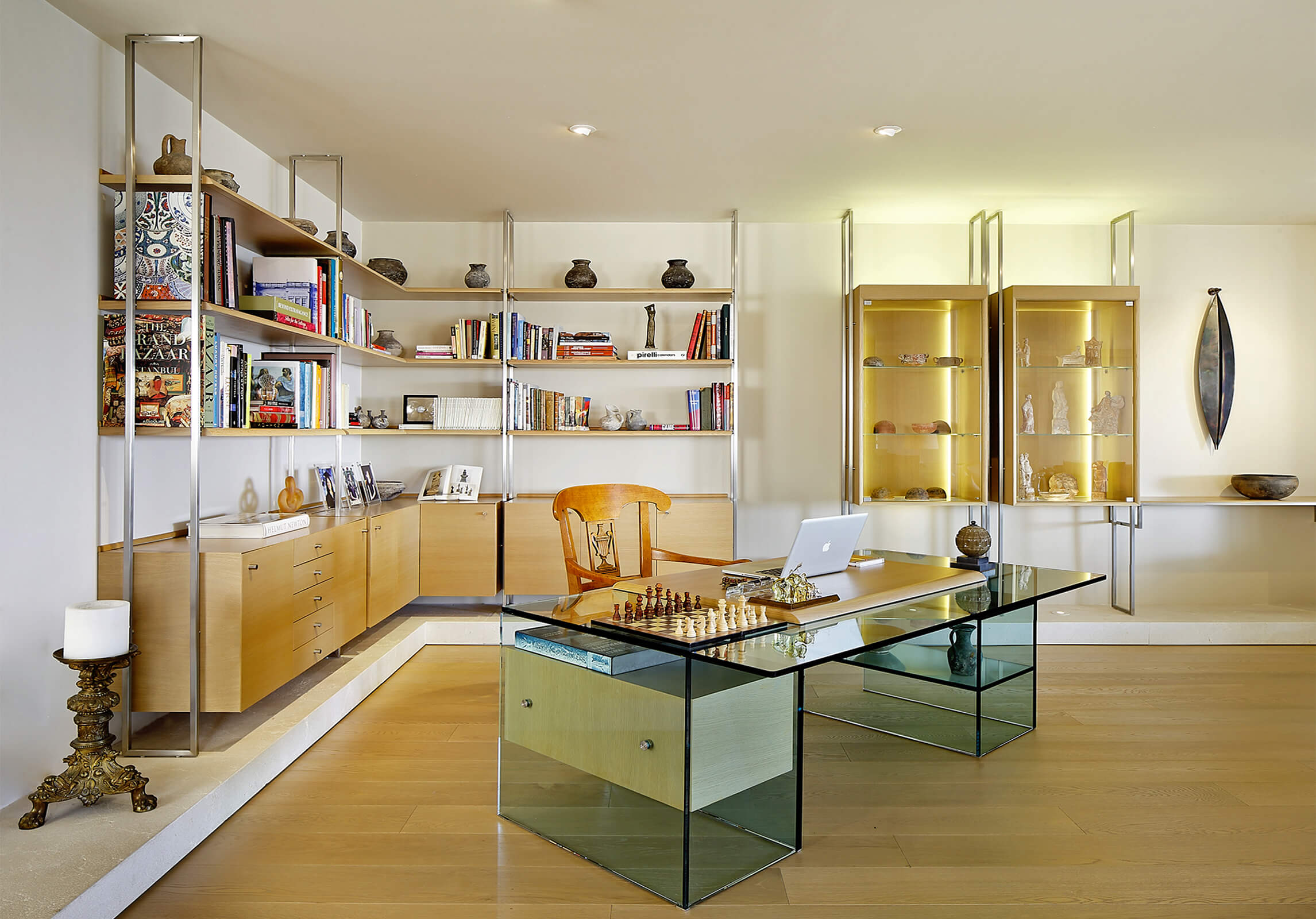 The modern sensibility in design has strived to make our homes airy and spacious places, providing a simple backdrop to our lives. As a style, modern architecture has in many instances been a restrictive approach, where only certain designs can be used. Since its beginnings, KM has tried to humanize modern design to where it serves its users and inhabitants and not the other way around. In this interior design project, KM sought to synthesize the functional aspects of the modern with classical features possessing a timeless quality. These designs are highlighted by the placement of handmade furniture in natural tones produced by local craftsmen, matched and mixed with pieces of sleek modern furniture. Stone and wood are used liberally to bring an organic feeling to the domestic interior complemented by natural sunlight and indirect lighting. The modern and classic are weaved together like a tapestry that holds the natural energy of the space together. The focal point of the home is surprisingly the large entrance where a grand piano resides in all its splendor.