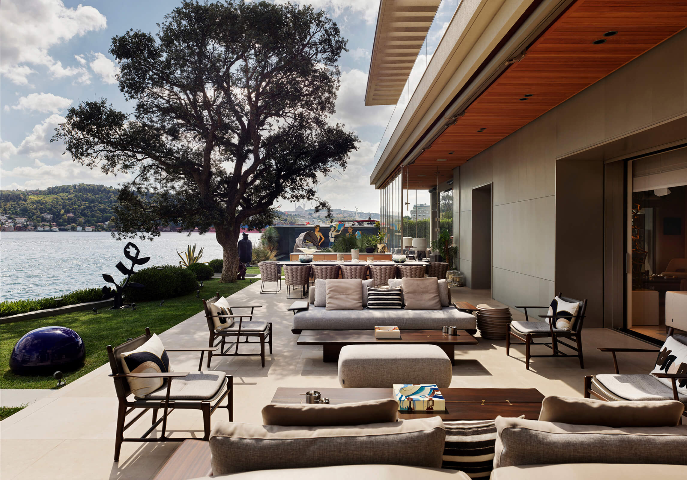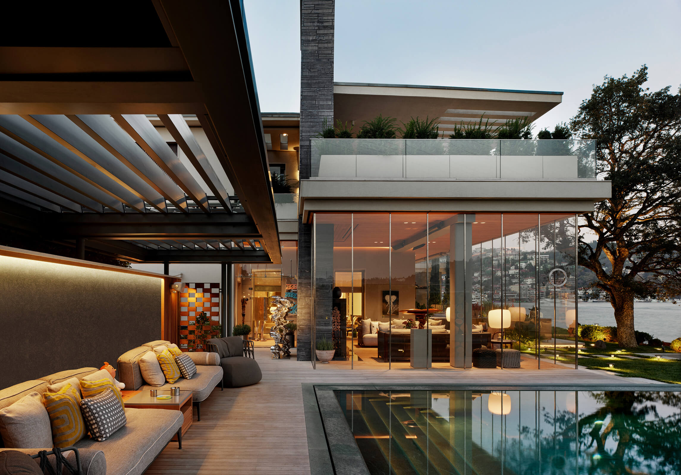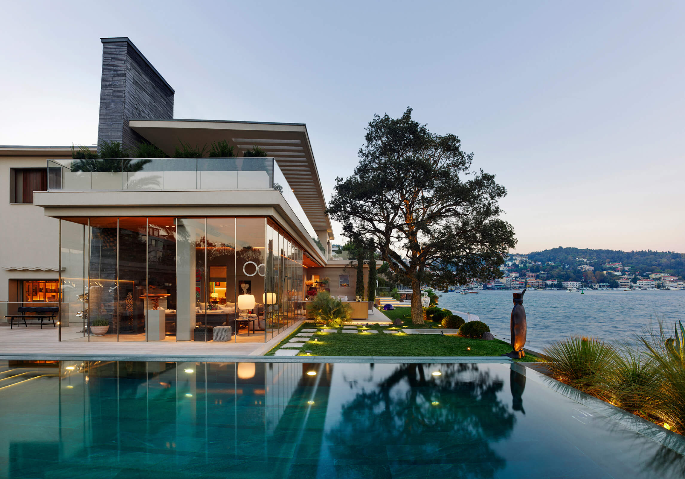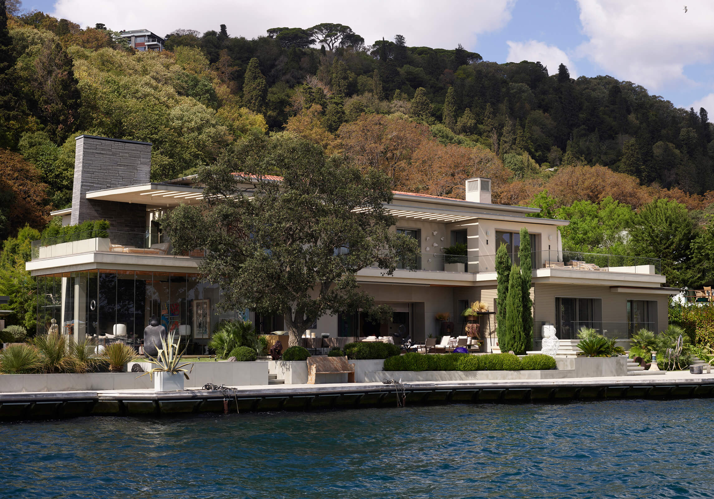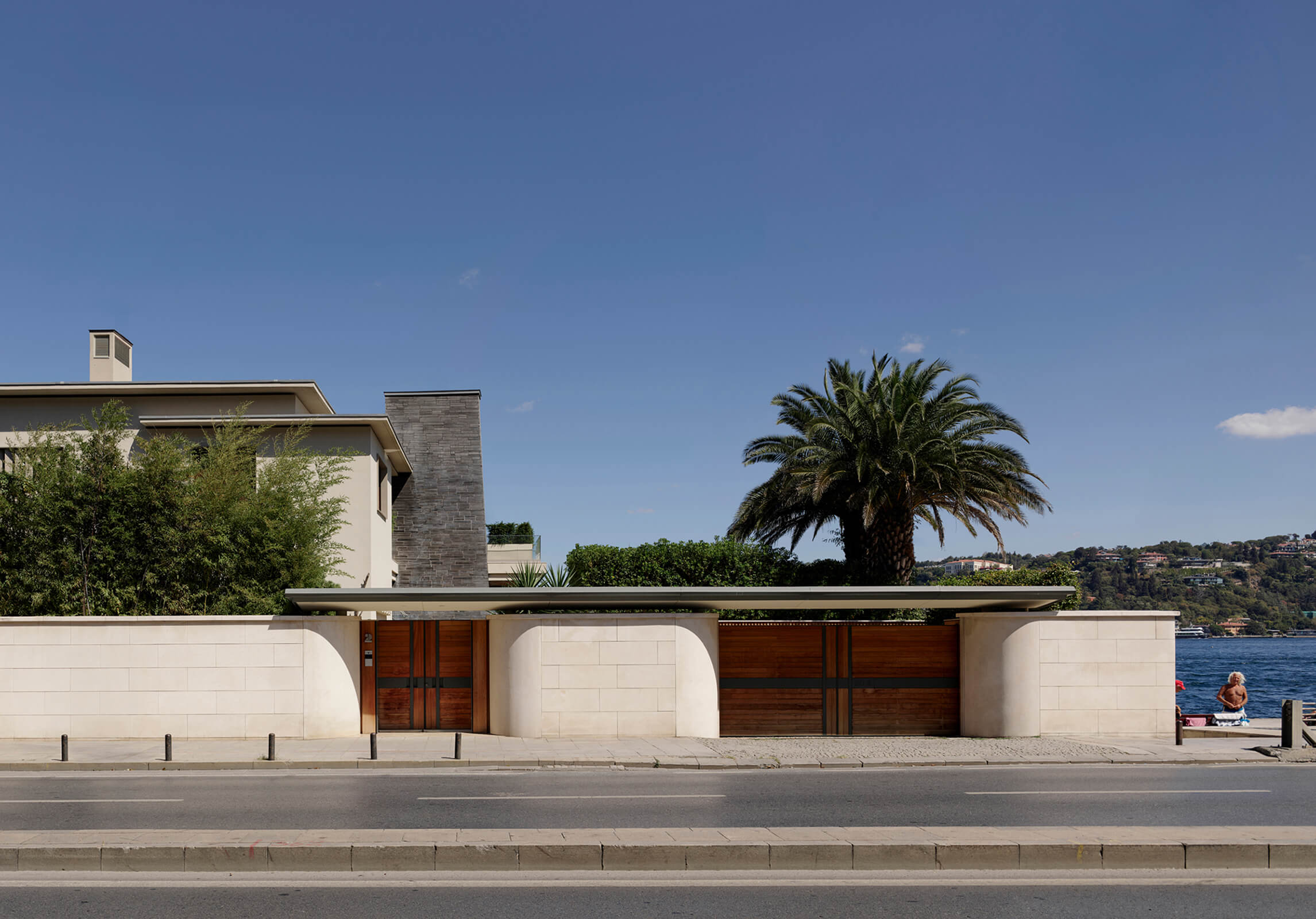 This waterfront mansion or "yali” in the bay of Bebek on the Bosphorus, was designed in the late 1950's by Kadri Eroğan, an important Turkish modernist architect. Eroğan was in the USA in the 1940s where he worked under Richard Neutra. He later proceeded to complete many iconic projects in Turkey, the most famous of which is the Grand Tarabya Hotel in Istanbul. A champion of modern architecture, his approach was on the universal side of modernism yet was known for the attention he devoted to the real needs of his clients without imposing artistic vision. As seen in this project; horizontal settlements, wide terraces on different levels, large window openings, stone cladding, elegant reinforced concrete elements are characteristic to his designs.
