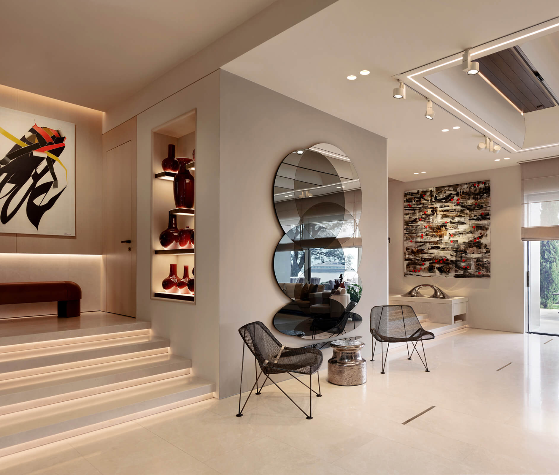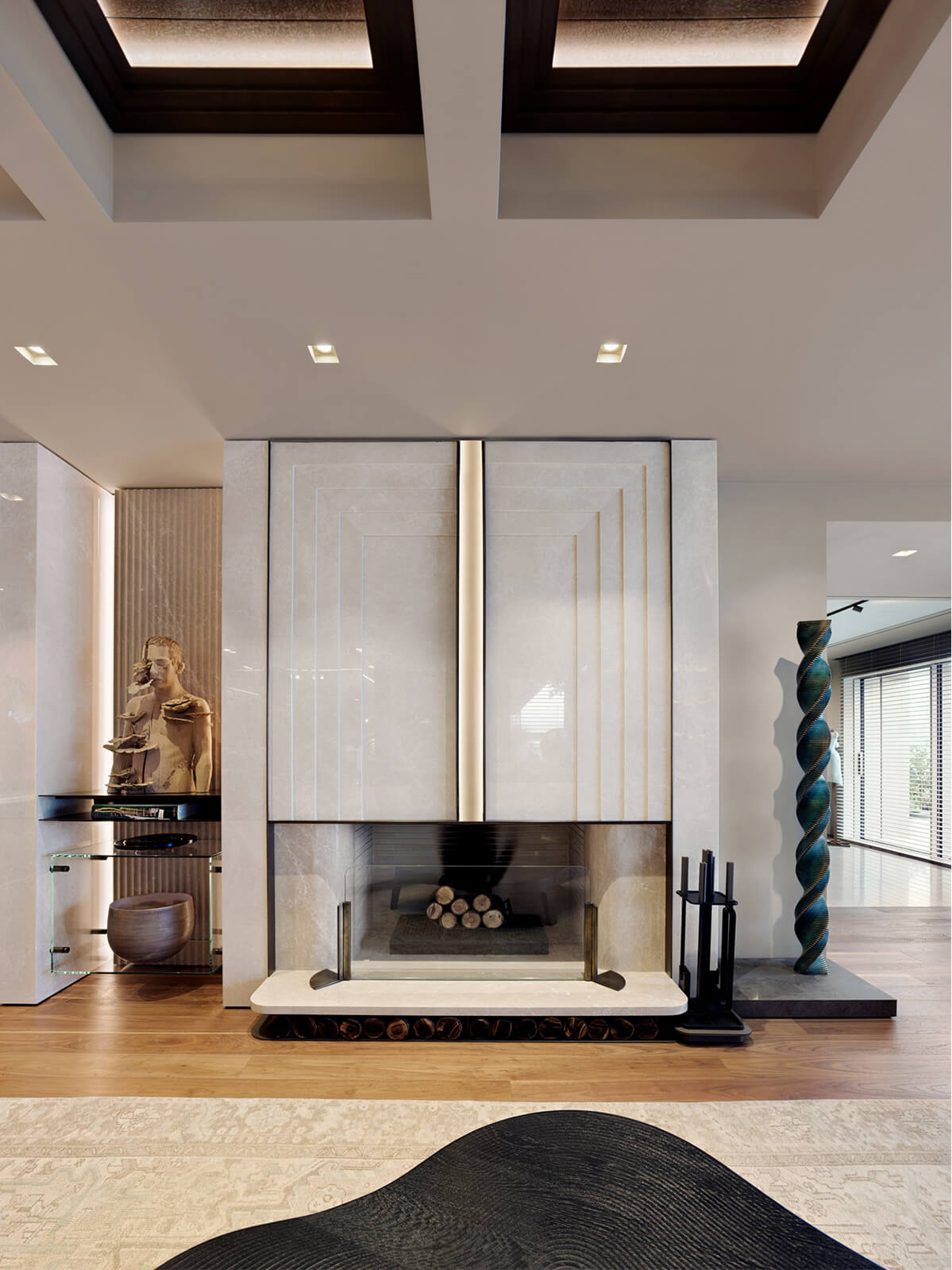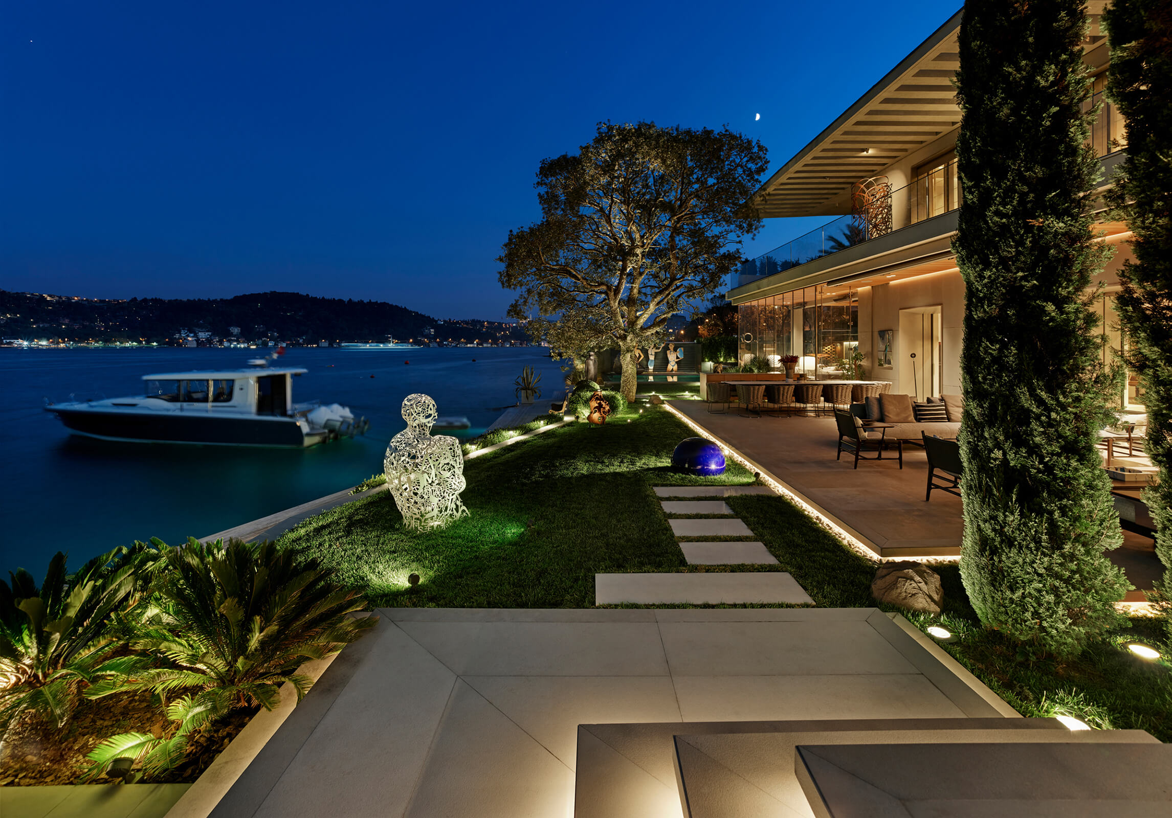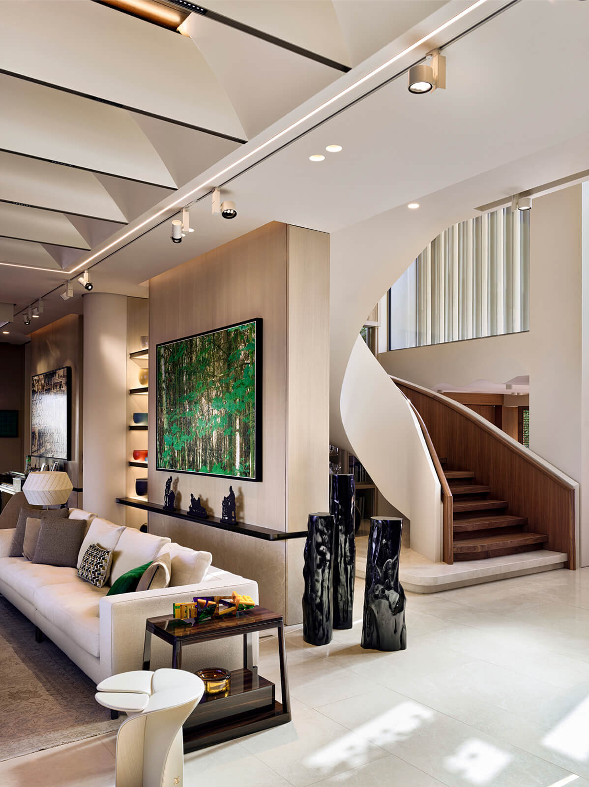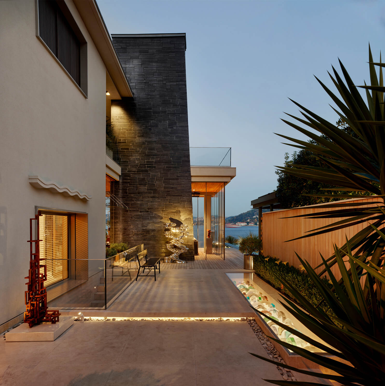 KM, respectful of this architectural heritage, conserved these characteristics and made small interventions on the exterior. The surroundings were enriched with landscaping, the dock and the swimming pool were fully redone and the interior was completely renovated and refurbished in a contemporary manner. Upon entering the house, a sculptural spiral staircase, the spinal cord of the house, sets the tone straight away. The stained walnut steps and panels with embedded hand railing are in contrast with the white stucco outer shell and make a strong presence winding up through the space. Opposite, a vertical wall of lined and blasted stone leads the eye up, producing an enhanced height effect. A new window was opened to let in more daylight, a controlled amount via custom made vertical aluminum slats for shading. This elaborate approach is maintained throughout the house, whether on the ceilings, floors, stone clad walls, built-in units and furniture. Predominantly duo toned, dark and light shades with the use of rich materials come together to create a highly refined aesthetic. This style, both modern and elaborate, is the effective display of character in design molded towards the strict requirements of contemporary urban lifestyle.