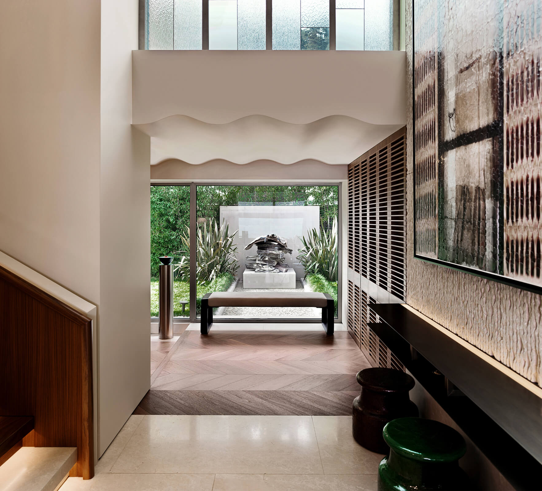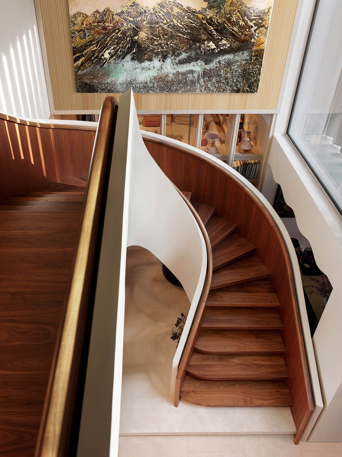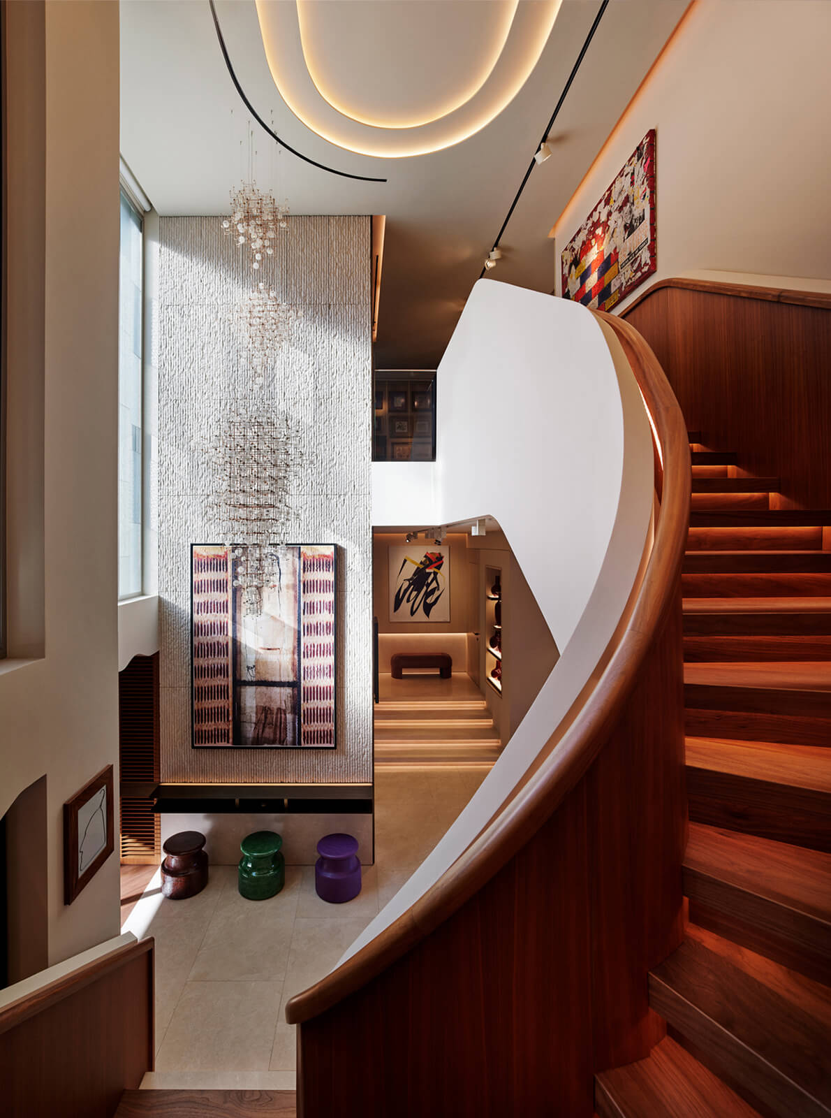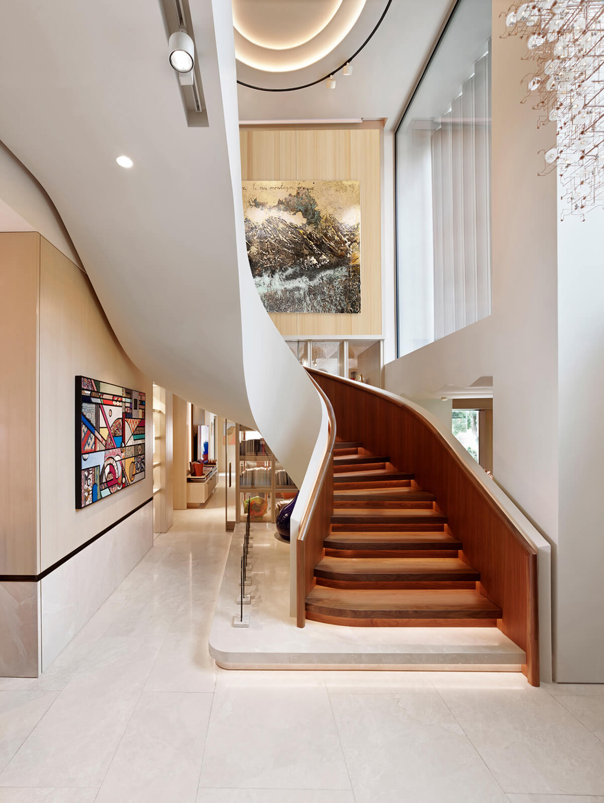 KM, respectful of this architectural heritage, conserved these characteristics and made small interventions on the exterior. The surroundings were enriched with landscaping, the dock and the swimming pool were fully redone and the interior was completely renovated and refurbished in a contemporary manner. Upon entering the house, a sculptural spiral staircase, the spinal cord of the house, sets the tone straight away. The stained walnut steps and panels with embedded hand railing are in contrast with the white stucco outer shell and make a strong presence winding up through the space. Opposite, a vertical wall of lined and blasted stone leads the eye up, producing an enhanced height effect. A new window was opened to let in more daylight, a controlled amount via custom made vertical aluminum slats for shading. This elaborate approach is maintained throughout the house, whether on the ceilings, floors, stone clad walls, built-in units and furniture. Predominantly duo toned, dark and light shades with the use of rich materials come together to create a highly refined aesthetic. This style, both modern and elaborate, is the effective display of character in design molded towards the strict requirements of contemporary urban lifestyle.