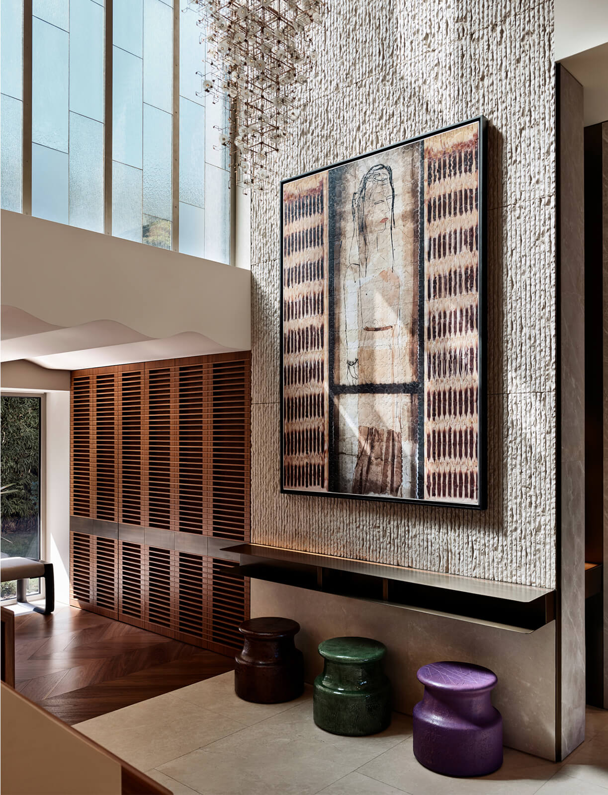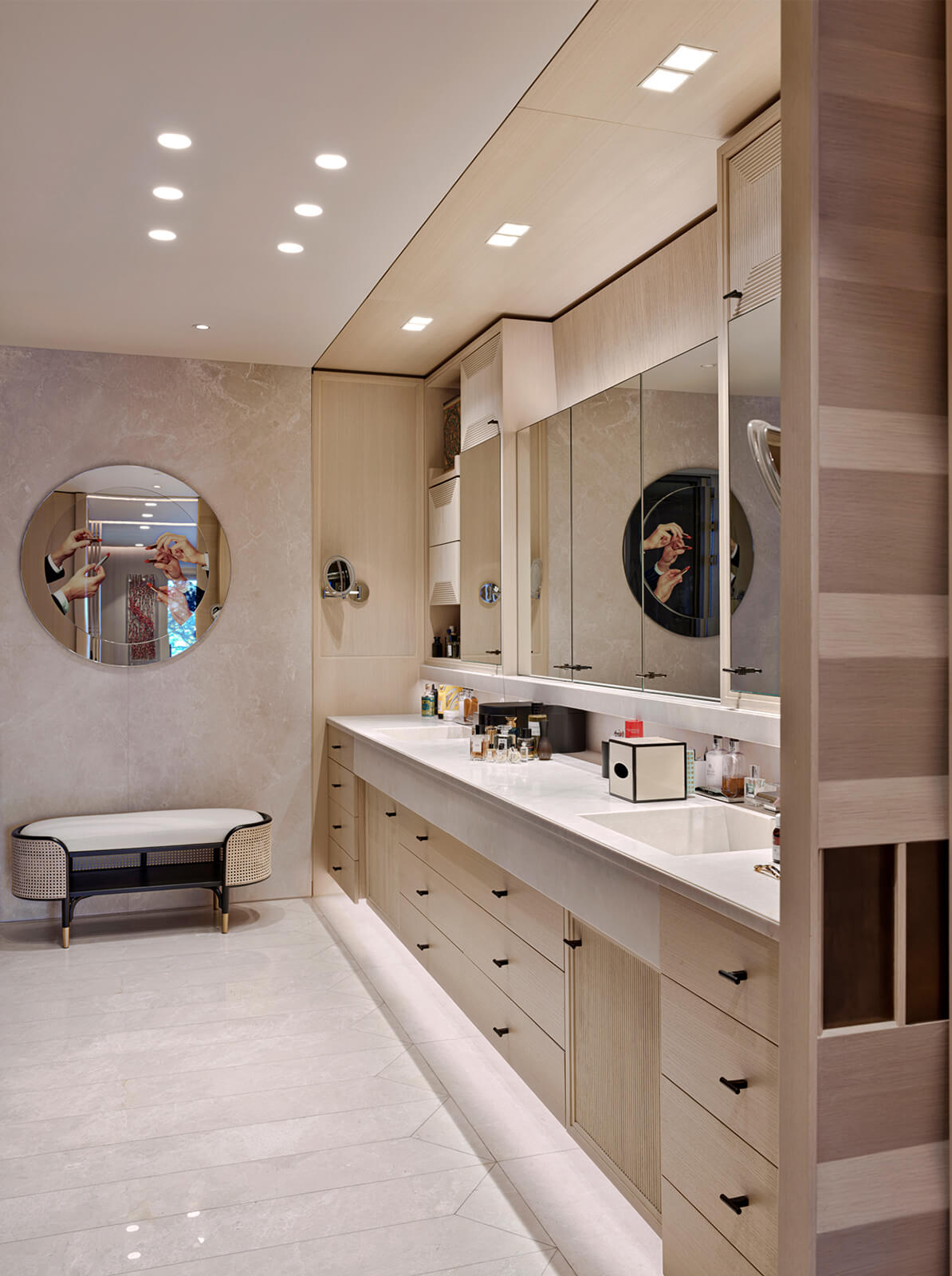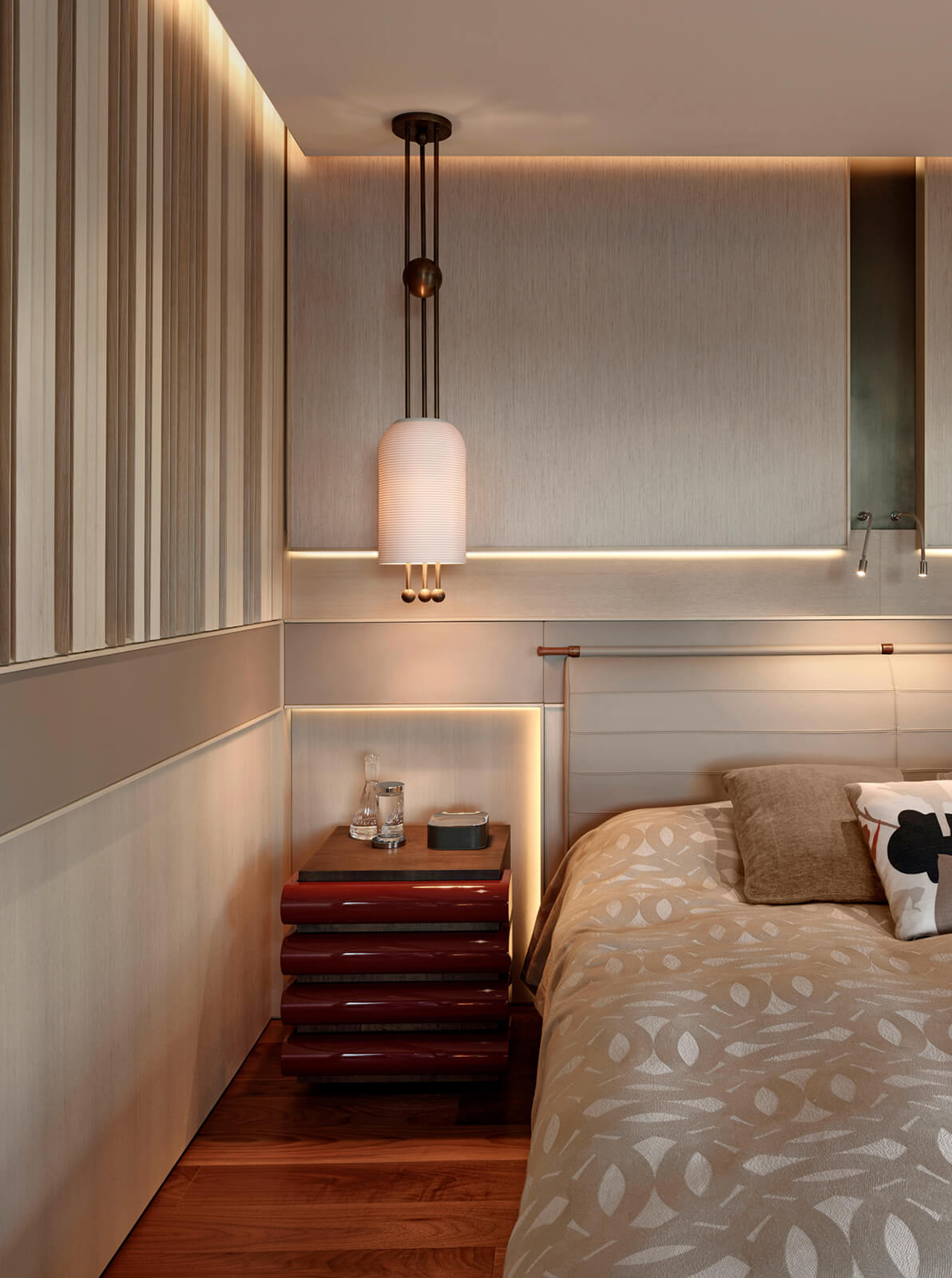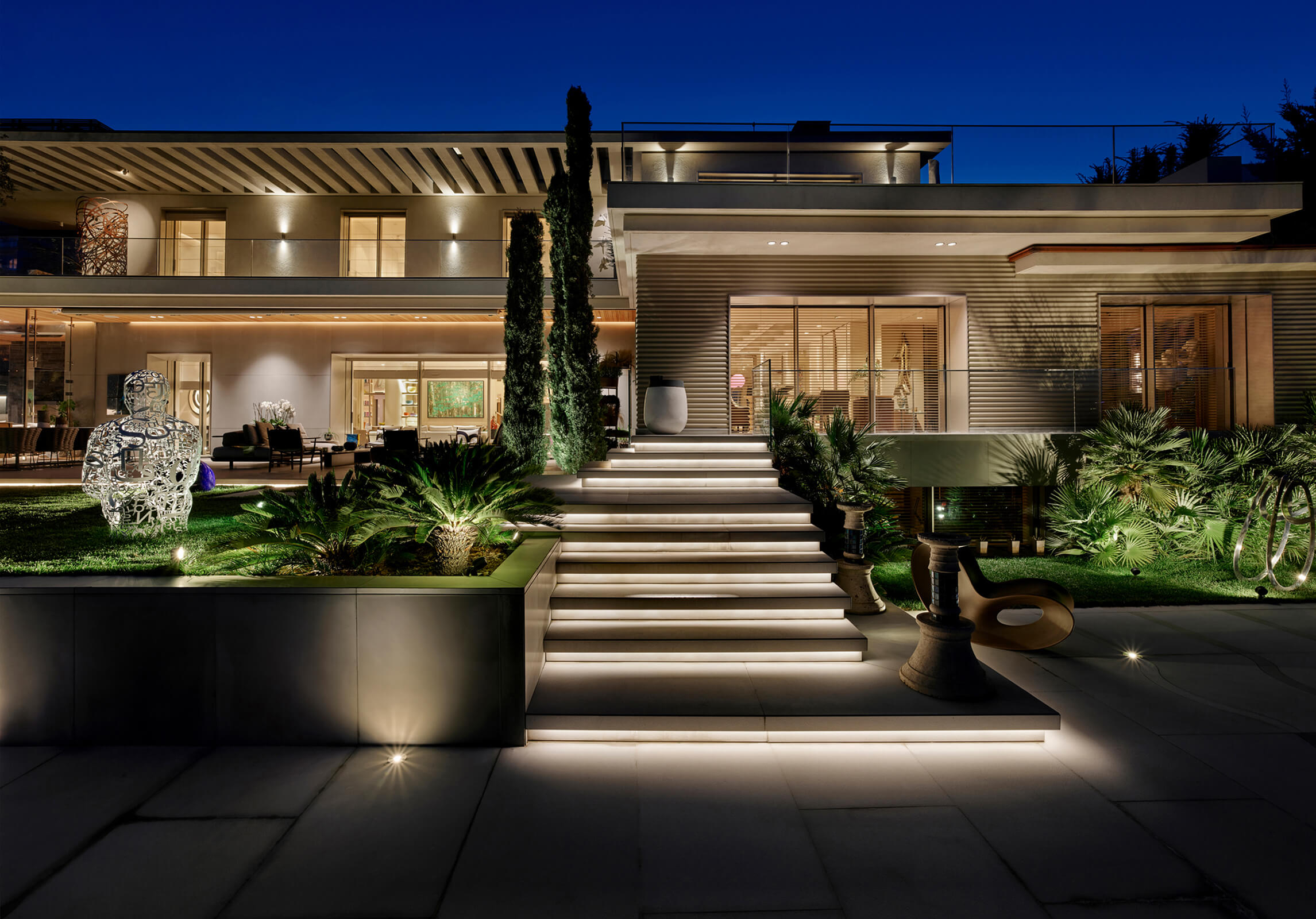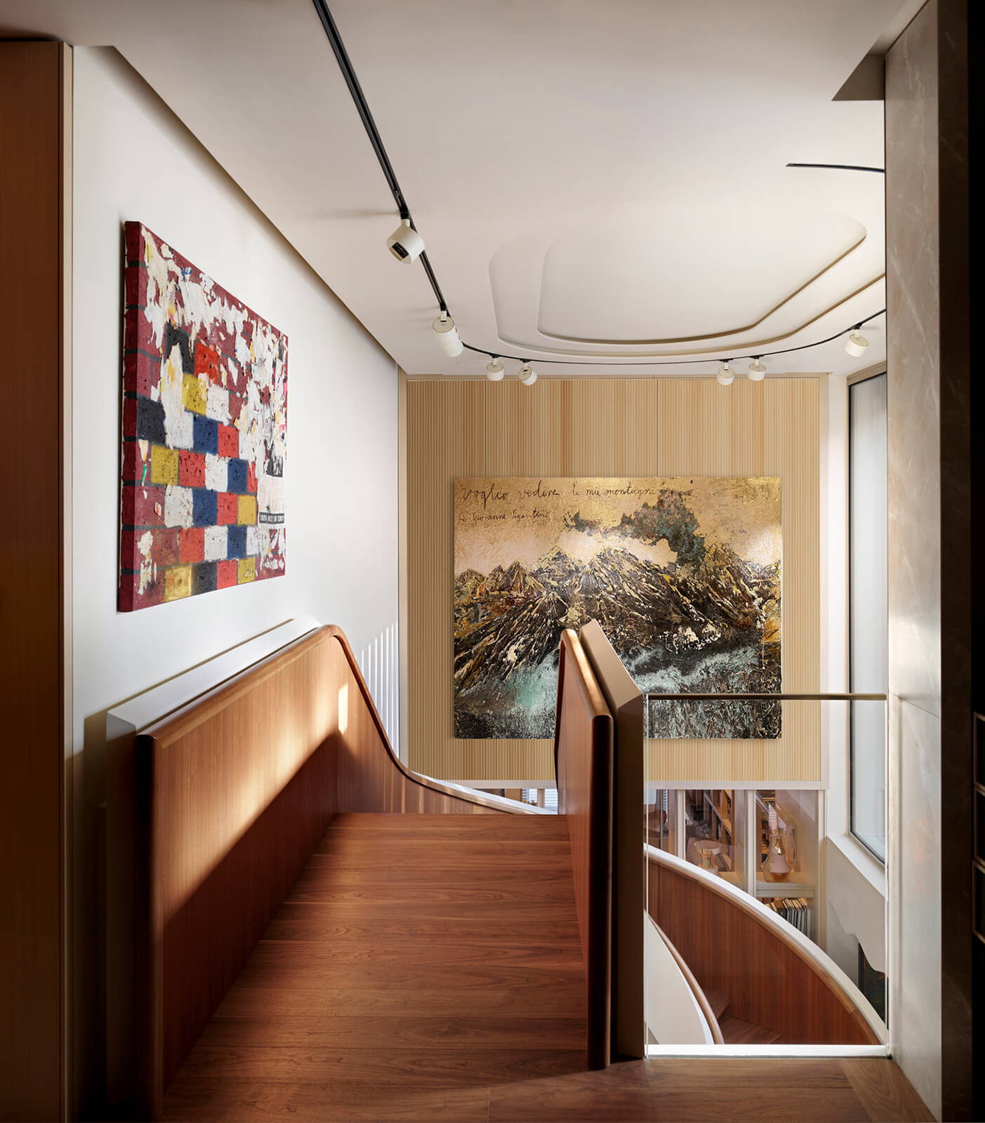 KM, respectful of this architectural heritage, conserved these characteristics and made small interventions on the exterior. The surroundings were enriched with landscaping, the dock and the swimming pool were fully redone and the interior was completely renovated and refurbished in a contemporary manner. Upon entering the house, a sculptural spiral staircase, the spinal cord of the house, sets the tone straight away. The stained walnut steps and panels with embedded hand railing are in contrast with the white stucco outer shell and make a strong presence winding up through the space. Opposite, a vertical wall of lined and blasted stone leads the eye up, producing an enhanced height effect. A new window was opened to let in more daylight, a controlled amount via custom made vertical aluminum slats for shading. This elaborate approach is maintained throughout the house, whether on the ceilings, floors, stone clad walls, built-in units and furniture. Predominantly duo toned, dark and light shades with the use of rich materials come together to create a highly refined aesthetic. This style, both modern and elaborate, is the effective display of character in design molded towards the strict requirements of contemporary urban lifestyle.