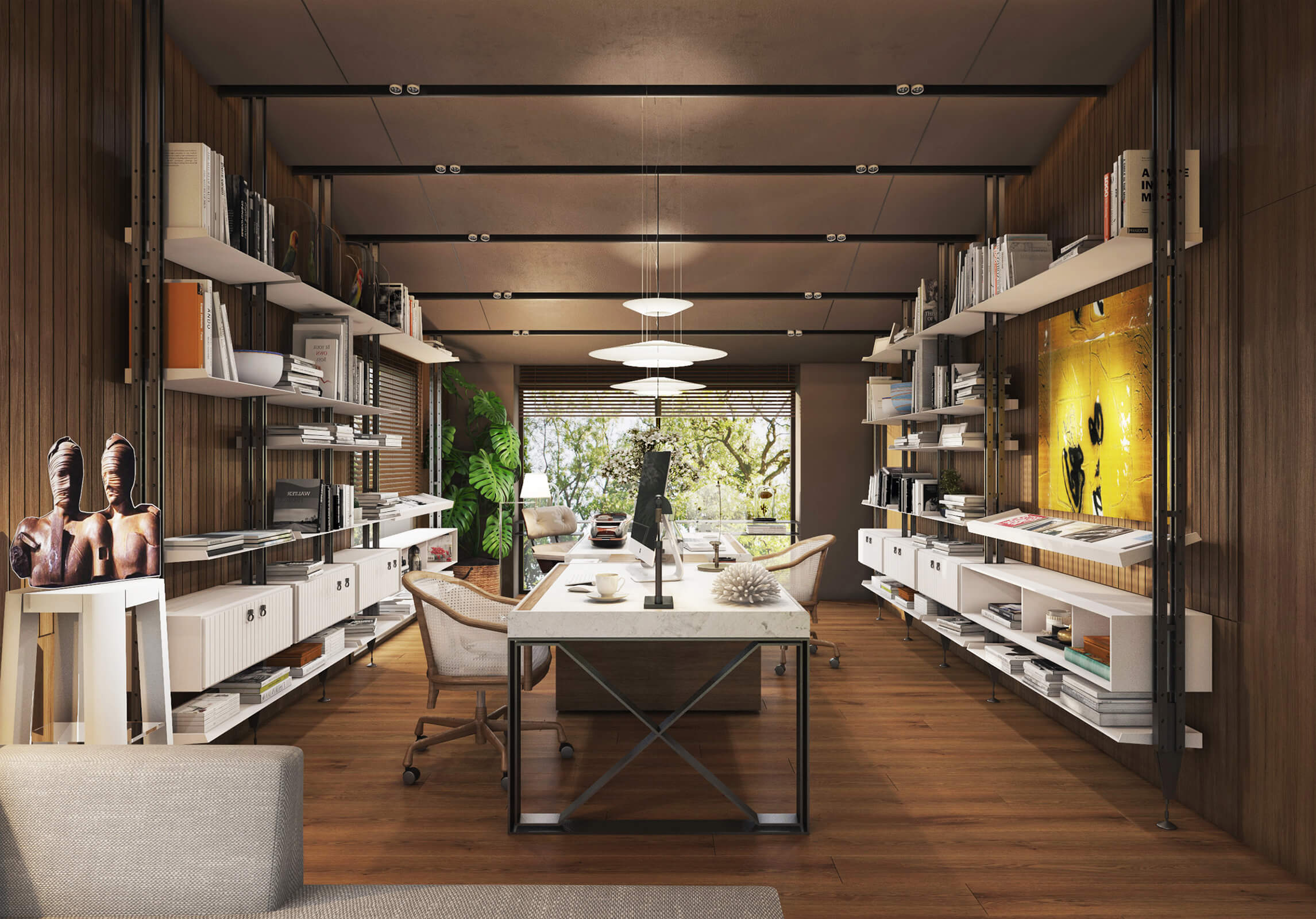 Across all their projects, KM’s design values seek to maximize the living potentiality of each space regardless of its function. Here in this attic a sloped ceiling, which can often be deemed an undesirable feature, inspired a unique design. Fragmented metal sheeted ceiling panels embedded with lighting were custom designed and give the space a distinct character with rhythm and dynamism. With walnut wall coverings, dark bronze and brown paint, a slightly darker palette lead the eye to the two large windows at both ends of the room. While one window faces the meticulously landscaped elegant garden of the home, the other embraces the ever changing beauty of the Bosphorus.