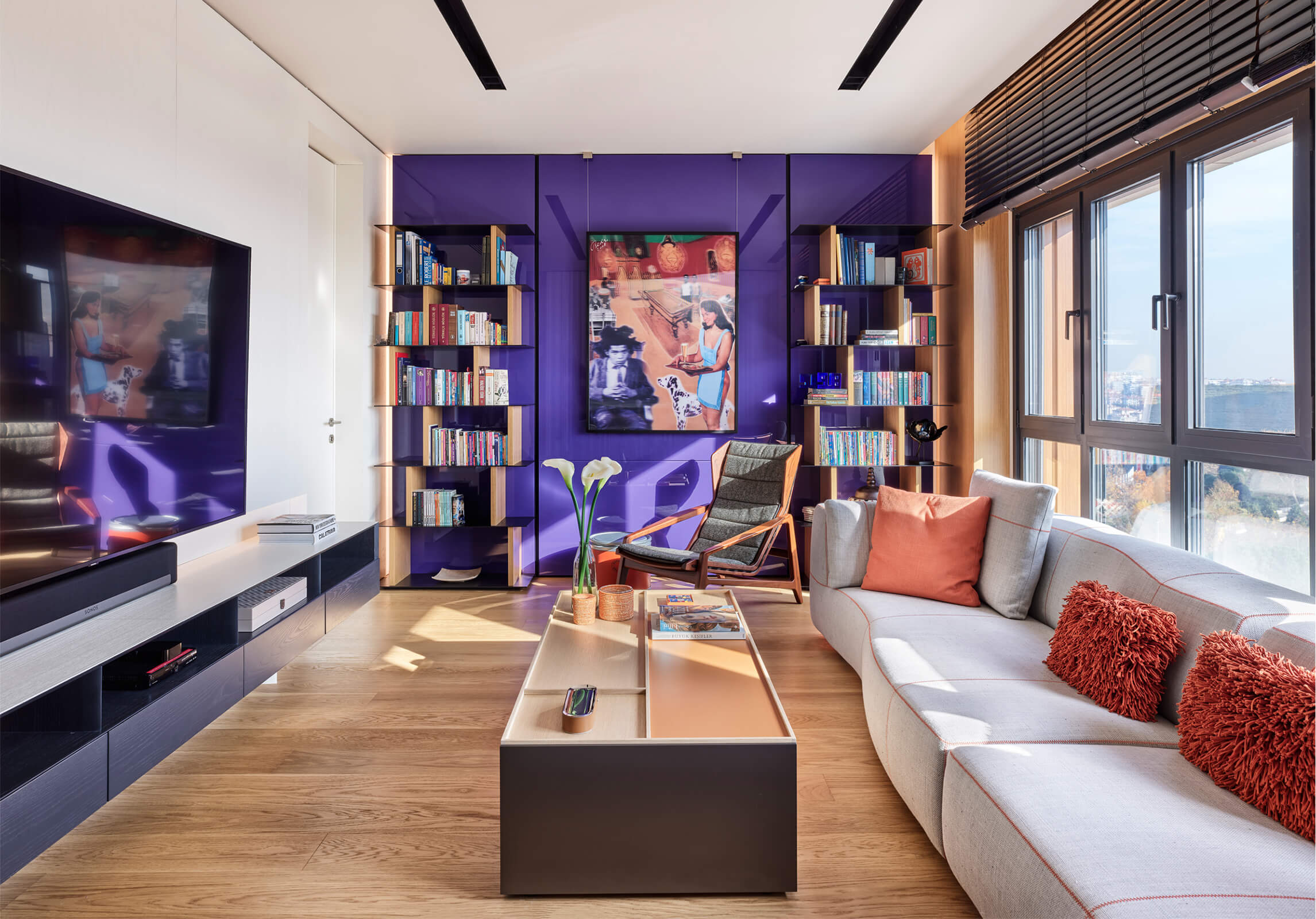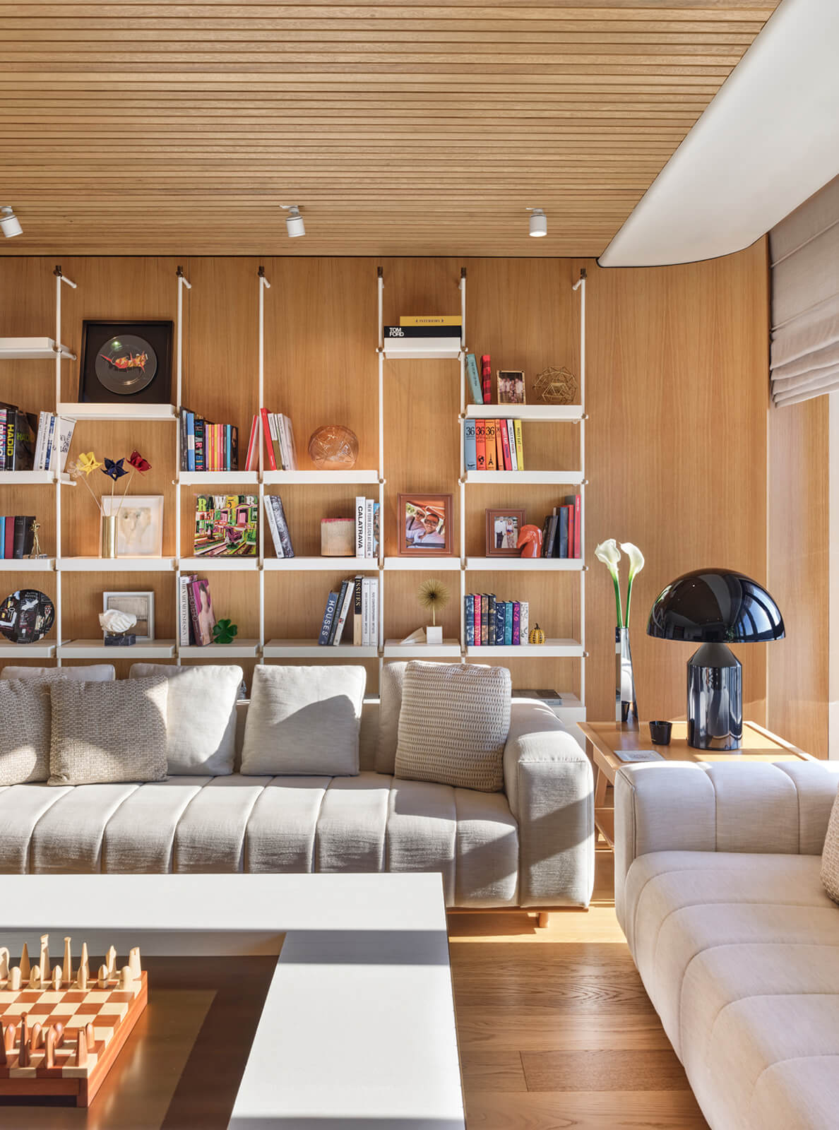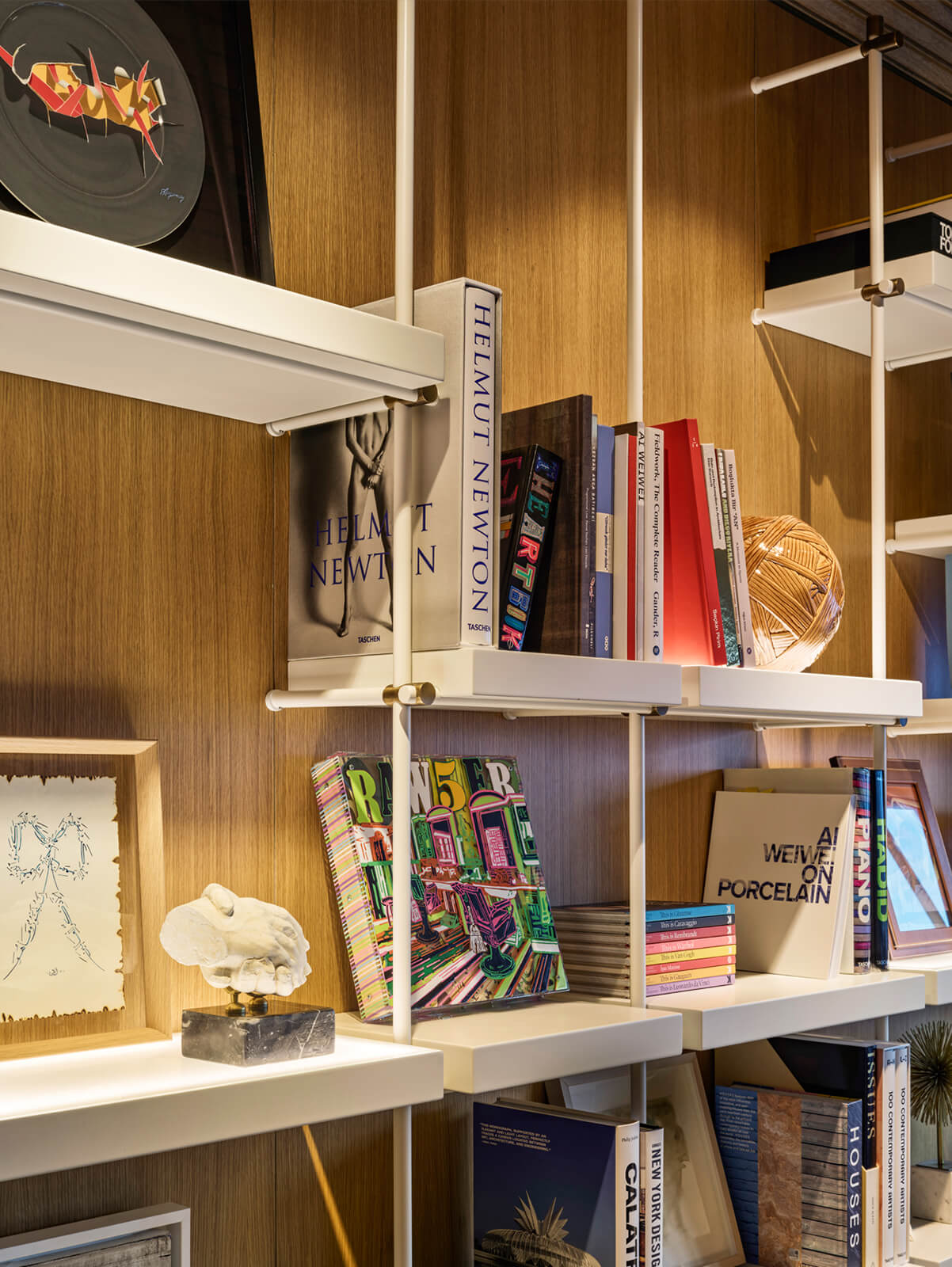 The lower floor is a unified common space consisting of a dining area, fireplace, living room and bar. All spaces flow into one another but are slightly separated. Artworks collected over the years, make a statement on the backdrops that were designed to make them stand out. The furnishings enhanced by the use of refined materials such as oak wood, patinated bronze, touches of genuine leather and serpeggiante marble, add a breath of luxury to the clean, contemporary aesthetic. All together, they form a modern ensemble, turning the space into a haven of peace in the heart of a super hectic city.