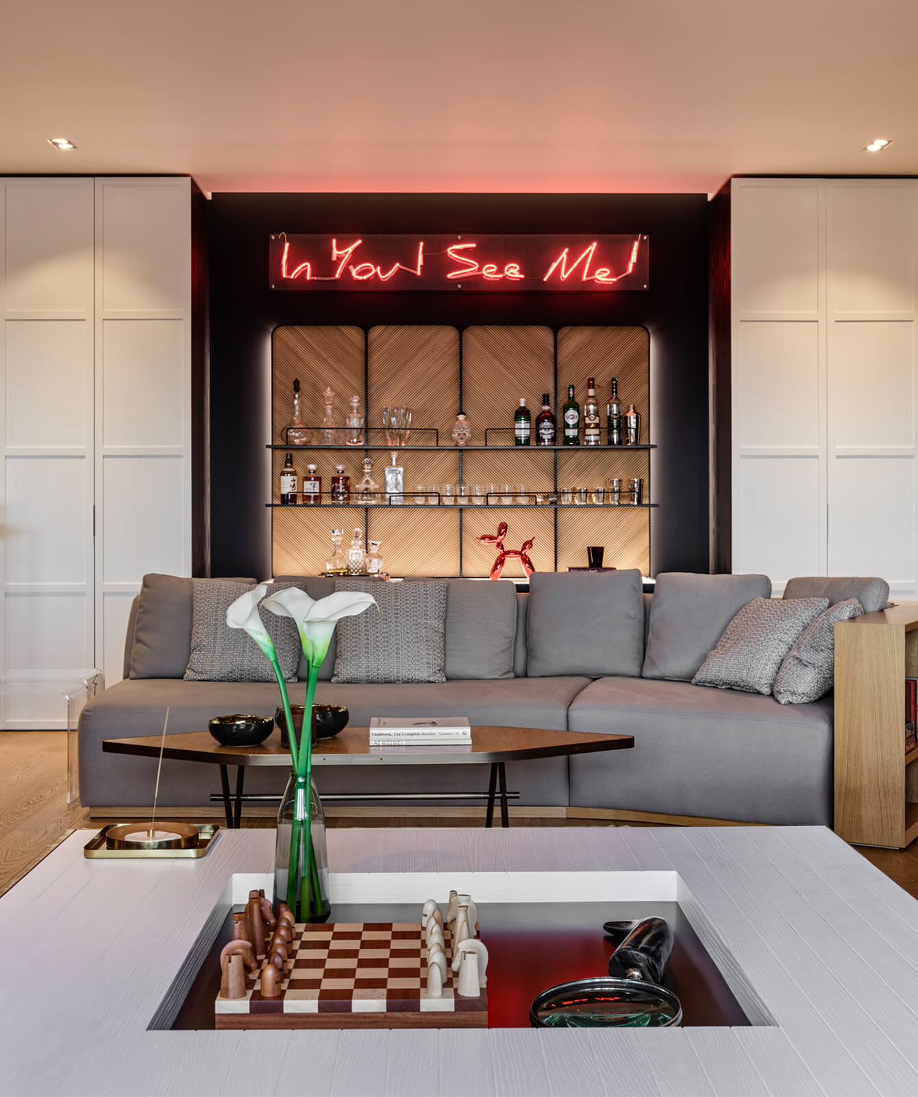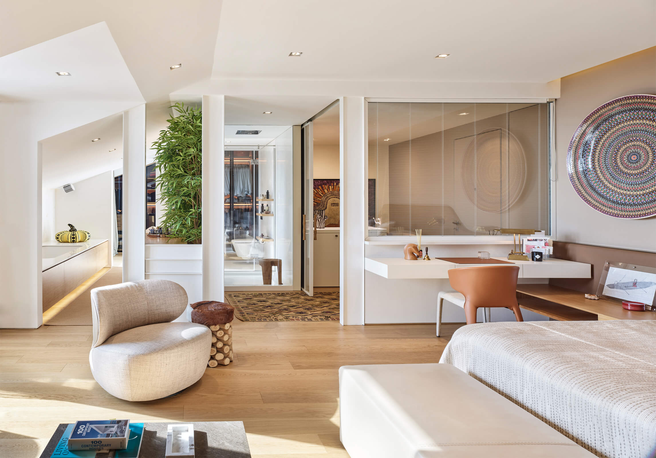 This townhouse situated very close to the financial district, atop Gayrettepe hill, overlooks both the city and the Bosphorus. The project was to unify two adjacent duplex penthouse flats into a single one, to reconfigure and open up space to enhance light and airiness. The upper floor consists of two bedroom suites, reached from separate staircases at both ends of the residence. Bedroom, bathroom and dressing rooms are seamlessly connected to each other, reminiscent of a five-star hotel room with the comfort of home.