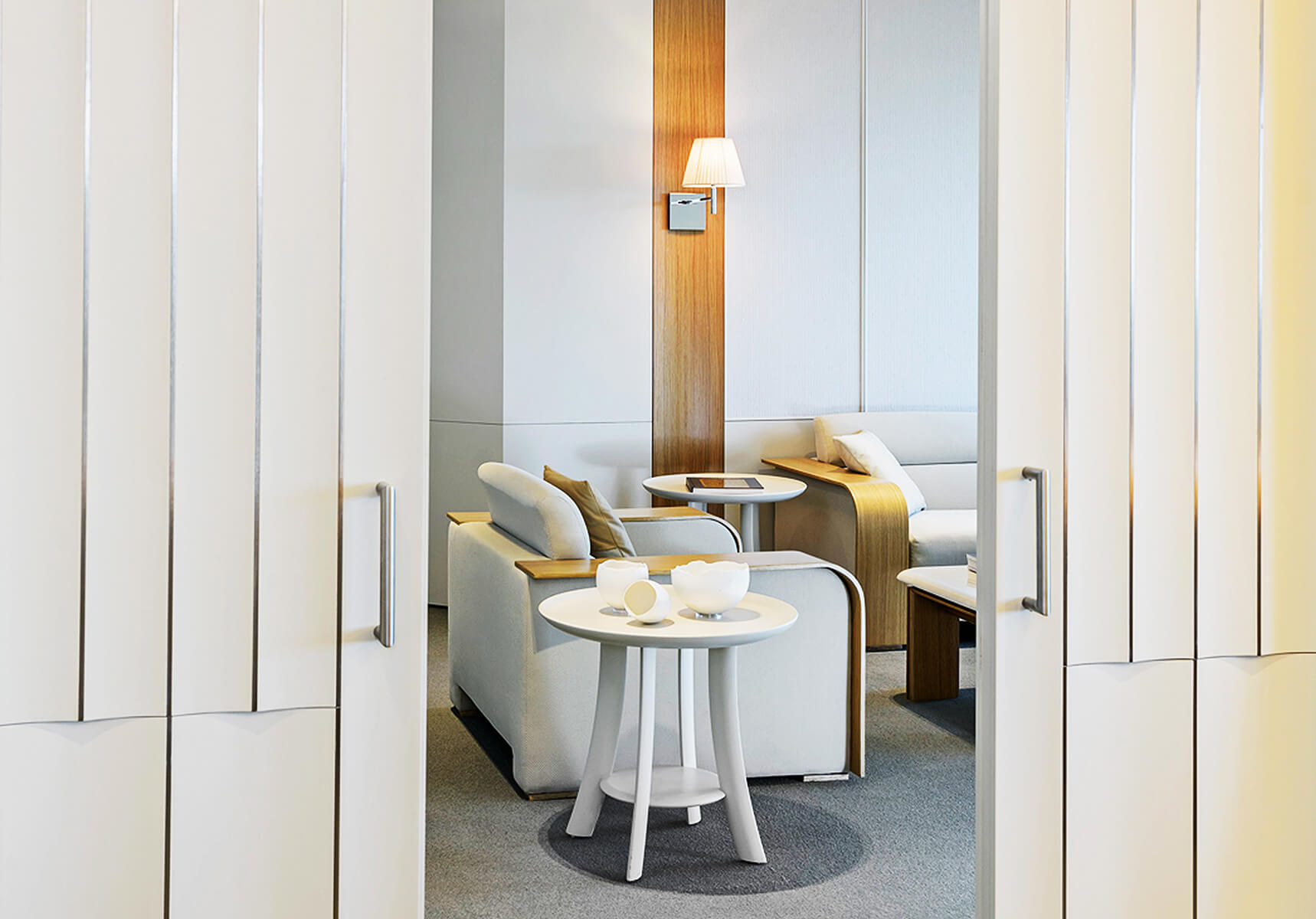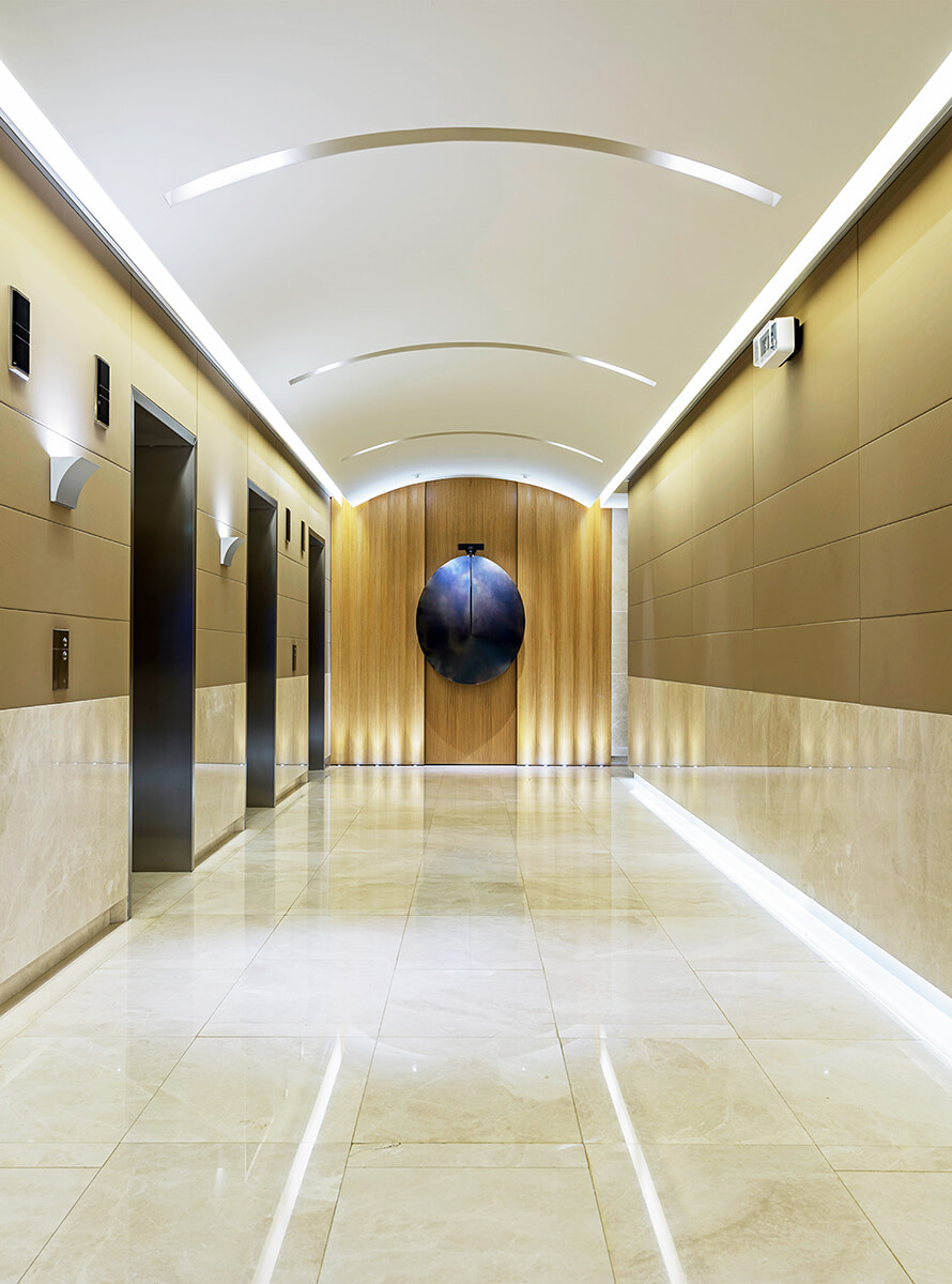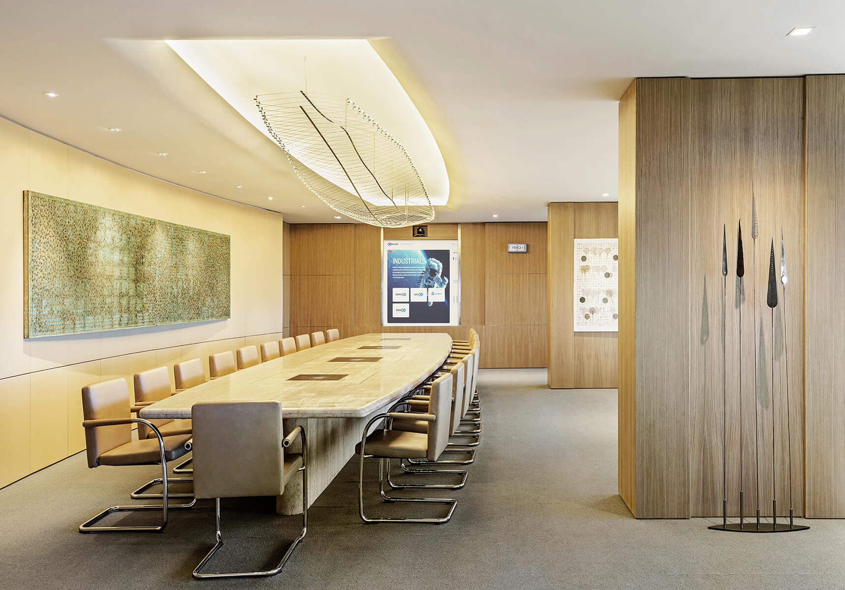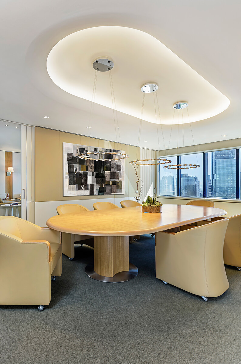 The head office of one of the world’s leading cement manufacturers is set off by a sculptural concrete information desk gradually transforming into a light structured staircase. Escalating through a vast gallery space, the staircase becomes the focal point of the whole design, amidst a lounge area luminous with natural light equipped for use by both employees and visitors of the company.