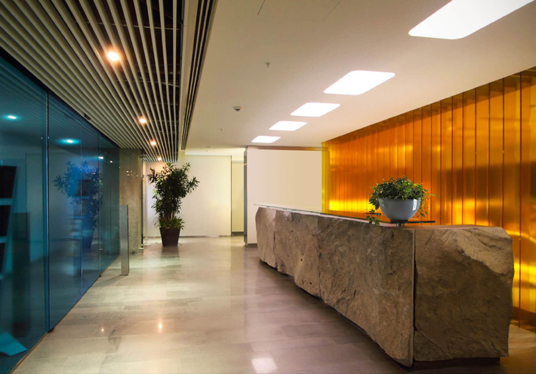 The design approach, material and color selections were all inspired by the main product of the company, high strength white cement. It was also implemented on wall panels, floor coverings, open office area dividing plant containers, ceiling fixtures and furniture.