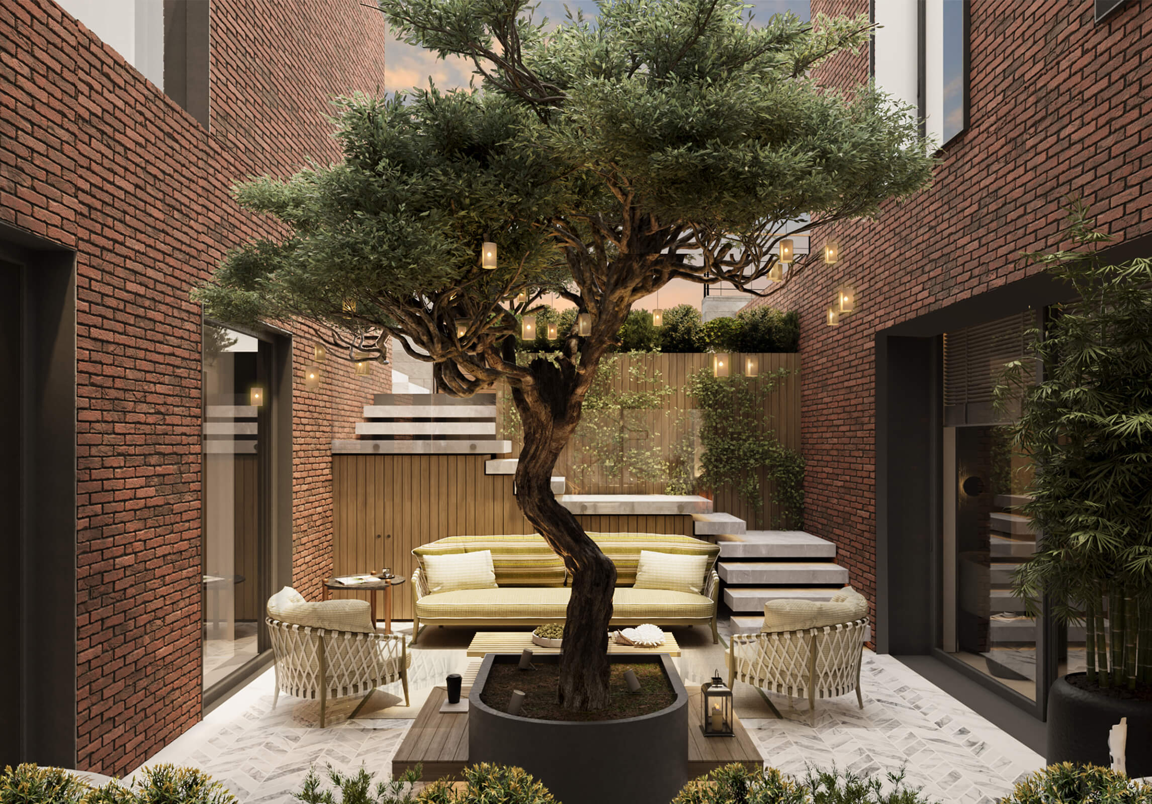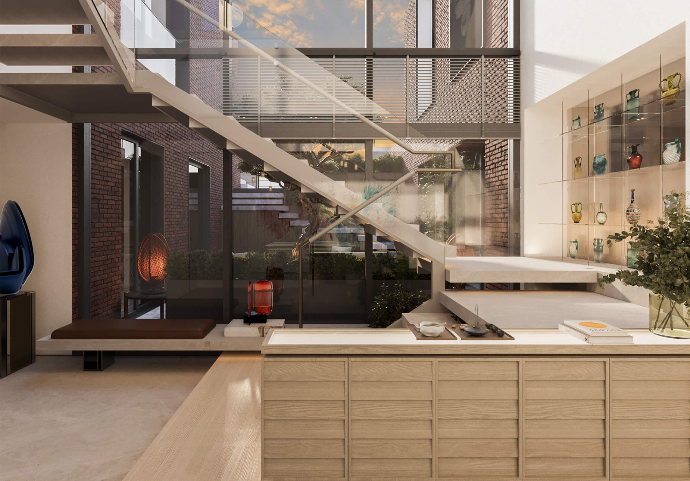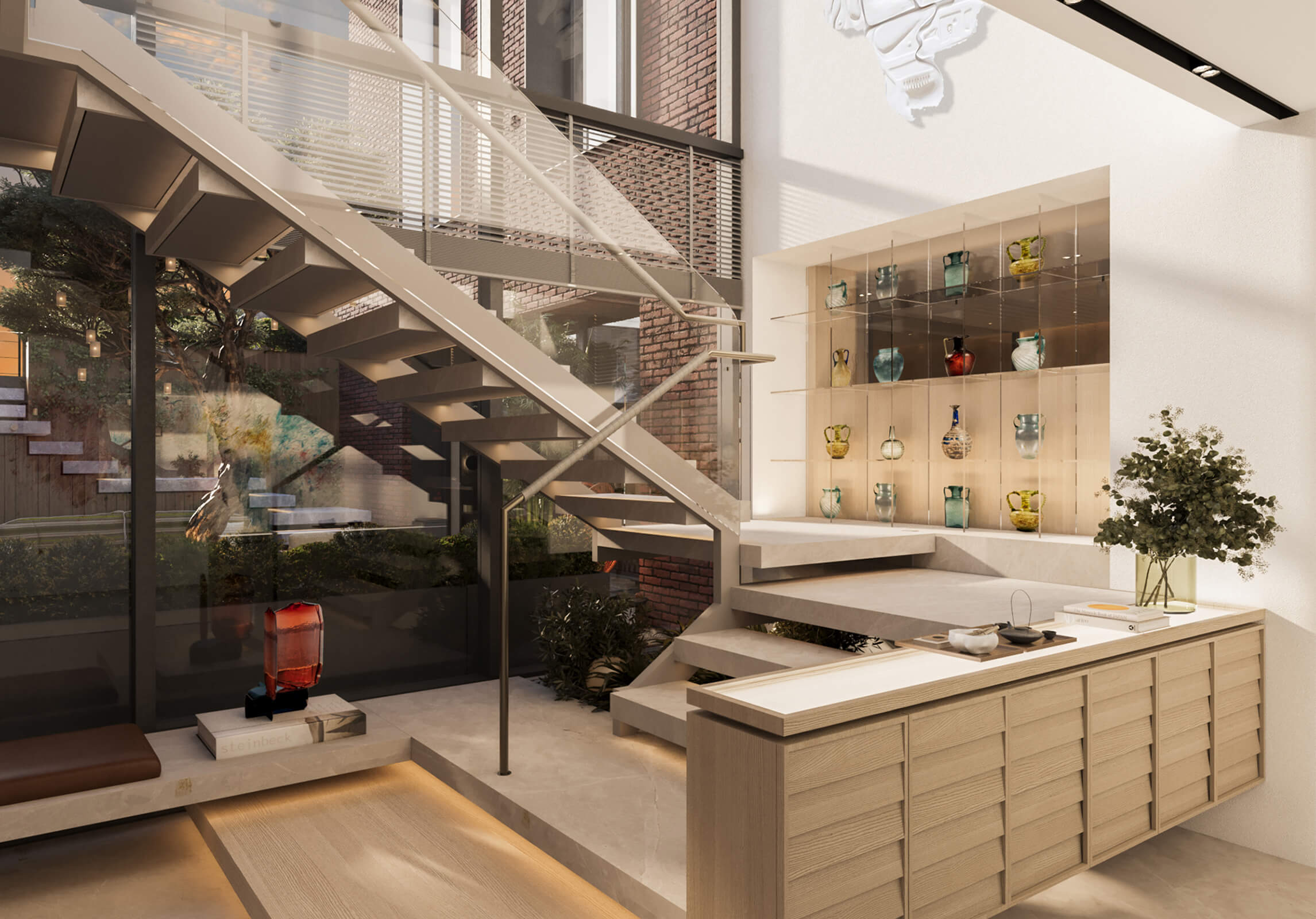 At the center of the apartment is a sculptural, steel-constructed staircase that dominates the interior courtyard. The U-shaped layout creates a spacious relationship between rooms, all opening to the internal garden. The internal garden allows natural light to flood the space, adding an element of tranquility and nature. Large glass surfaces enhance the interaction with light and shadow, enriching the interior. High ceilings and expansive terraces provide a commanding view of the front garden. Masculine and sculptural forms, with clean lines in the furniture and structural elements, strengthen the modern identity of the space.