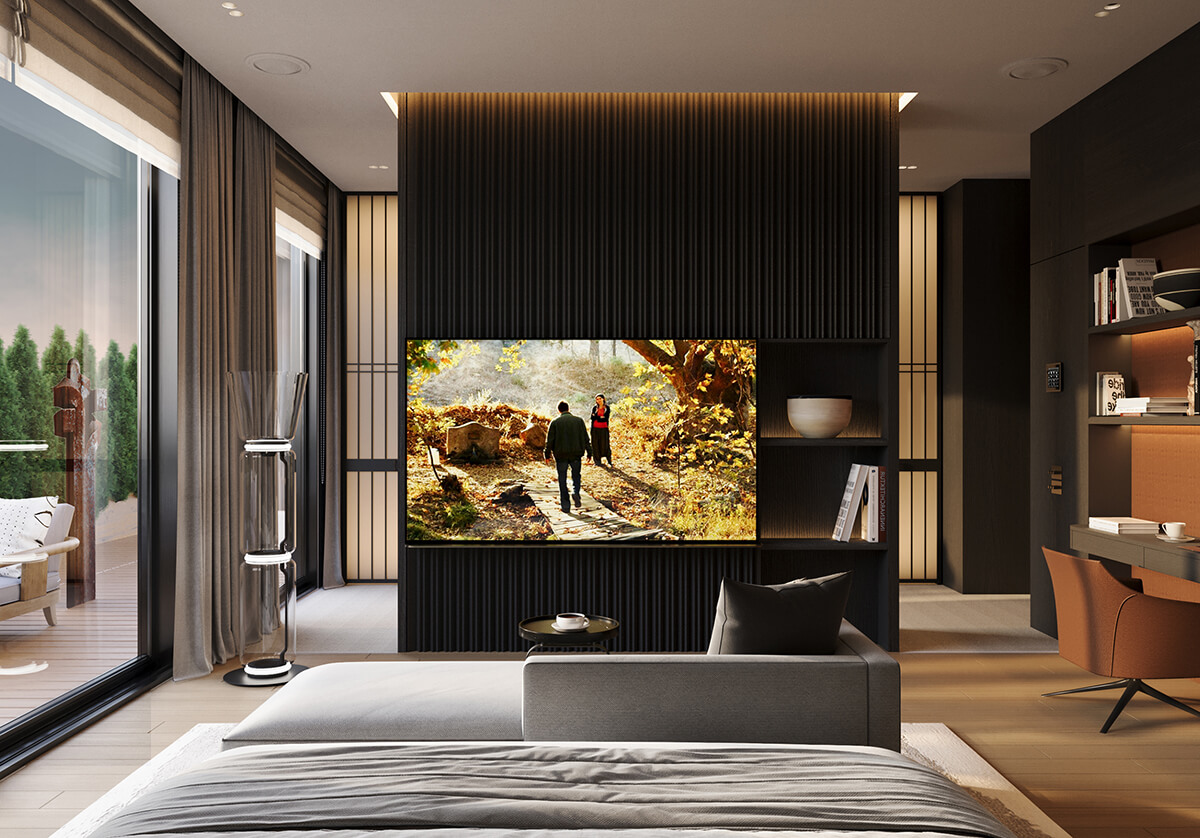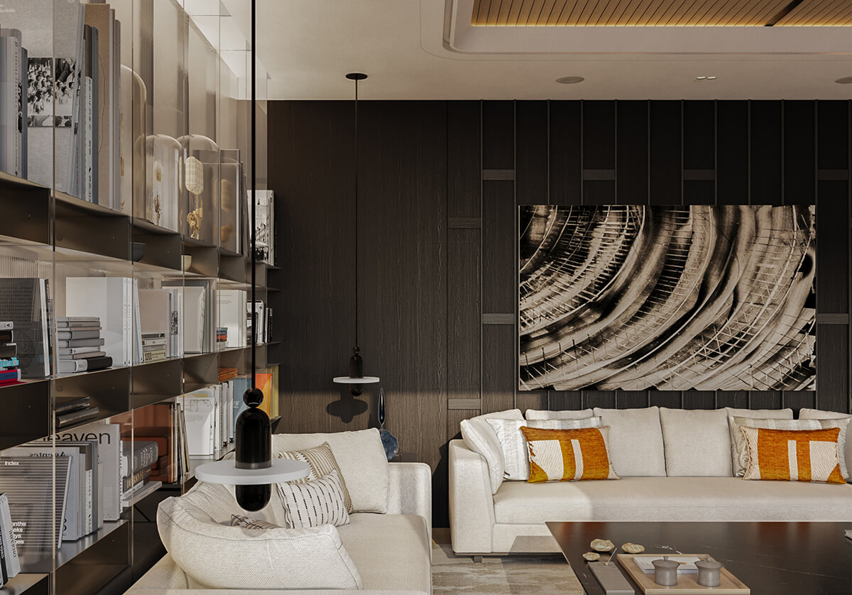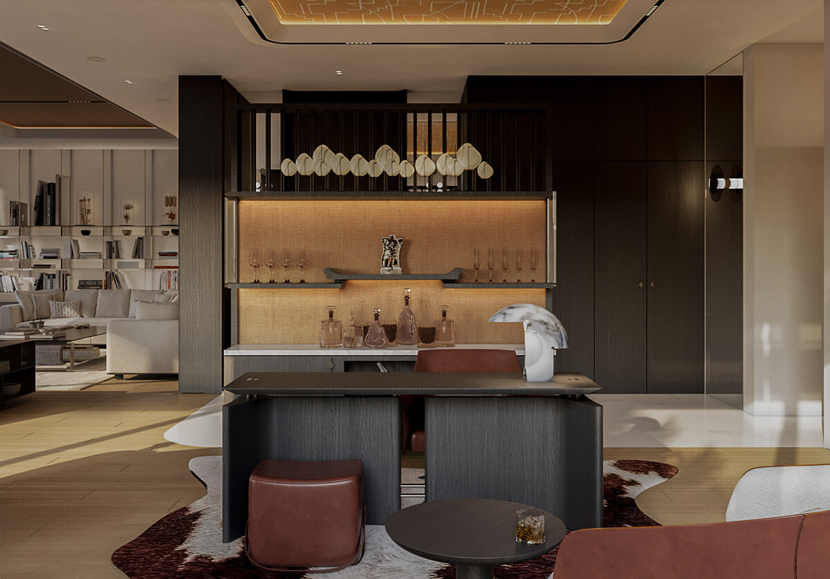 A key material in the project is brushed and smoked ash wood, used across wall panels and custom cabinetry. This treatment revealed the natural texture and grain of the timber, reinforcing the understated elegance of the design language and grounding the space with warmth and authenticity.