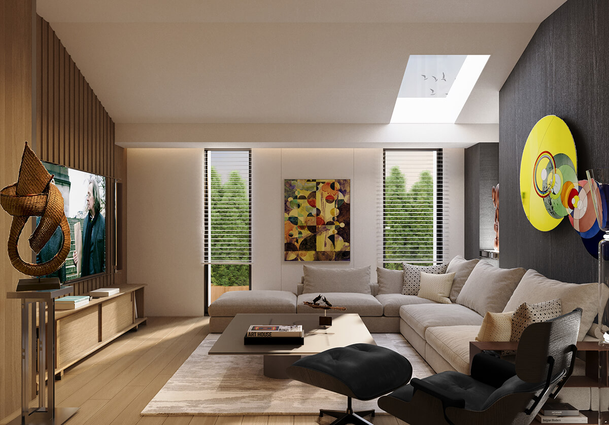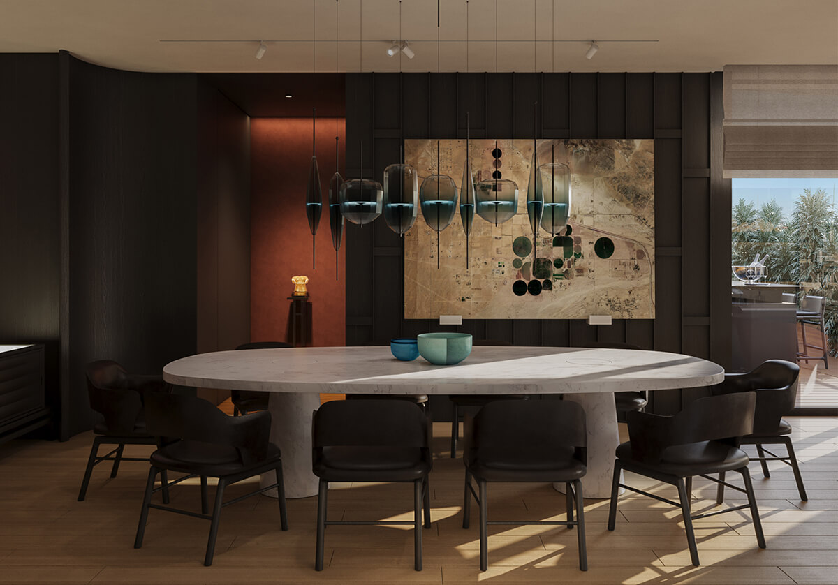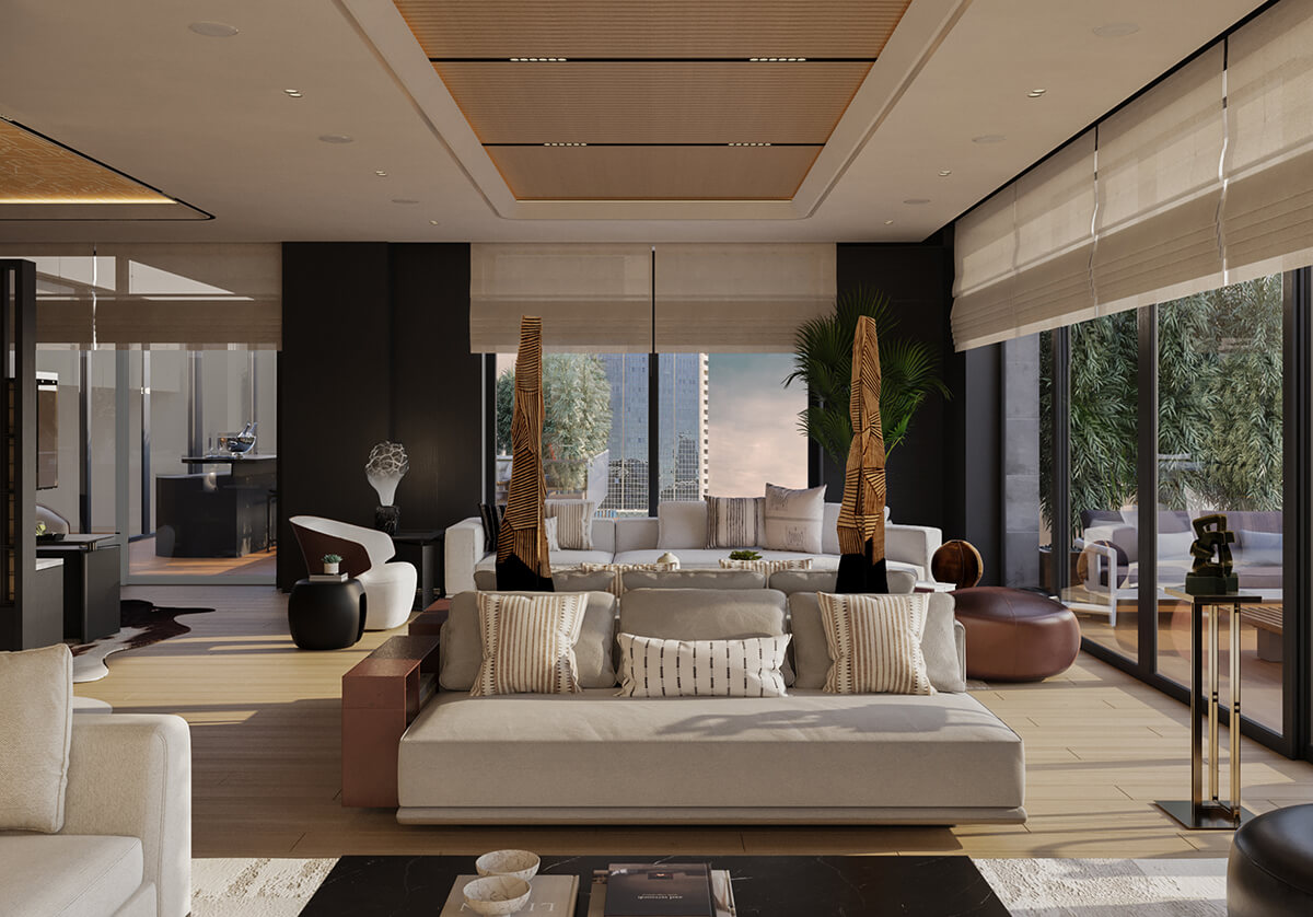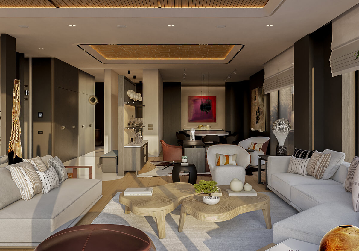 The interior seamlessly extends toward the terraces, creating fluid living spaces that open up to the Bosphorus skyline. As the daylight shifts throughout the day, so does the atmosphere of the space — revealing new depths and subtleties within the design.
