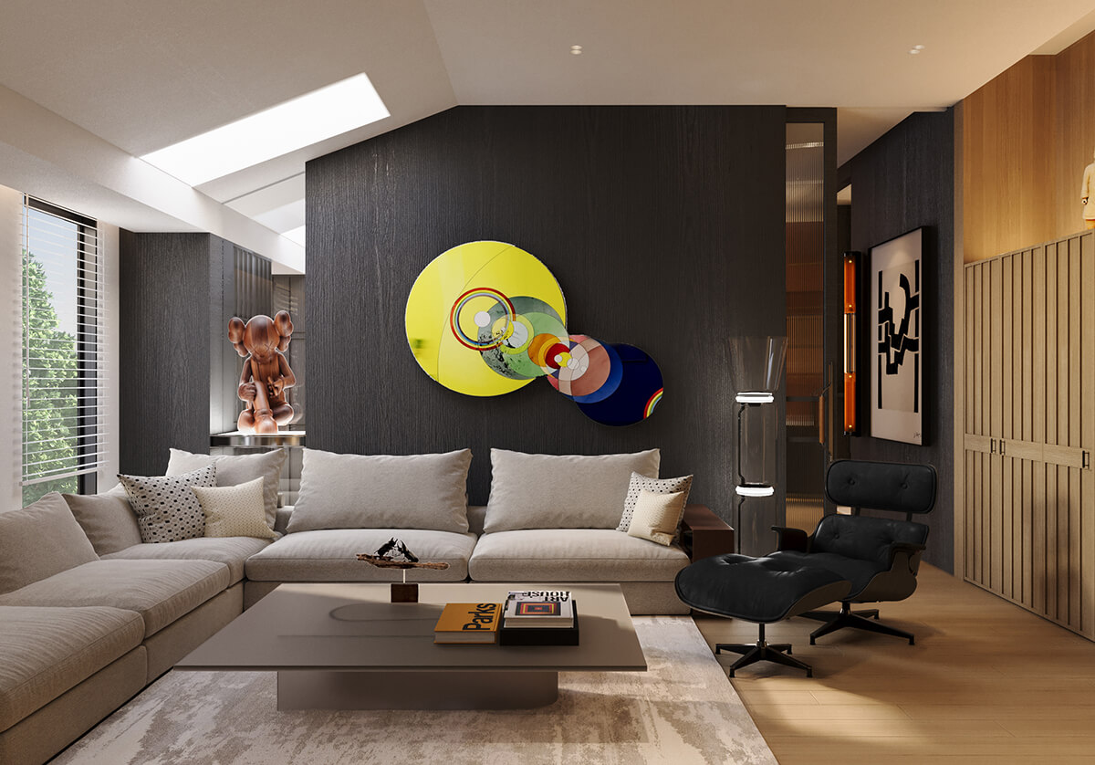 Throughout the apartment, a quiet yet expressive material palette — including natural stone, matte metals, and handcrafted finishes — evokes the wabi-sabi philosophy, celebrating imperfection, tactility, and the passage of time.