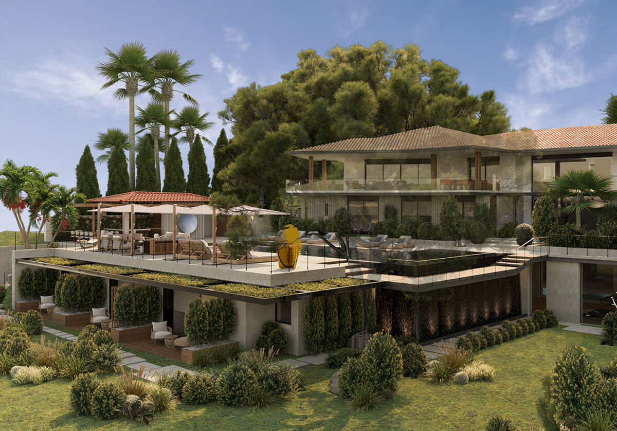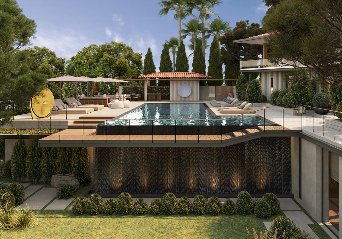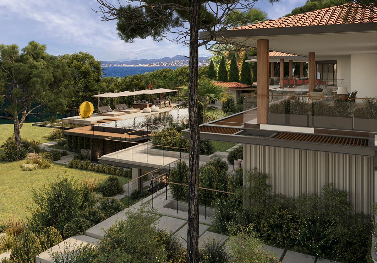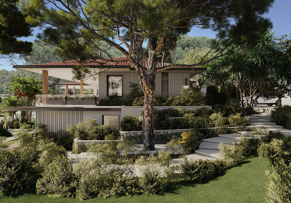 Villa B will be raised with sustainable construction principles in the footsteps of a 1950s stone house in a very privileged part of Parc de St. Tropez, facing the village over monumental stone pine trees, a tree symbolic of the region.