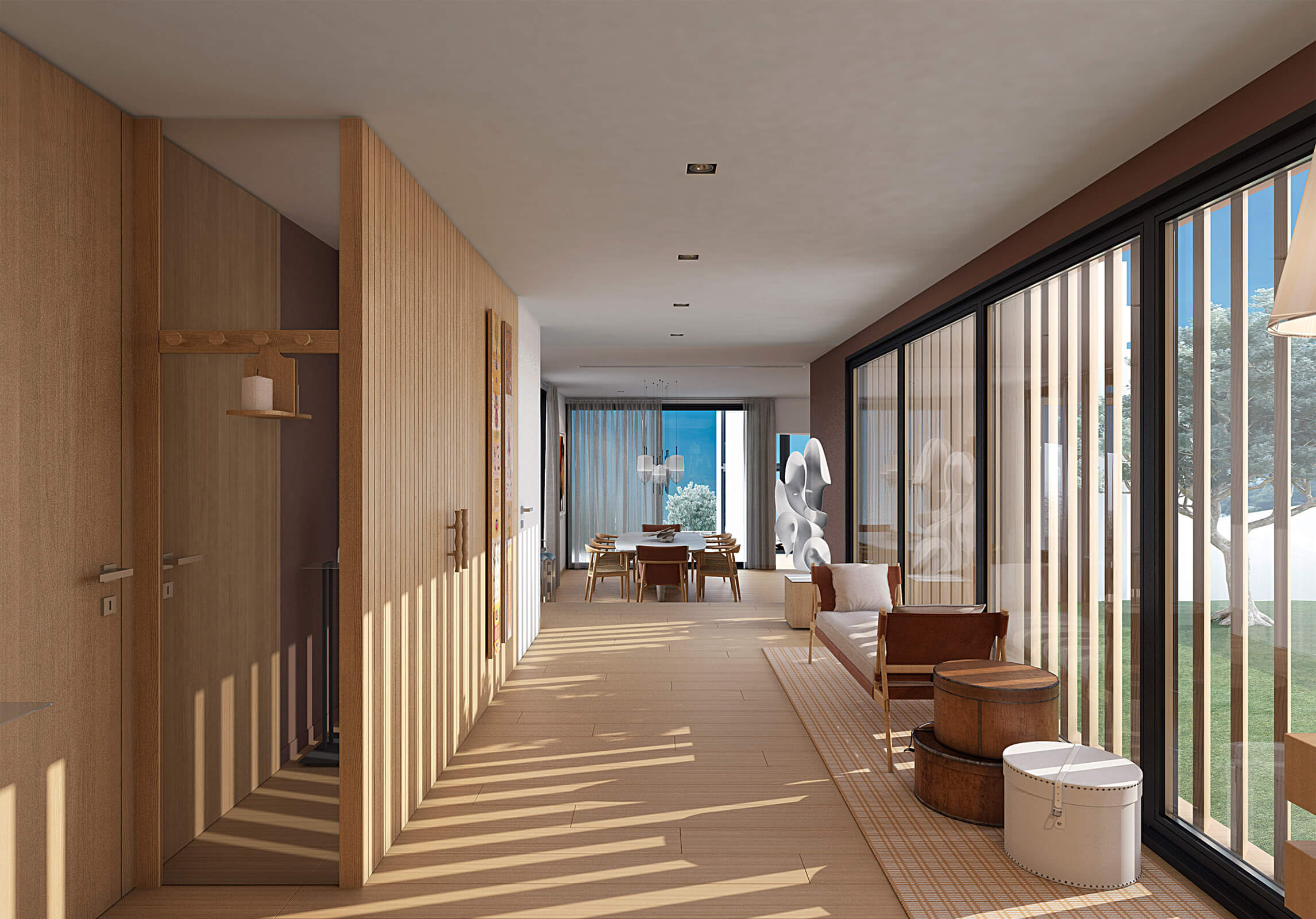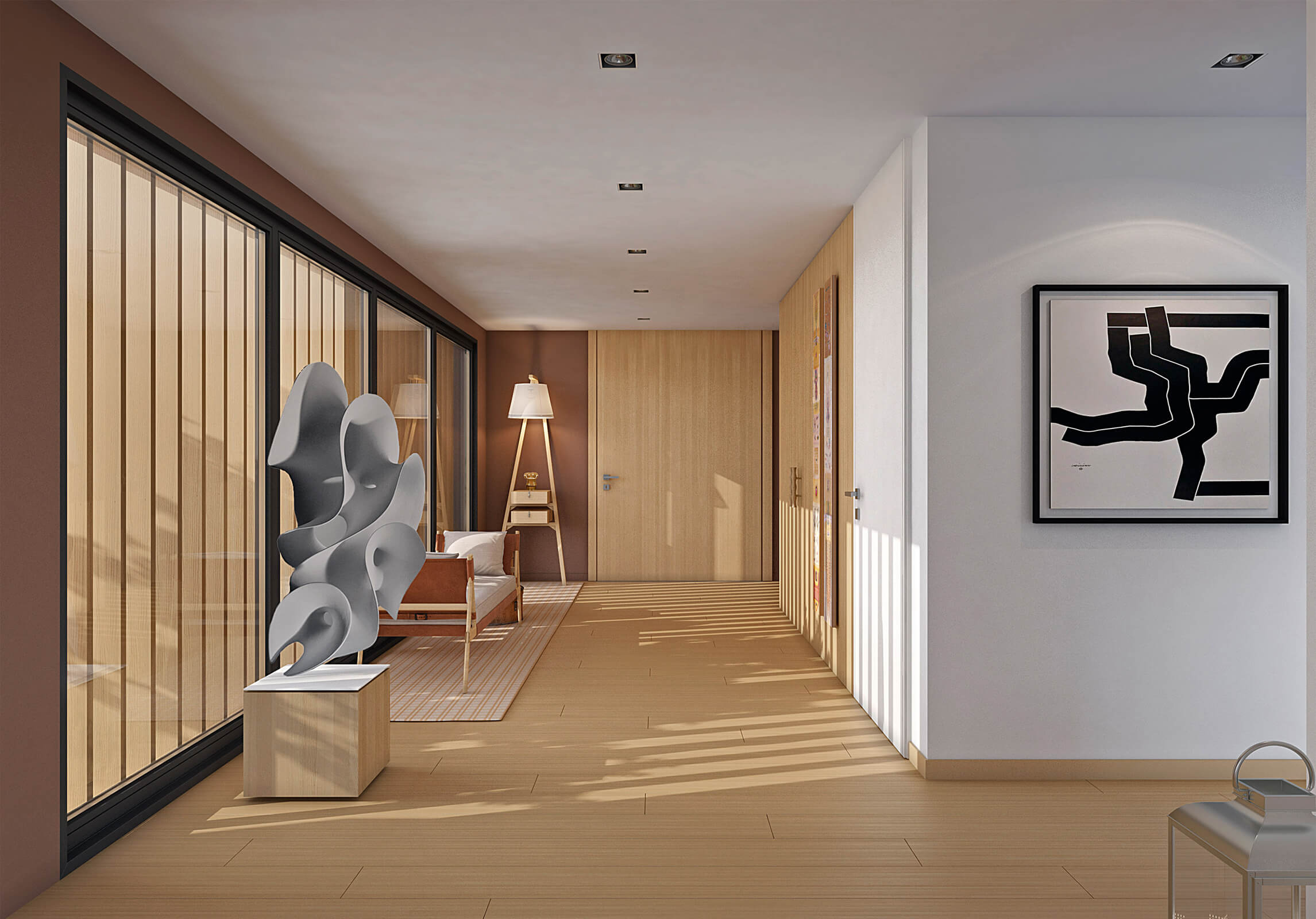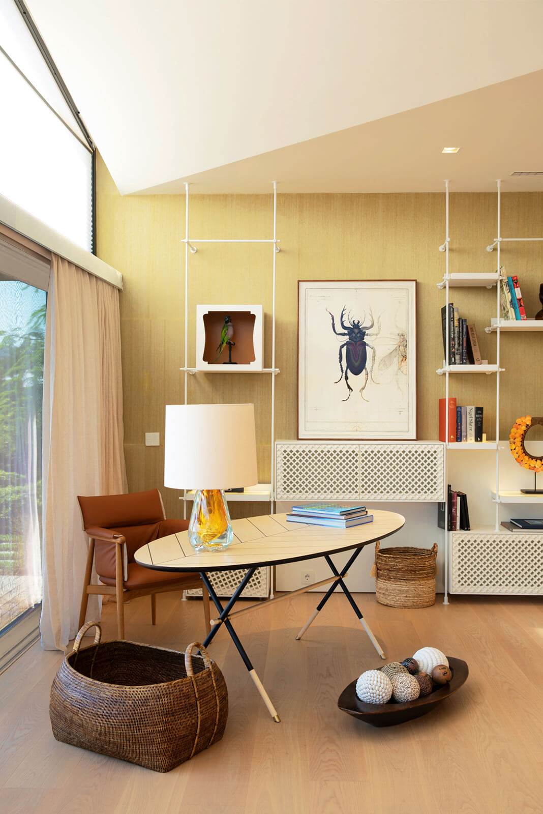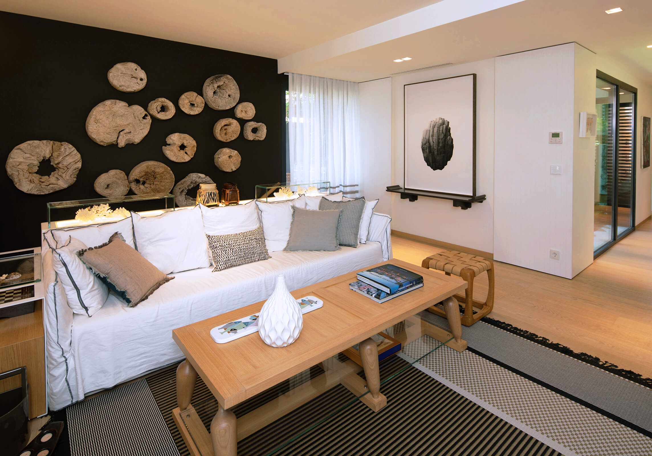 Modern yet full of summer breeze.. Located on the beautiful Aegean coast, across the bay from Bodrum, this three storey contemporary villa is part of an exclusive project designed by architect Carlos Ferrater. For this particular project KM selected a soft palette of whites, earth tones and natural textures with carefully placed contrasting blacks. The furnishings tailored to the residence are designed to complement a number of artworks that the owner has acquired from around the world. Others were purchased specifically to enrich the summery Mediterranean ambience with a contemporary twist. Equipped with a garden and swimming pool, the three storey family house also contains a small patio. A separate common area was needed for the family’s four young children. KM designed a colorful canopy of surf boards that hovers above the children’s lounge, a playroom to capture the children’s attention and stimulate their imagination.
