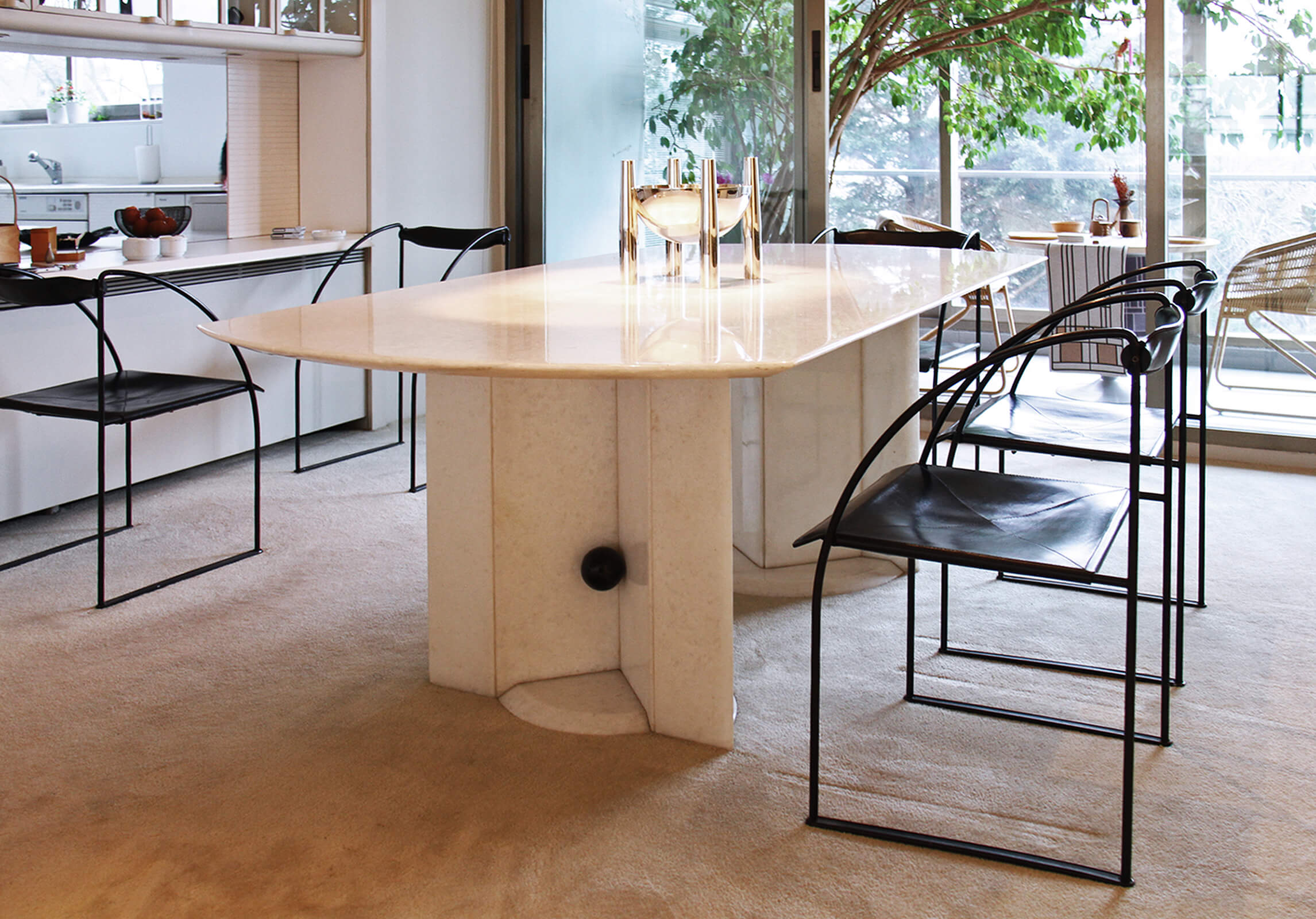 Within a very restrictive color palette of pale gray; from the walls, to lacquered built-in furniture, wall to wall carpeting and the ceiling; all in unicolor, form a canvas where clean geometric forms reveal a strong presence. Every detail within the furniture from lighting to painting holding posts give subtle hints of the mastermind of Yıldırım Kocacıklıoğlu's extensive design approach. Skillful and sculpturally undertaken, the marble dining table, lacquered plinth for a statue, black coffee table, the headboard/divider/lamp in the bedroom, are only some of the elements that contribute and are tied to the unity of the project while all possess individually striking qualities. Clean in an almost minimalistic sense, this house provides its habitants ease and comfort within a serene environment. Surprising as it is, a place of such appearance could function so perfectly to the point that elevates way of living, is a manifest within itself. Perhaps his most iconic work, in a career spanning sixty years, he has undoubtedly made a mark at his time, paved the way for the future and will always be remembered for his unique contribution.