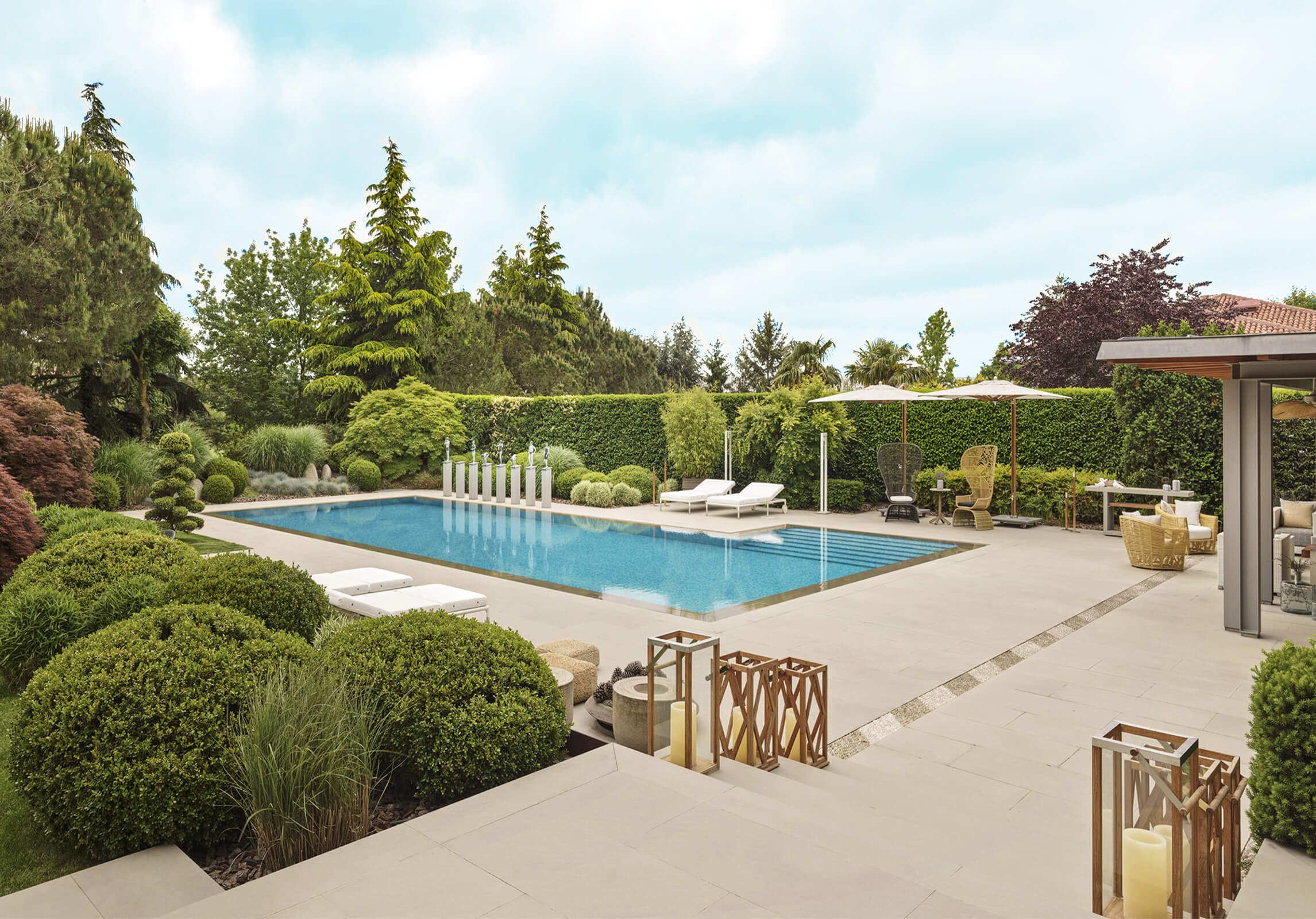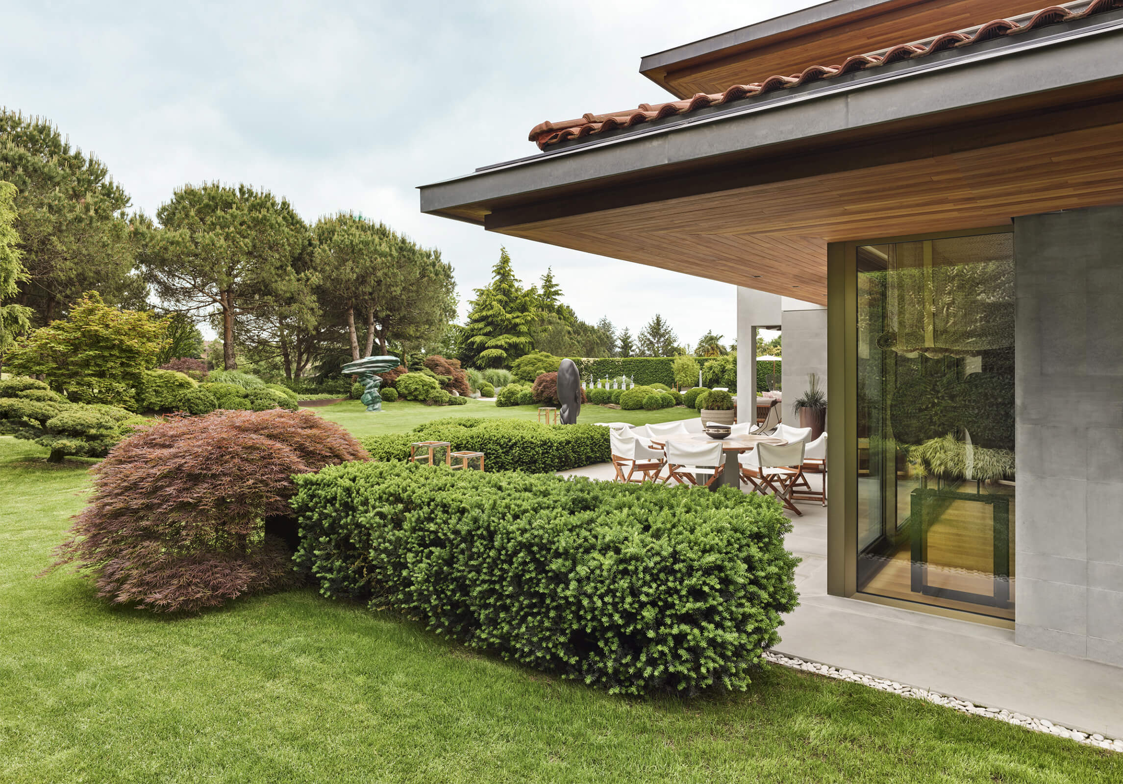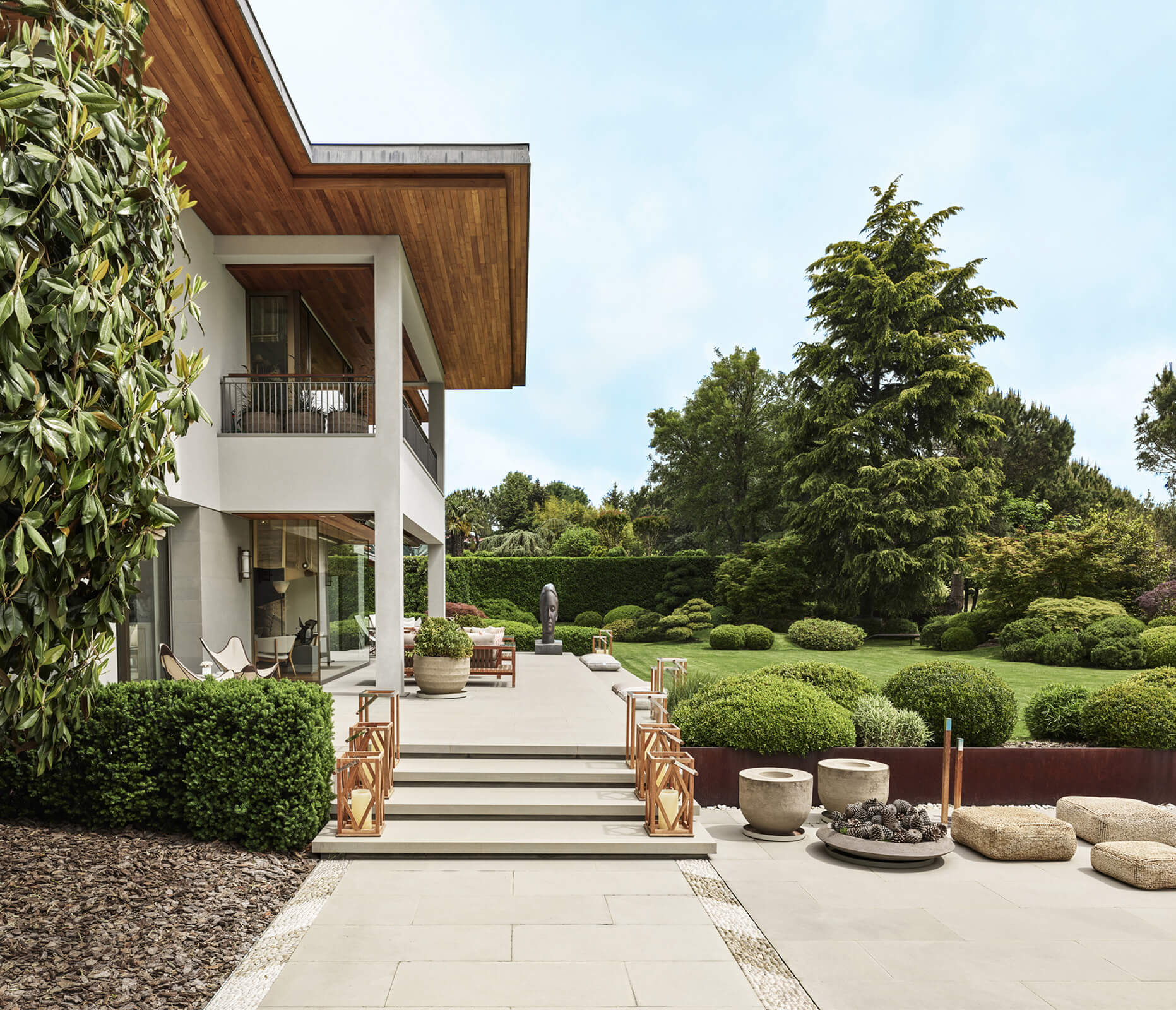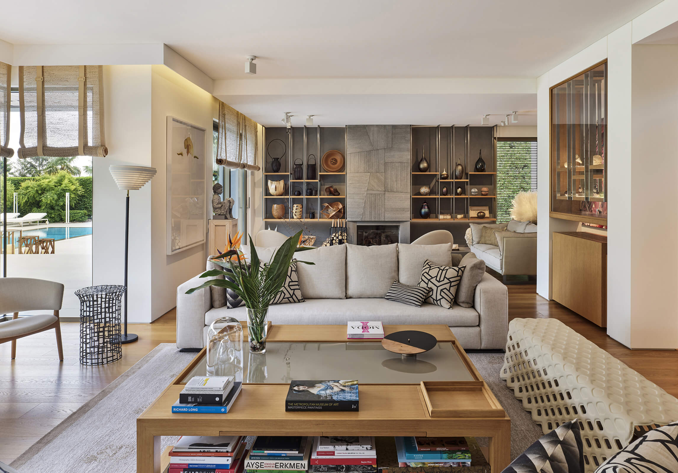 This contemporary home just outside of metropolitan Istanbul in the suburb of Kemerburgaz was designed as the summer residence of an art collector couple. It consists of a three storey villa, swimming pool and pool house. Situated on a vast terrain, the outdoor area was designed as an extension of the interior. Every window and opening was carefully planned in order to create viewpoints overlooking artworks both on the inside and out. Curated specifically for this house with a mix of top notch Turkish and international artists, this sanctuary of art cultivates the perfect balance between design, art and landscape. The garden of the house was landscaped in homage to the architect’s lifelong admiration of the Katsura Imperial Villa in Kyoto.
