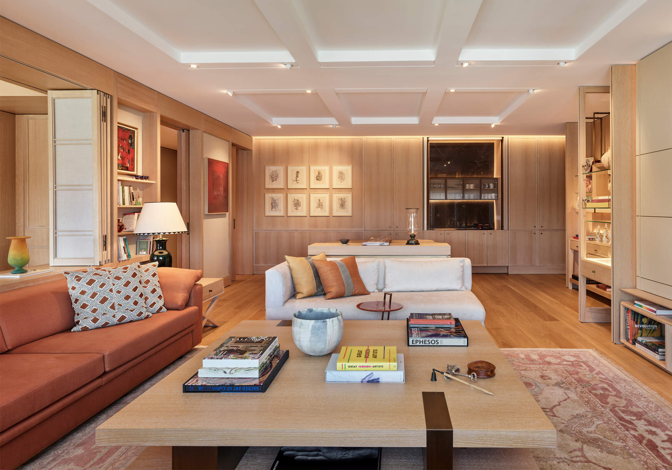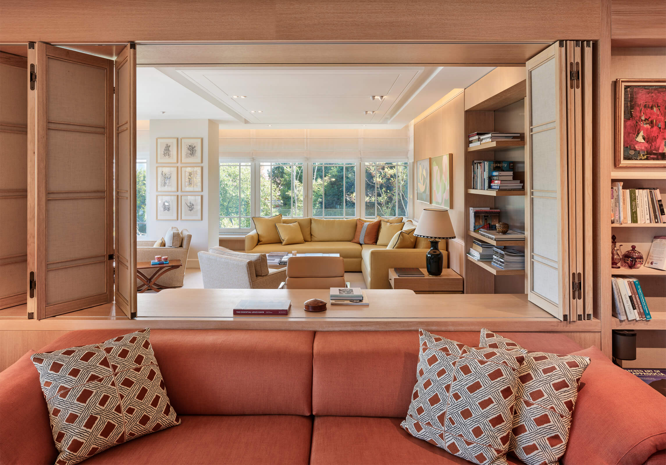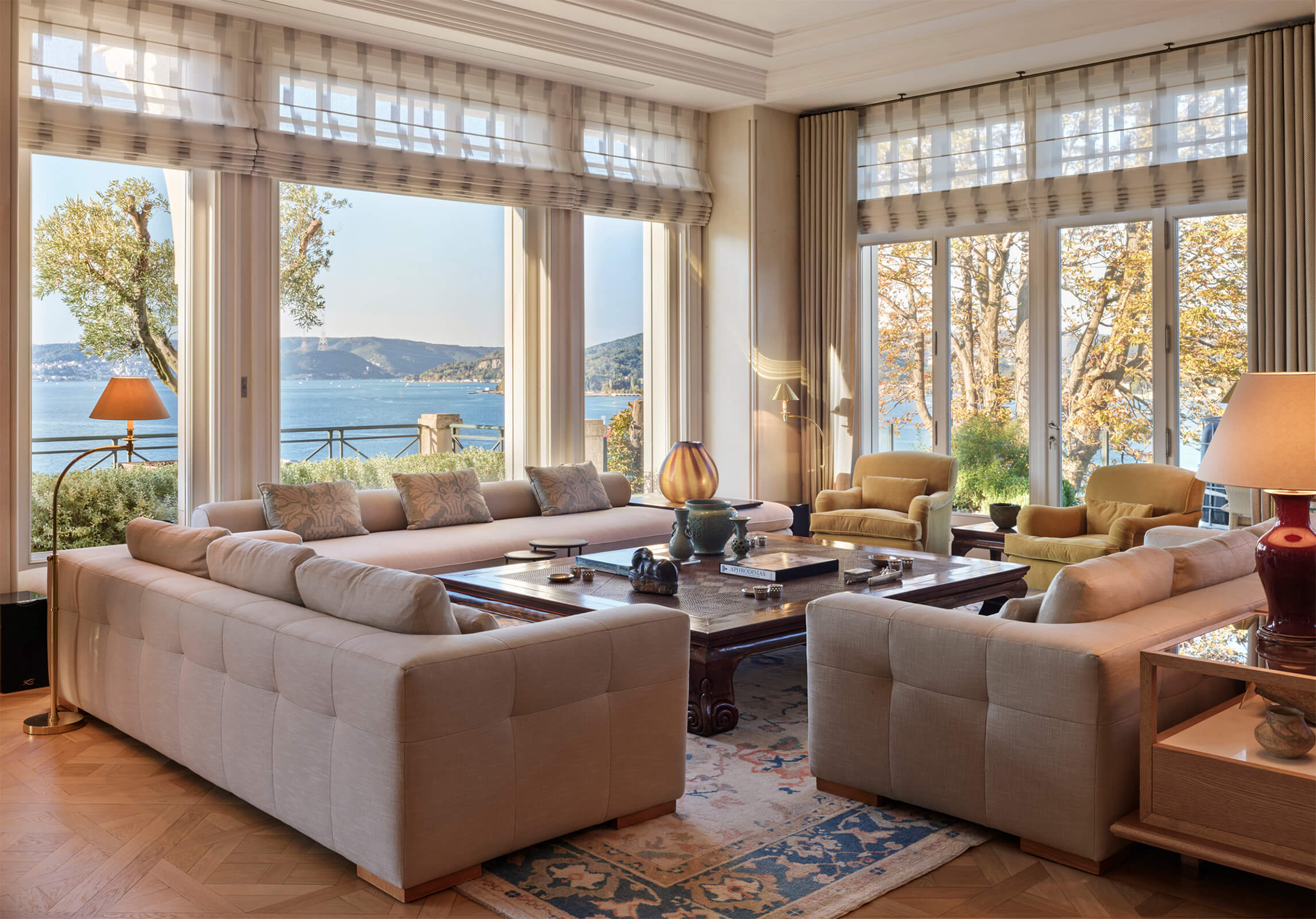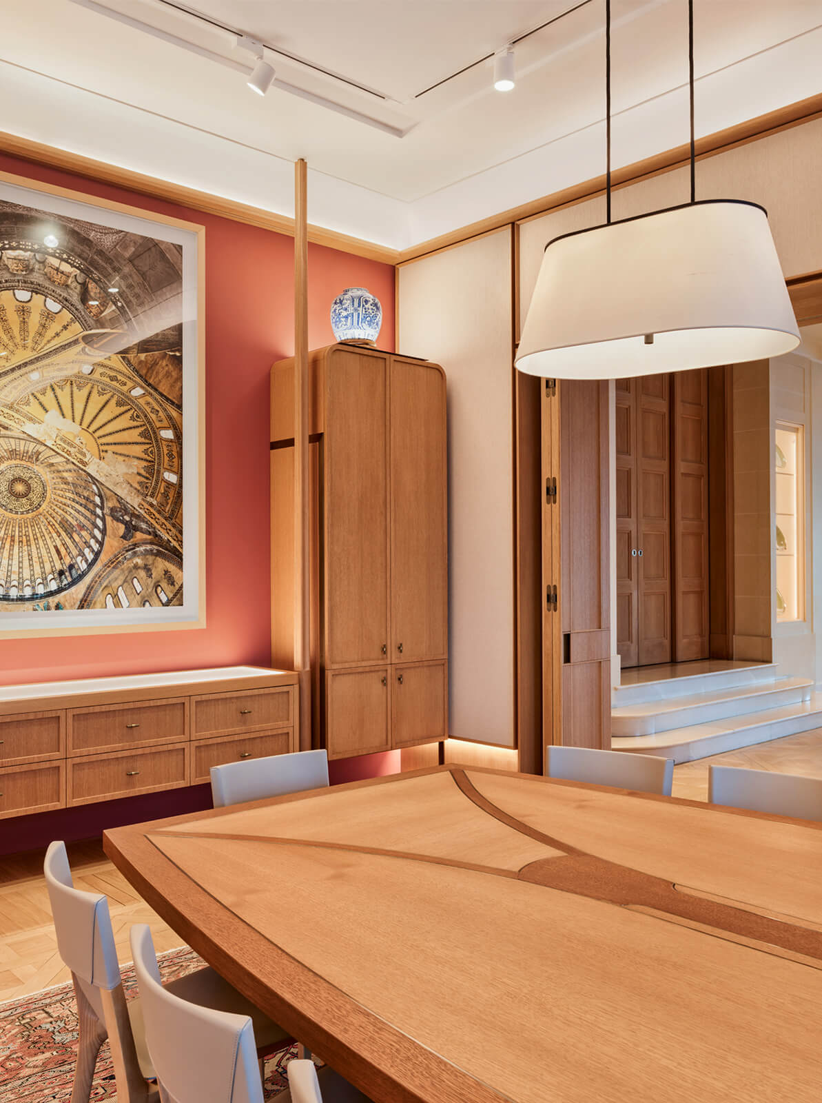 The main feature of this mansion set atop a hill in Istanbul’s leafy Yeniköy district is its sweeping views of the Bosphorus. The program called for a redesign of the original interior to meet the needs of a middle aged couple whose children had grown. On the first floor the children’s bedrooms were canceled to enlarge the sitting room and the home office/lounge room. The rooms were connected through a wide opening that can be closed when needed with sliding oak panels. On the ground floor a series of spaces were joined together, starting from a breakfast lounge, leading to a dining room which then opens to the grand living room. The arrangement of finely crafted built-in furniture, for example the wide oak panel sliding doors between the breakfast lounge and dining room can completely disappear or one can be left as a separator, to allow direct visual contact between these spaces. This serves to highlight space saving and augmenting qualities of the design. Living potentialities of each room are maximized where each room is given individual qualities while being part of the whole.
