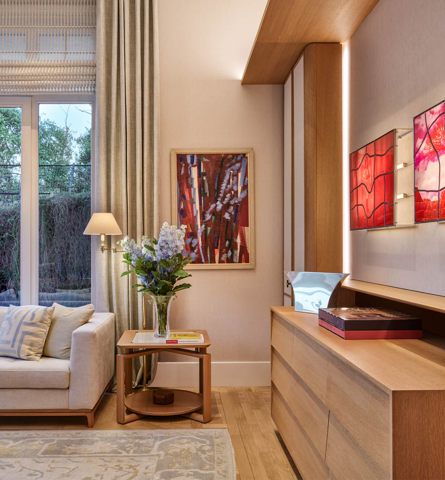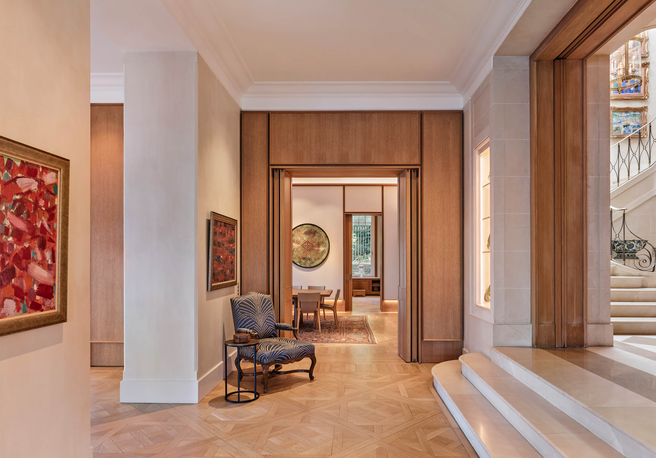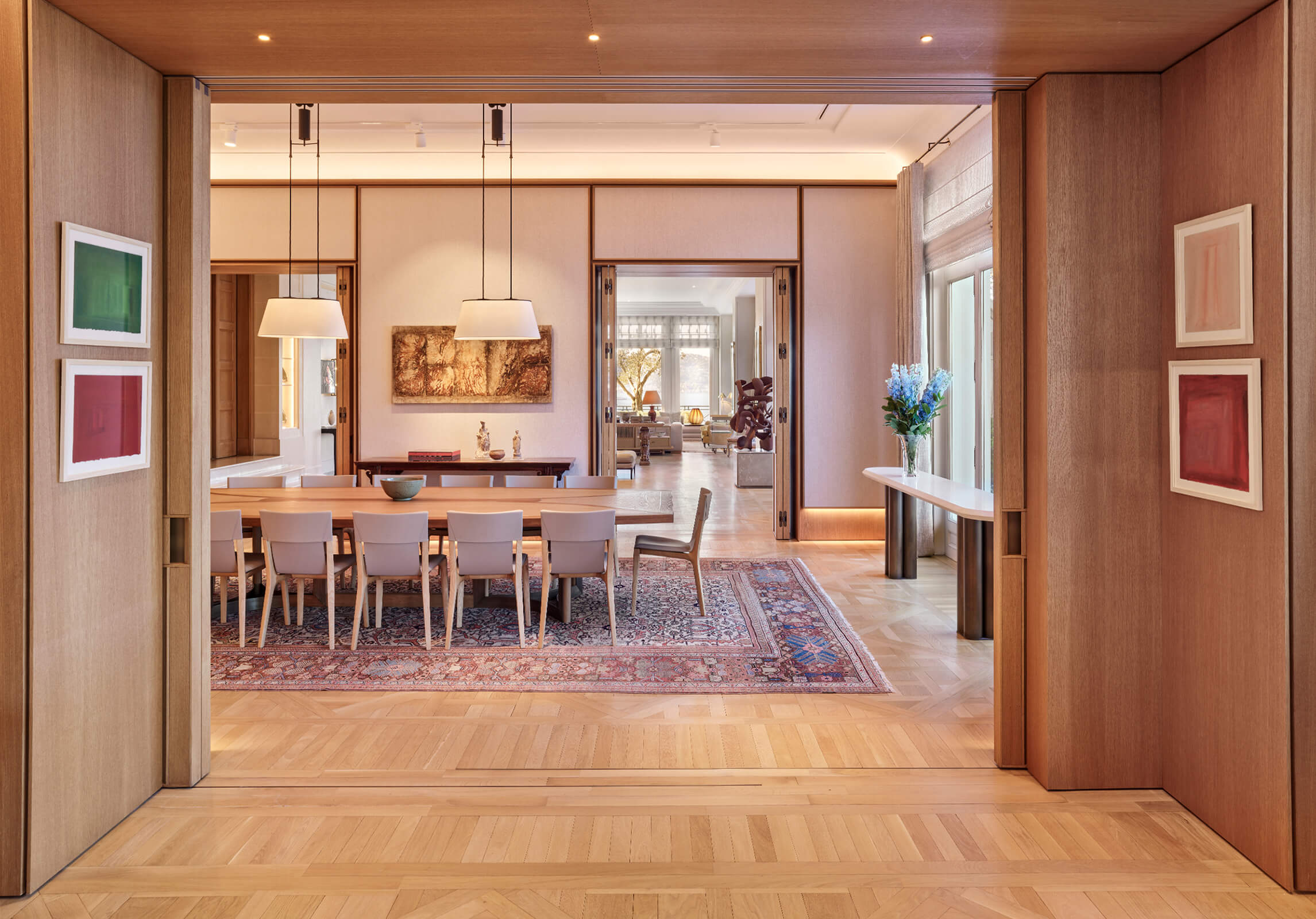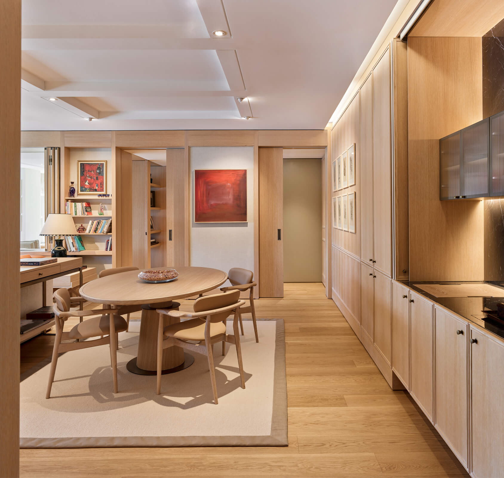 The main feature of this mansion set atop a hill in Istanbul’s leafy Yeniköy district is its sweeping views of the Bosphorus. The program called for a redesign of the original interior to meet the needs of a middle aged couple whose children had grown. On the first floor the children’s bedrooms were canceled to enlarge the sitting room and the home office/lounge room. The rooms were connected through a wide opening that can be closed when needed with sliding oak panels. On the ground floor a series of spaces were joined together, starting from a breakfast lounge, leading to a dining room which then opens to the grand living room. The arrangement of finely crafted built-in furniture, for example the wide oak panel sliding doors between the breakfast lounge and dining room can completely disappear or one can be left as a separator, to allow direct visual contact between these spaces. This serves to highlight space saving and augmenting qualities of the design. Living potentialities of each room are maximized where each room is given individual qualities while being part of the whole.