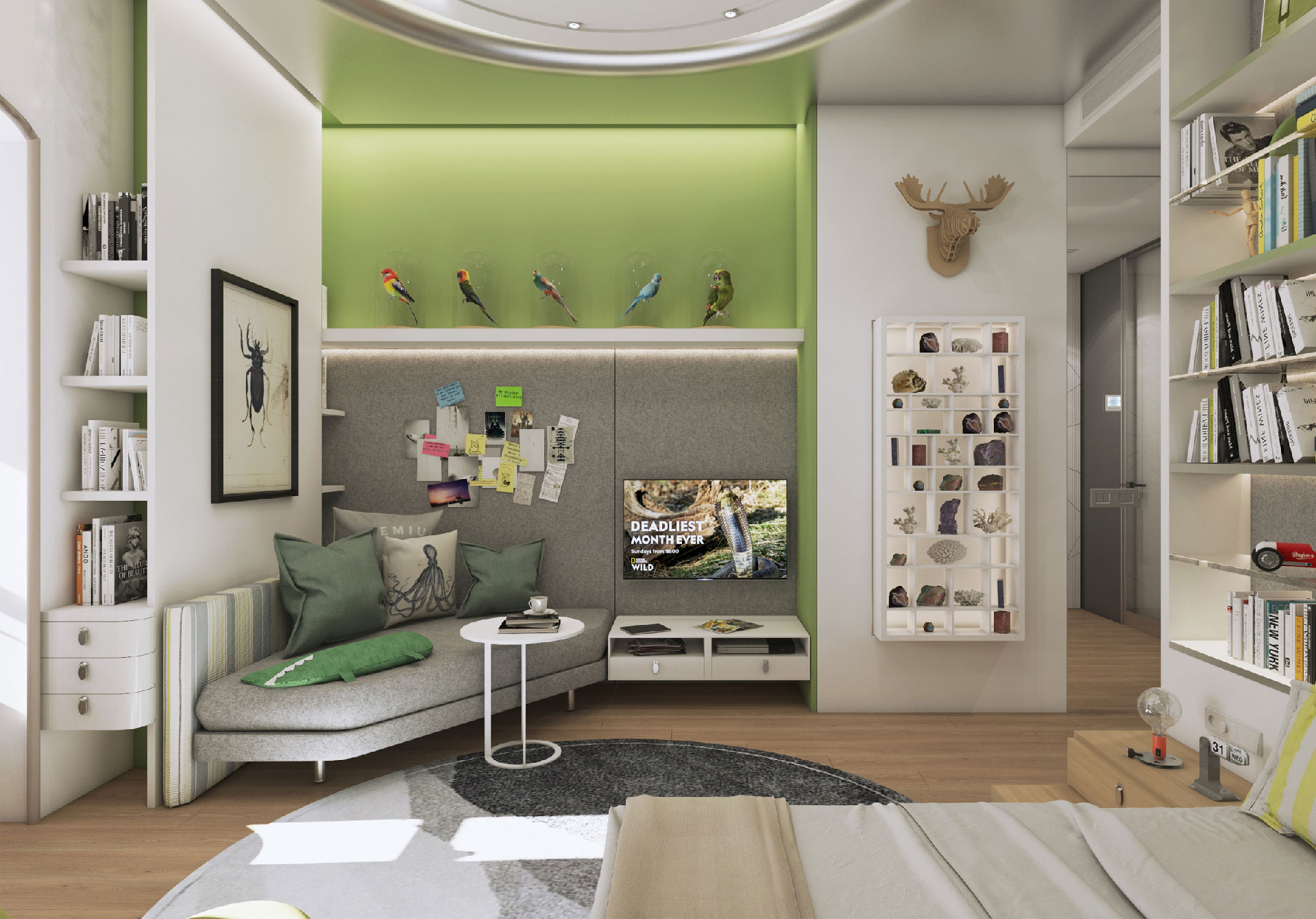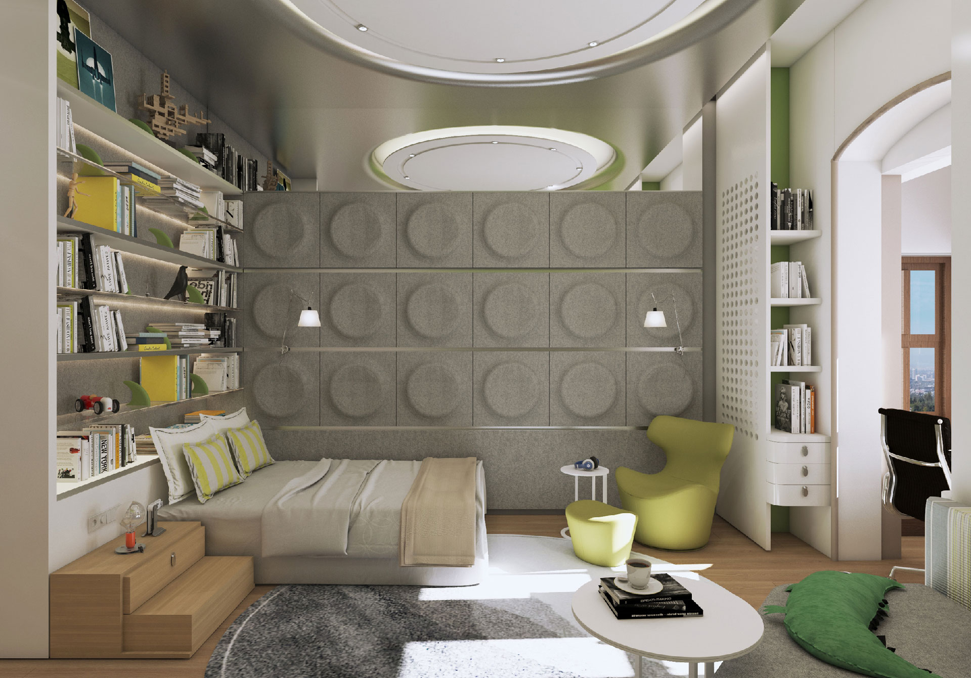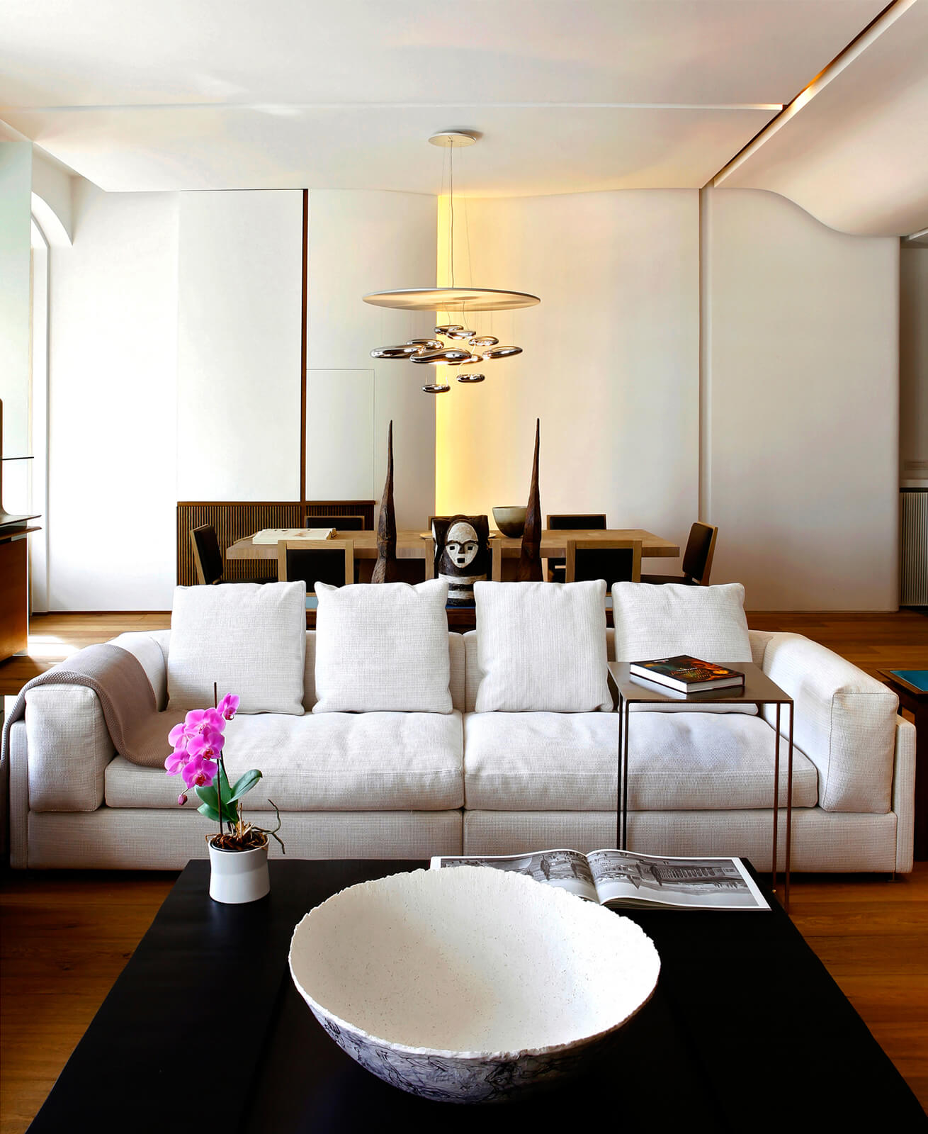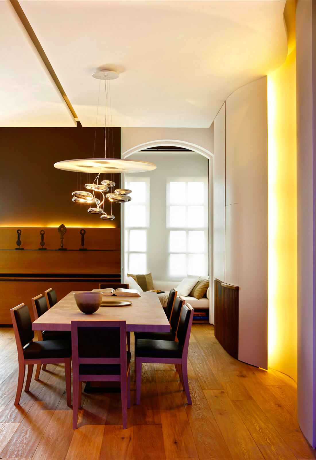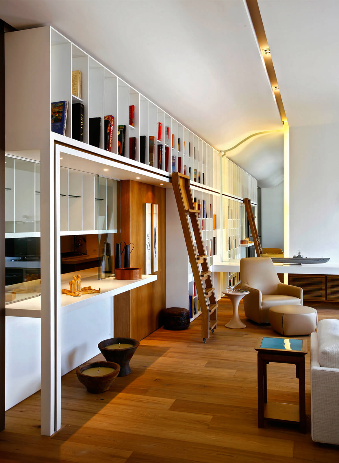 In this flat overlooking the Historic Peninsula with views of the Topkapı Palace, KM uses a vigorous layer of built-in units and furniture, which intelligently blends in with the walls, hiding its functionality while creating a subtle yet unique design aesthetic. As seen in the dining area, this play between form and function is enriched with curvy forms and indirect lighting. The most intriguing part of the house is perhaps the bookcase, a built-in unit separating the kitchen and living room, also connecting them through a window and counter. Floor to ceiling shelves with various sized grids emphasize the high ceiling of the historic building. Also giving considerable character and warmth to the space, the bookcase design is topped with an oak custom made sliding ladder, the perfect addition to a modern home library.