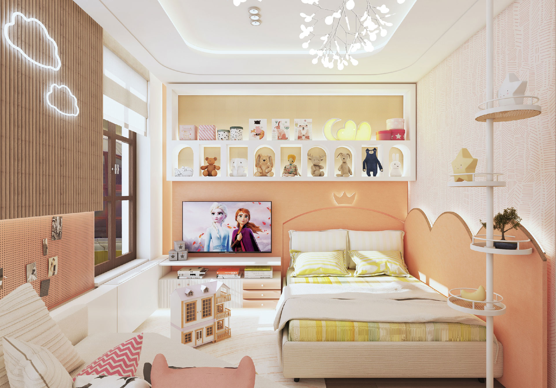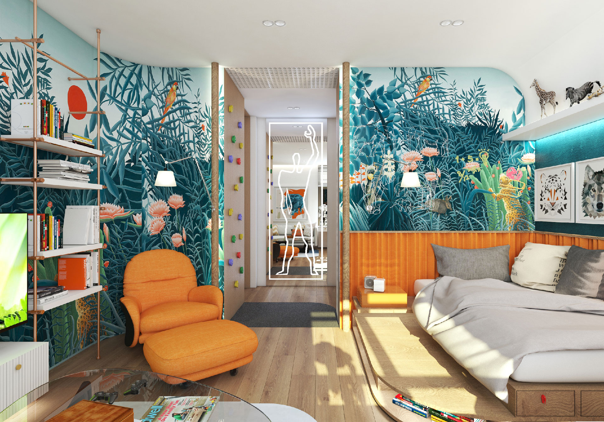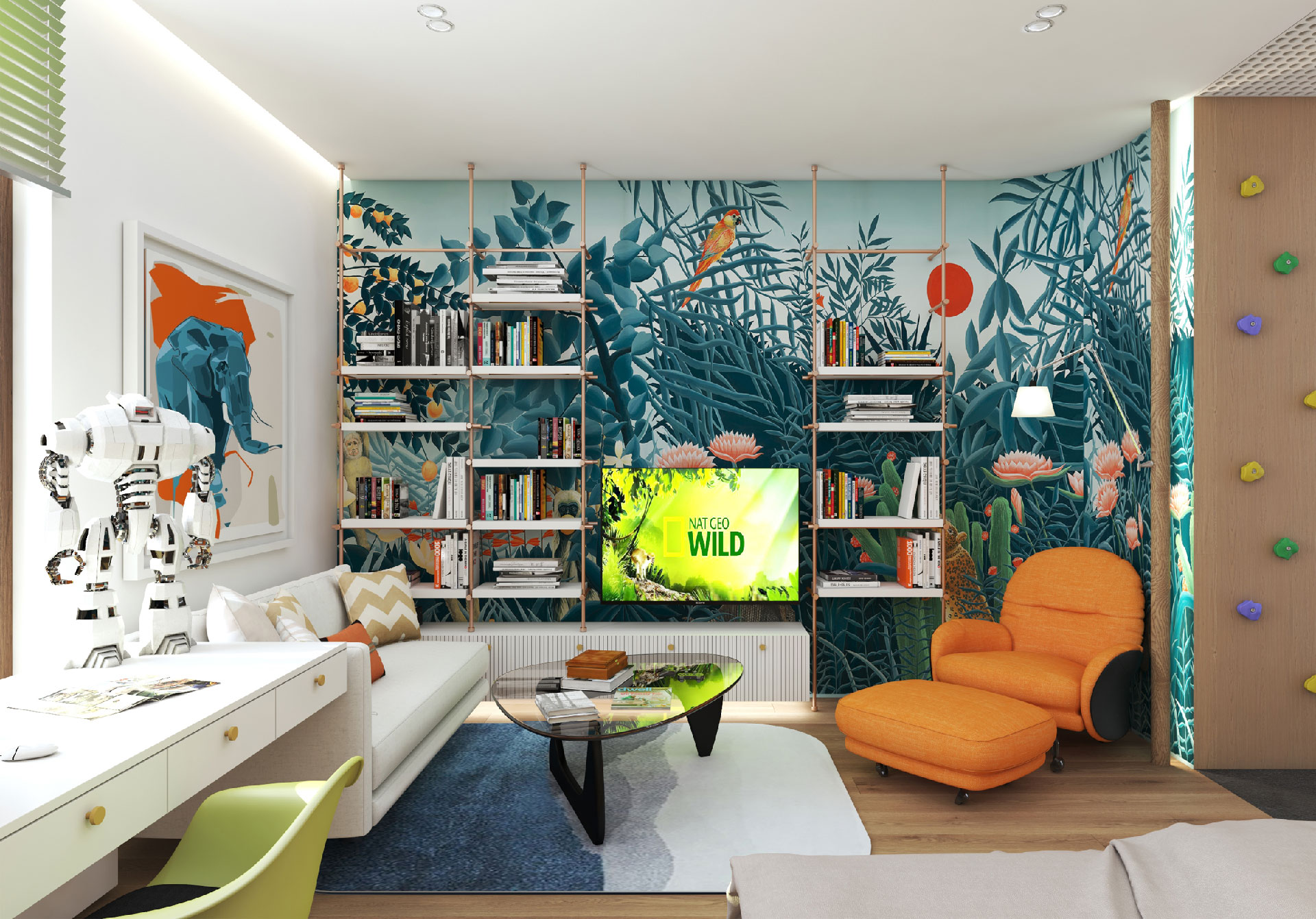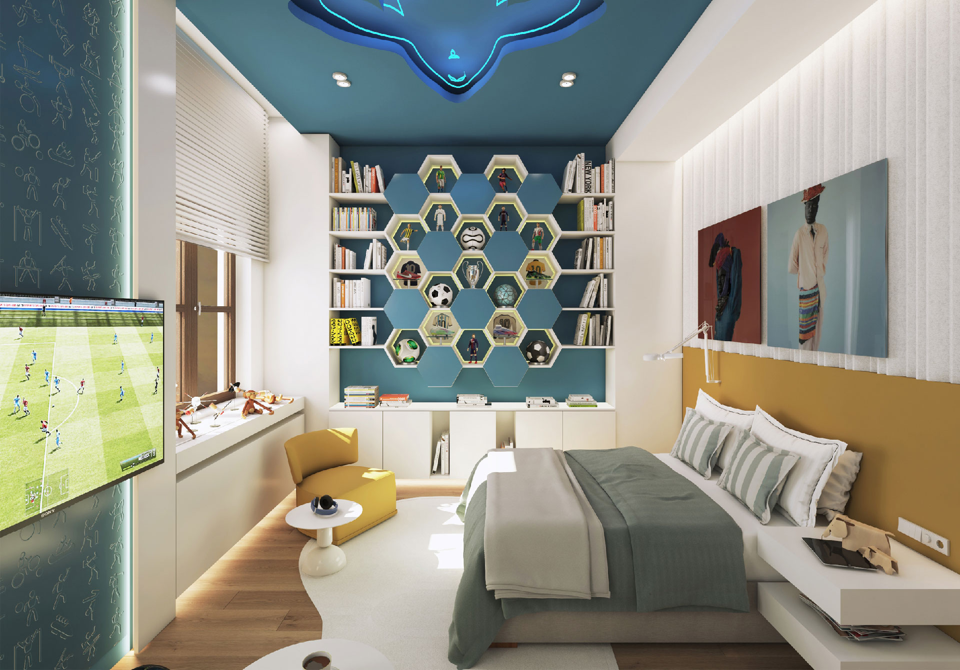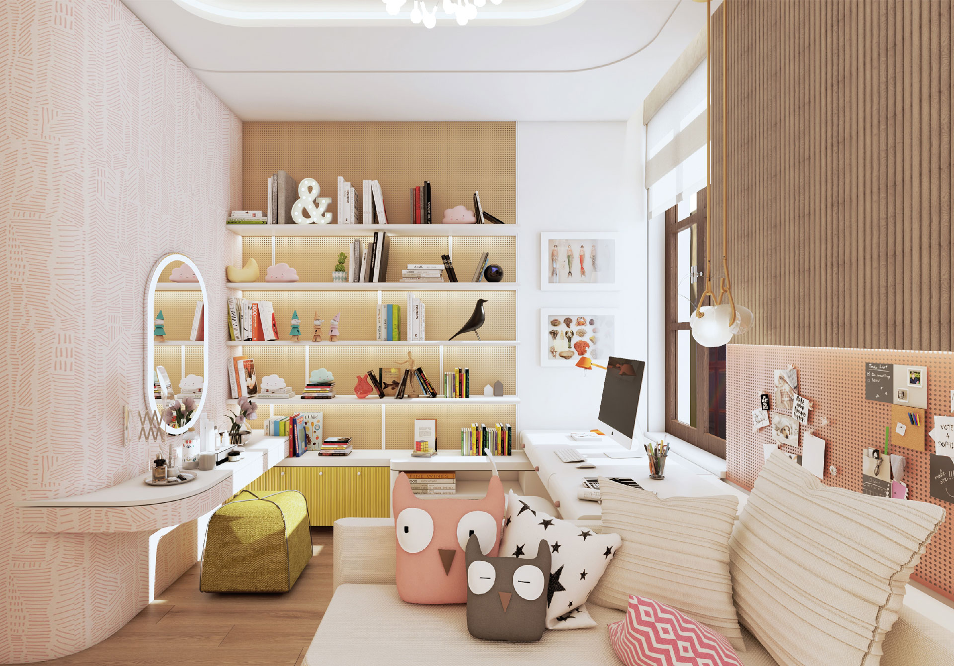 In this flat overlooking the Historic Peninsula with views of the Topkapı Palace, KM uses a vigorous layer of built-in units and furniture, which intelligently blends in with the walls, hiding its functionality while creating a subtle yet unique design aesthetic. As seen in the dining area, this play between form and function is enriched with curvy forms and indirect lighting. The most intriguing part of the house is perhaps the bookcase, a built-in unit separating the kitchen and living room, also connecting them through a window and counter. Floor to ceiling shelves with various sized grids emphasize the high ceiling of the historic building. Also giving considerable character and warmth to the space, the bookcase design is topped with an oak custom made sliding ladder, the perfect addition to a modern home library.