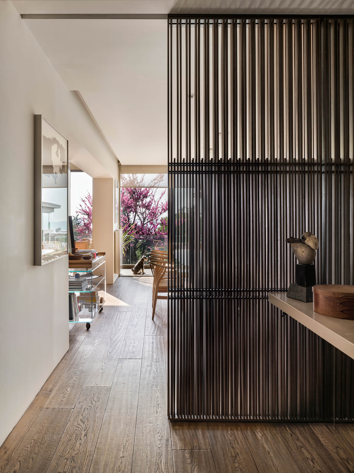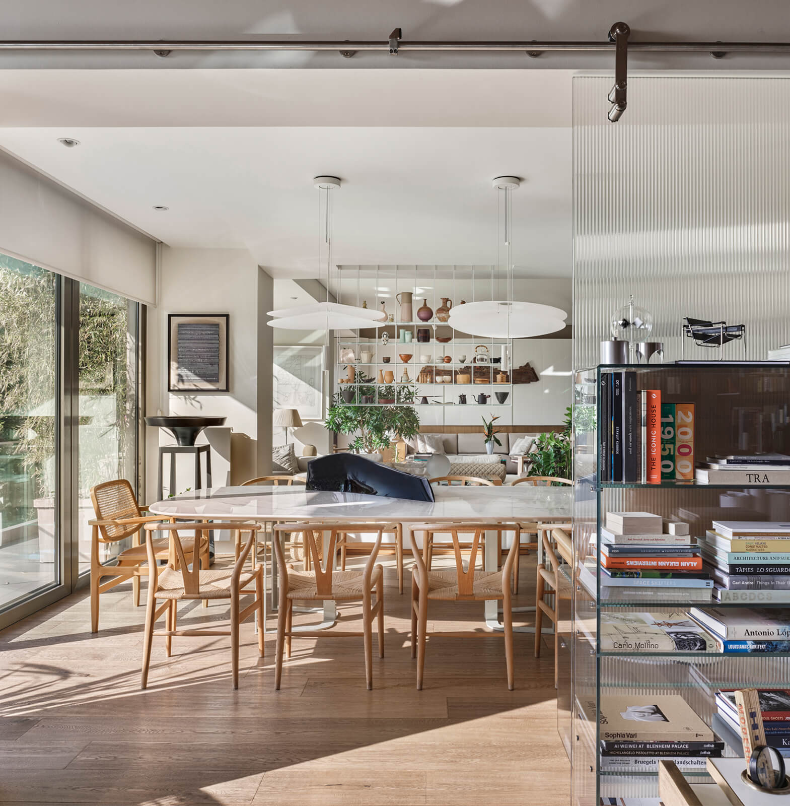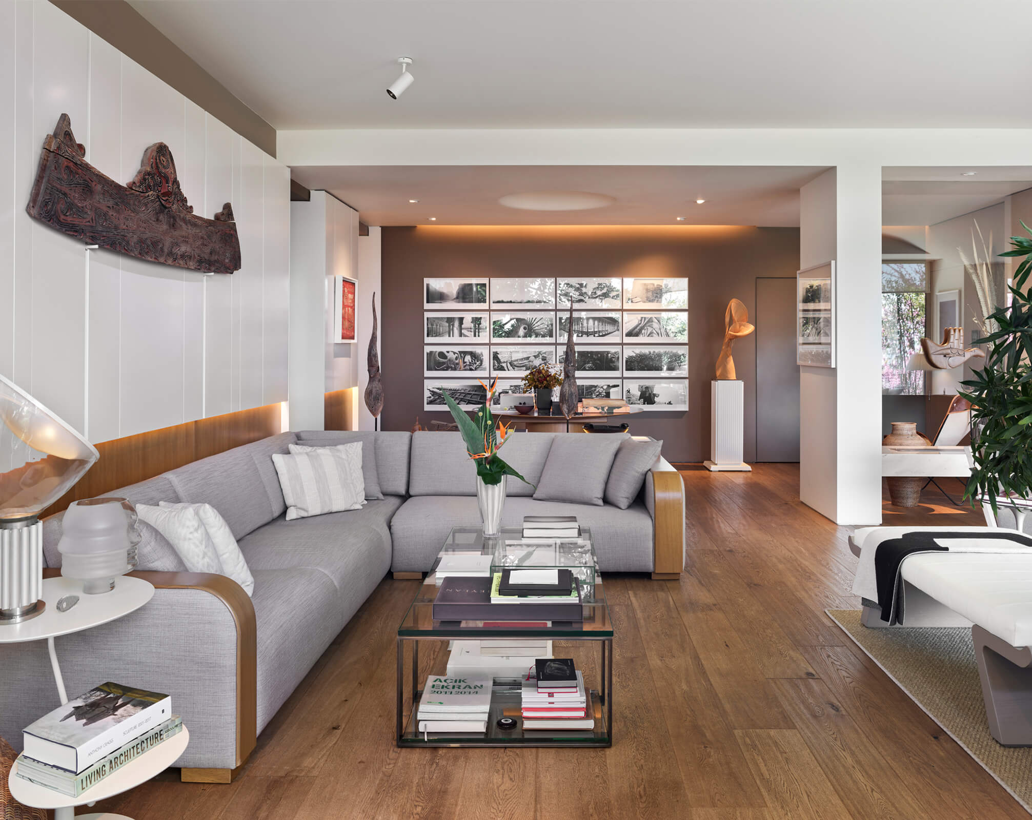 A family home for three, the architect’s own apartment provides a large and elongated living room, subtly divided by permeable separators to create a harmonious and calm common area for the family, allowing its members to spend time individually in the same space. These subtle dividers vary in color, material and form; some also function as display units or shelving, a design aspect commonly used in KM interiors. The curvilinear plaster ceiling adds distinct character, punctuates the harmony and continuity of the space while aptly concealing the beam across the ceiling. The front of the apartment is a 30 meters long fully glass façade that opens on to a 30 meters long terrace which looks out to an old green garden with typical Istanbul trees and plants through which one can get occasional glimpses of the Bosphorus.