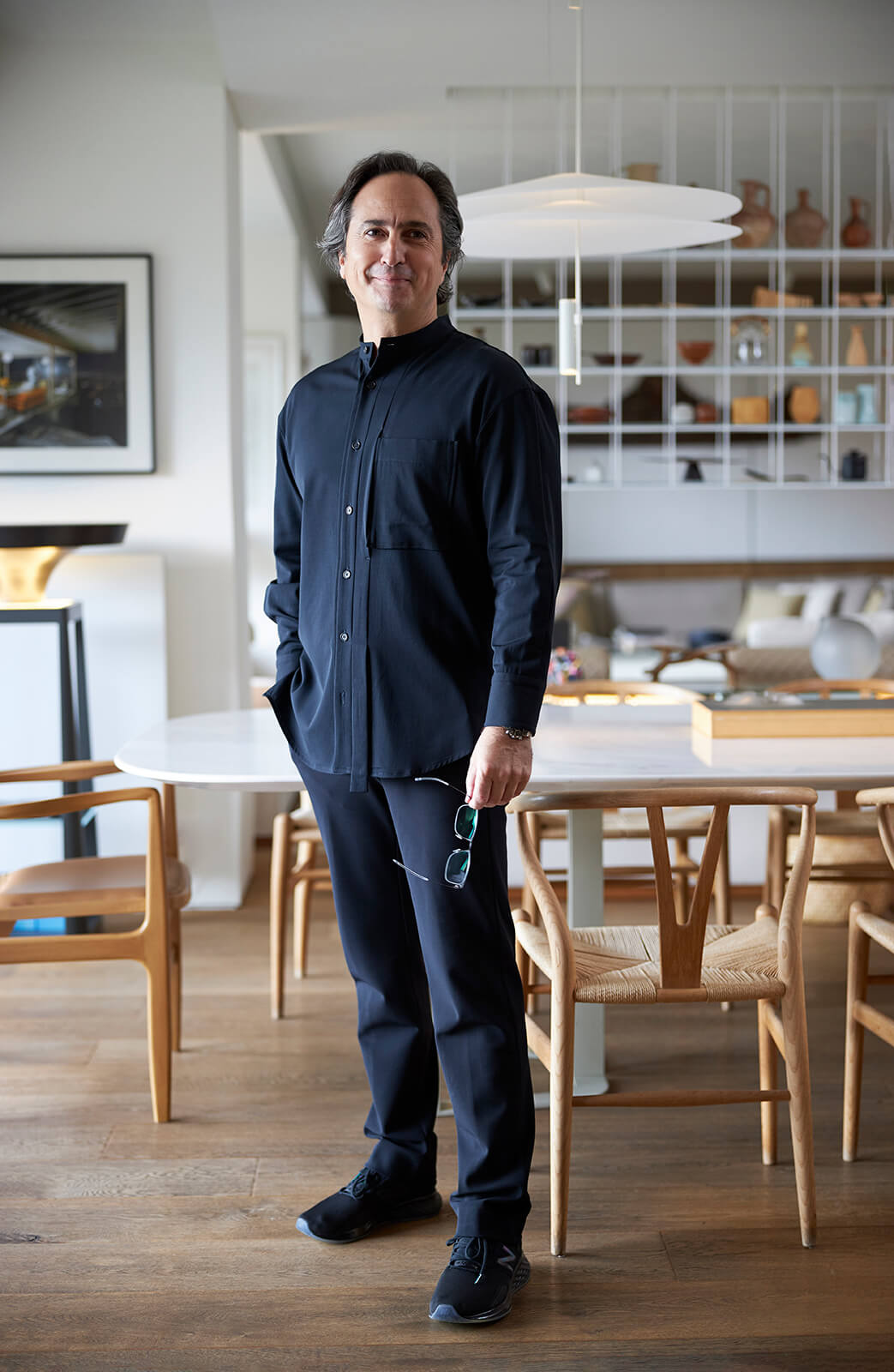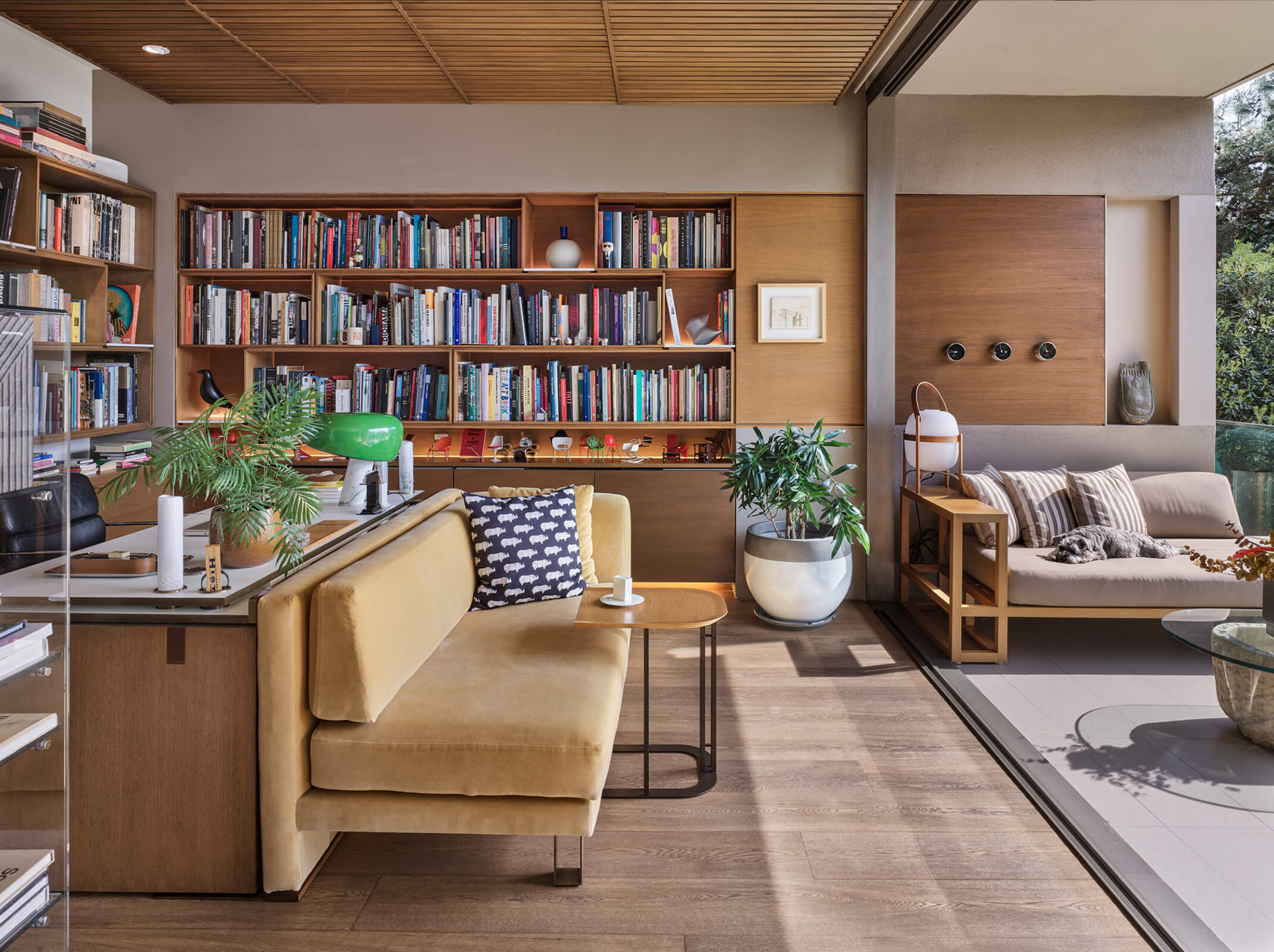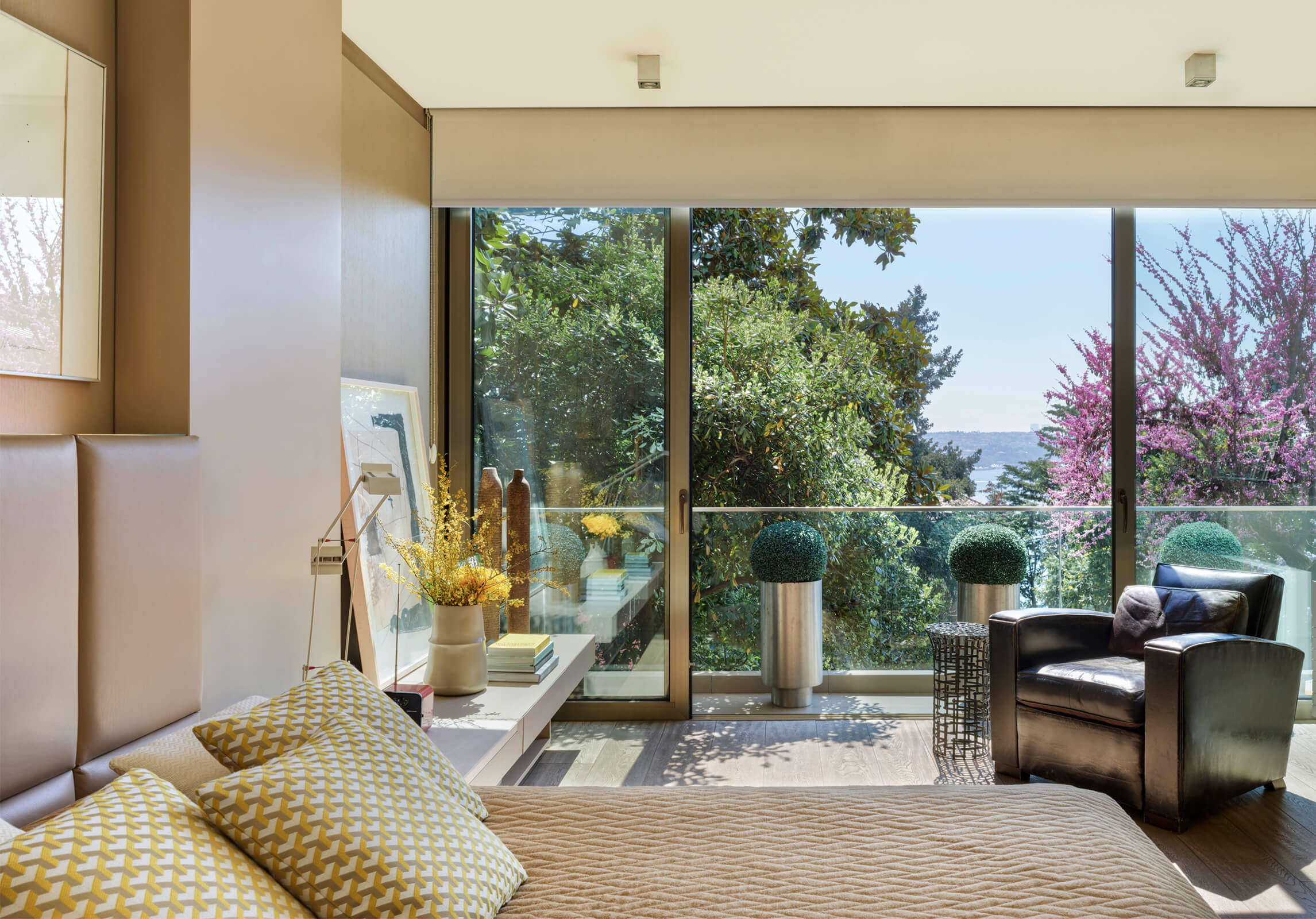 A family home for three, the architect’s own apartment provides a large and elongated living room, subtly divided by permeable separators to create a harmonious and calm common area for the family, allowing its members to spend time individually in the same space. These subtle dividers vary in color, material and form; some also function as display units or shelving, a design aspect commonly used in KM interiors. The curvilinear plaster ceiling adds distinct character, punctuates the harmony and continuity of the space while aptly concealing the beam across the ceiling. The front of the apartment is a 30 meters long fully glass façade that opens on to a 30 meters long terrace which looks out to an old green garden with typical Istanbul trees and plants through which one can get occasional glimpses of the Bosphorus.