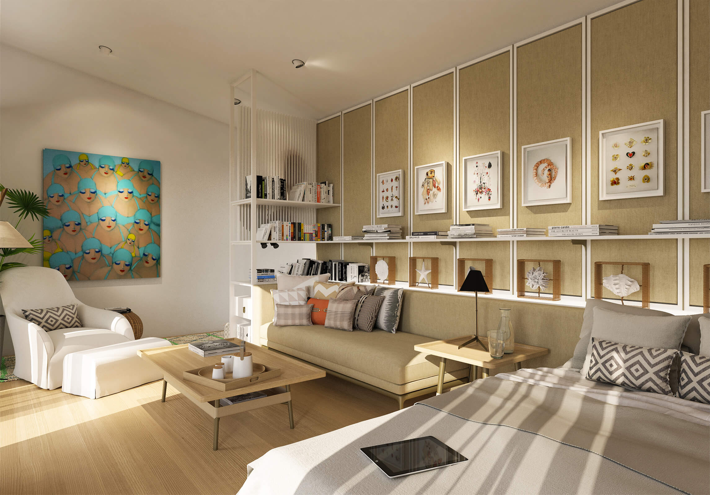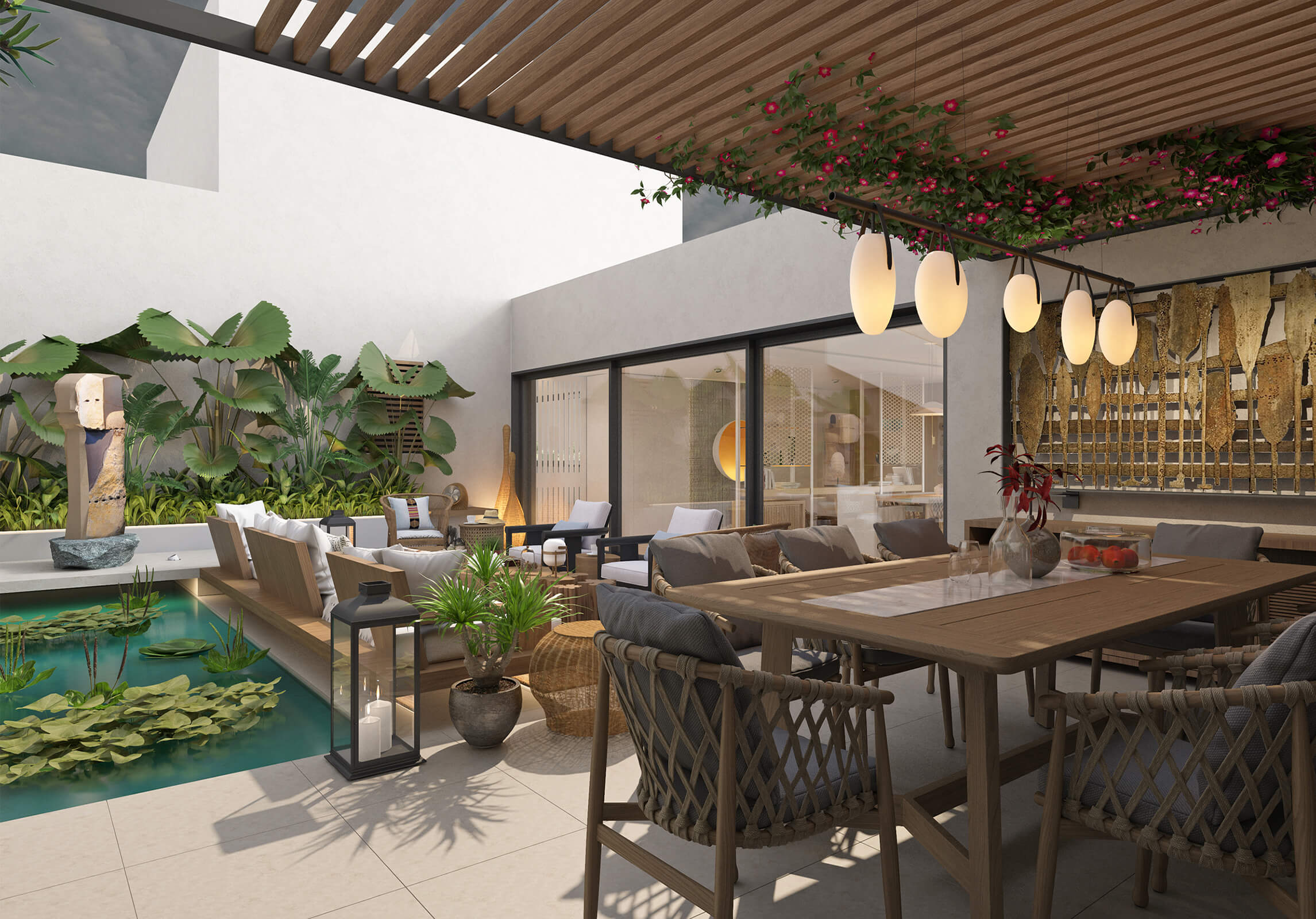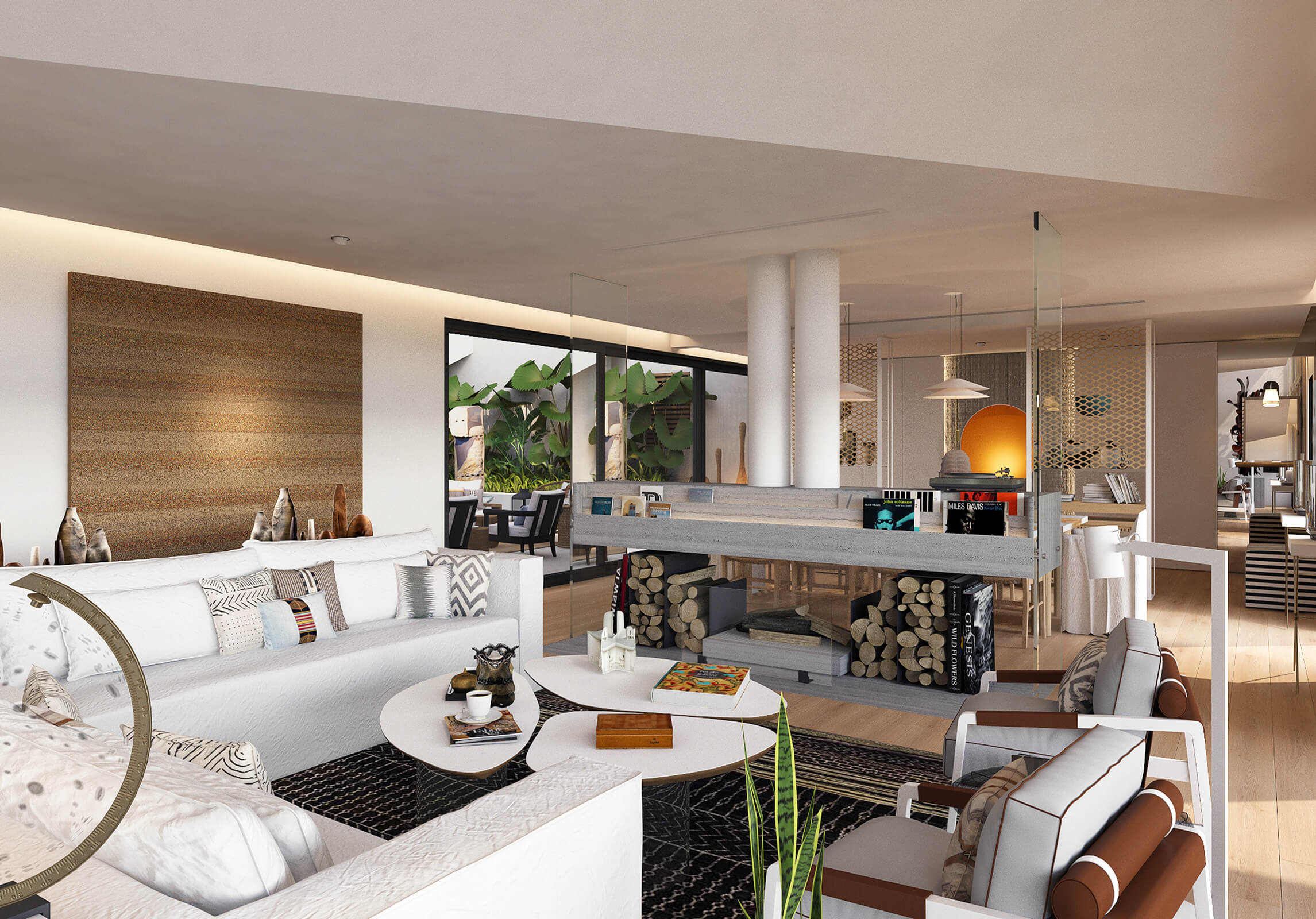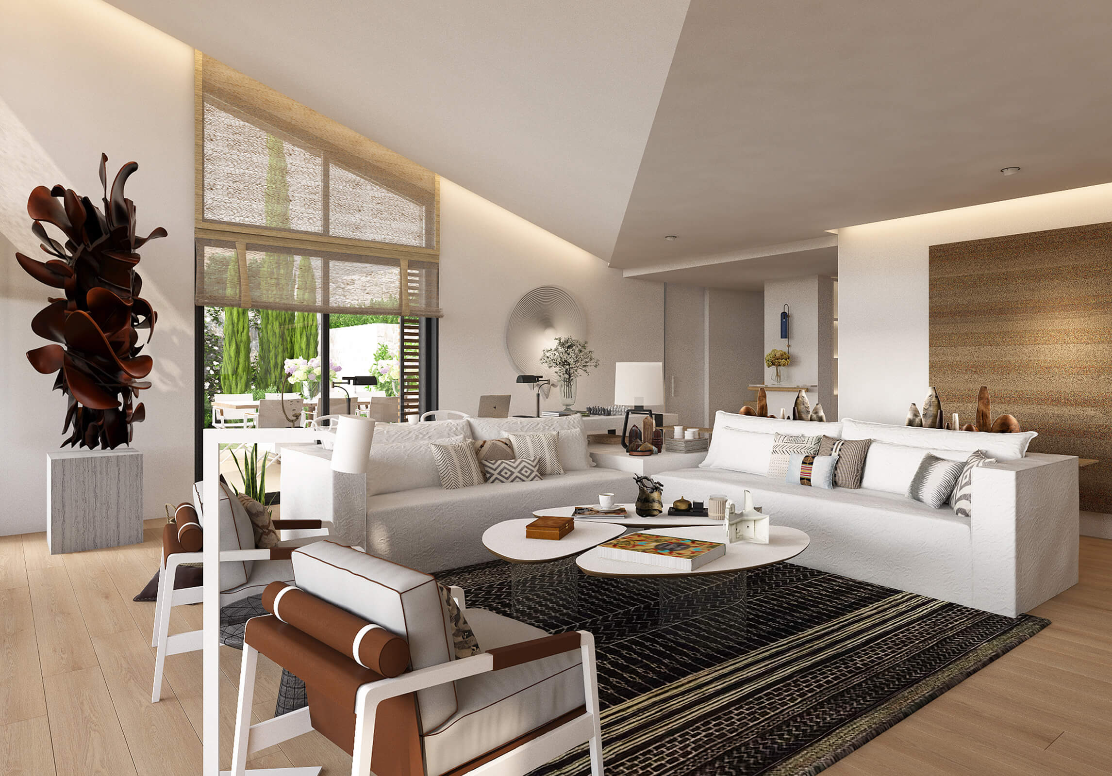 Located on the legendary Aegean coast across from Bodrum, this two storey contemporary villa dissolves seamlessly into the surrounding environment designed by architect Carlos Ferrater. A soft palette of whites and beiges and patterned upholstery exude the airy charm of a Mediterranean vacation home. The monumental fireplace in the center of the living area, with horizontal serpeggiante marble slabs standing on clear glass pillars, instantly adds unique character and subtle contrast to the space. Equipped with a garden and swimming pool, the family house also contains a small patio filled with vegetation and a decorative pool, offering a secluded and serene experience to its inhabitants, a hideaway from the strong winds of Mandalya Bay.