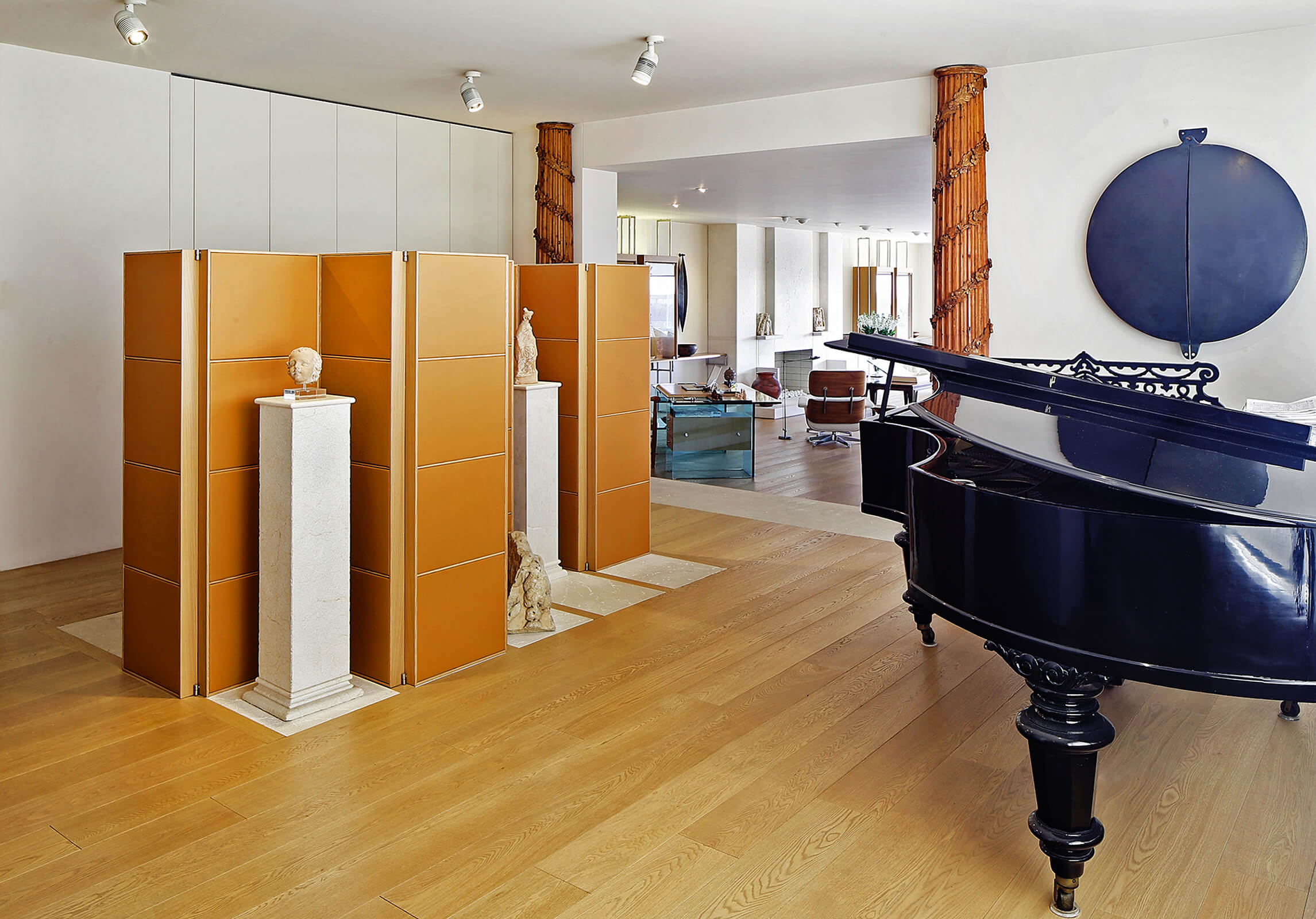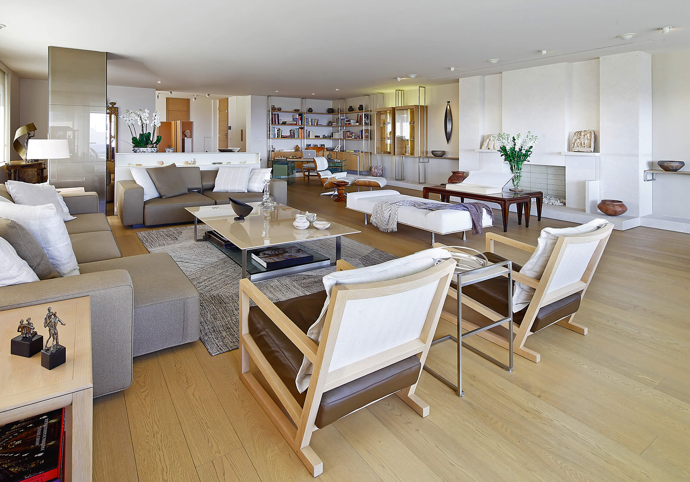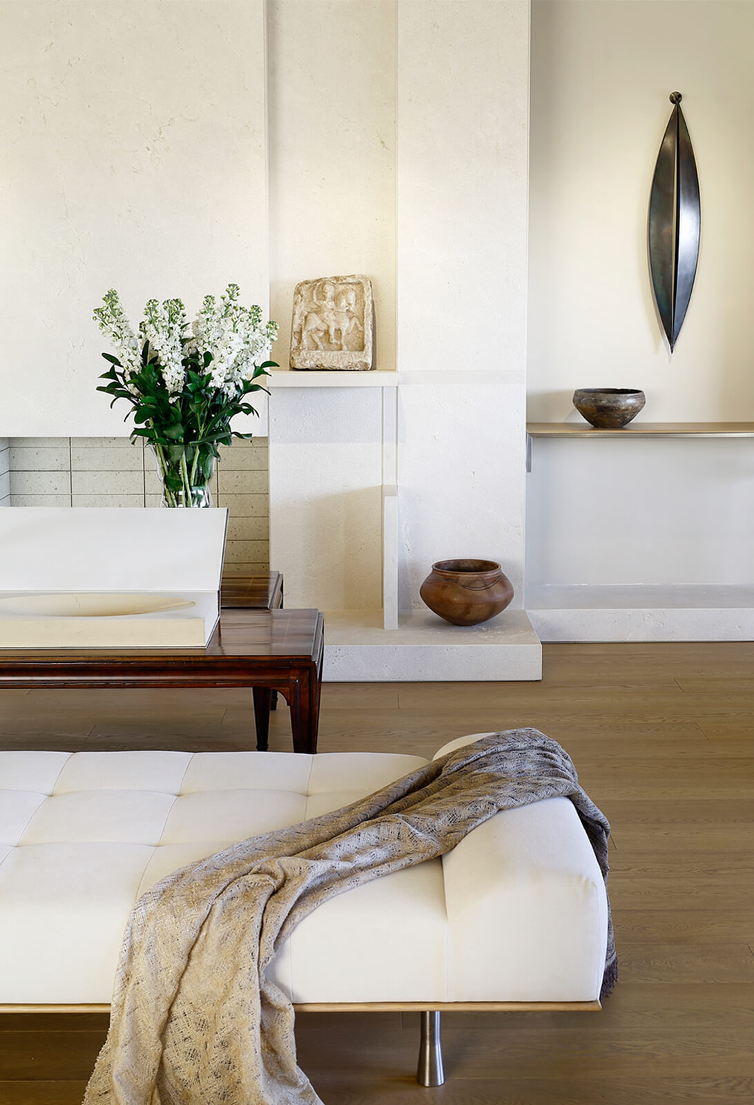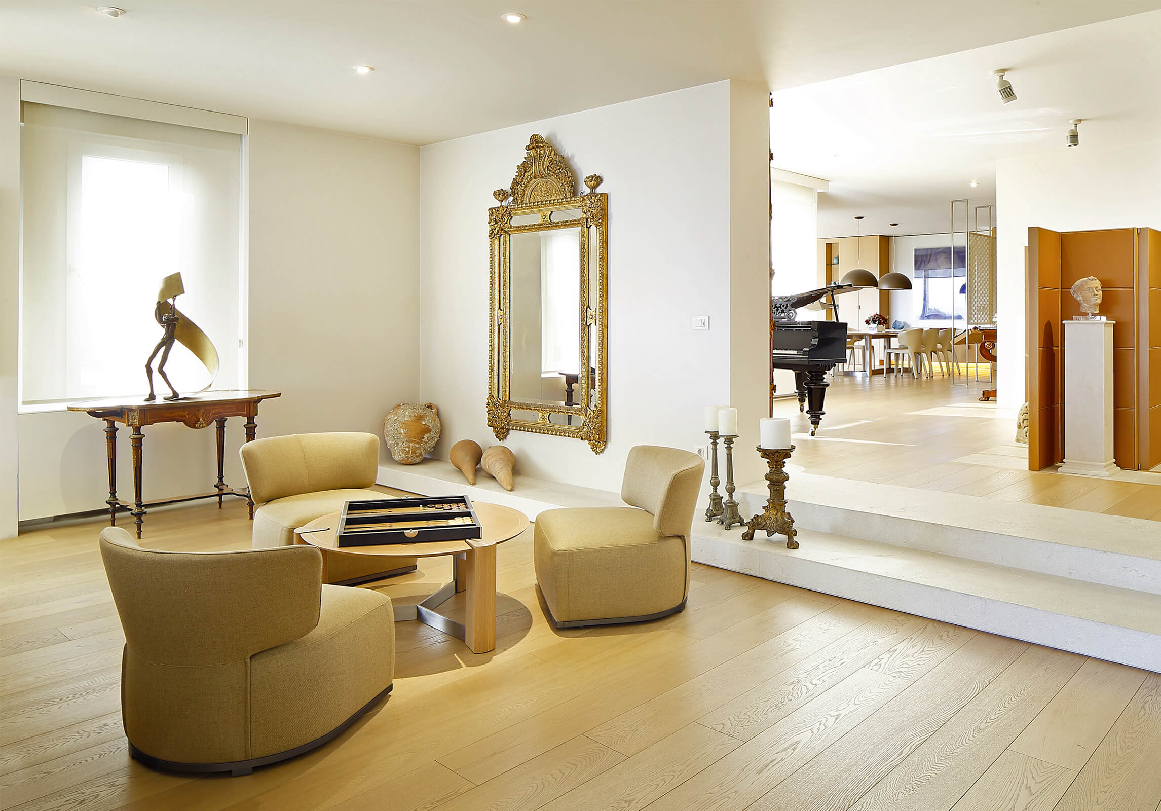 The modern sensibility in design has strived to make our homes airy and spacious places, providing a simple backdrop to our lives. As a style, modern architecture has in many instances been a restrictive approach, where only certain designs can be used. Since its beginnings, KM has tried to humanize modern design to where it serves its users and inhabitants and not the other way around. In this interior design project, KM sought to synthesize the functional aspects of the modern with classical features possessing a timeless quality. These designs are highlighted by the placement of handmade furniture in natural tones produced by local craftsmen, matched and mixed with pieces of sleek modern furniture. Stone and wood are used liberally to bring an organic feeling to the domestic interior complemented by natural sunlight and indirect lighting. The modern and classic are weaved together like a tapestry that holds the natural energy of the space together. The focal point of the home is surprisingly the large entrance where a grand piano resides in all its splendor.