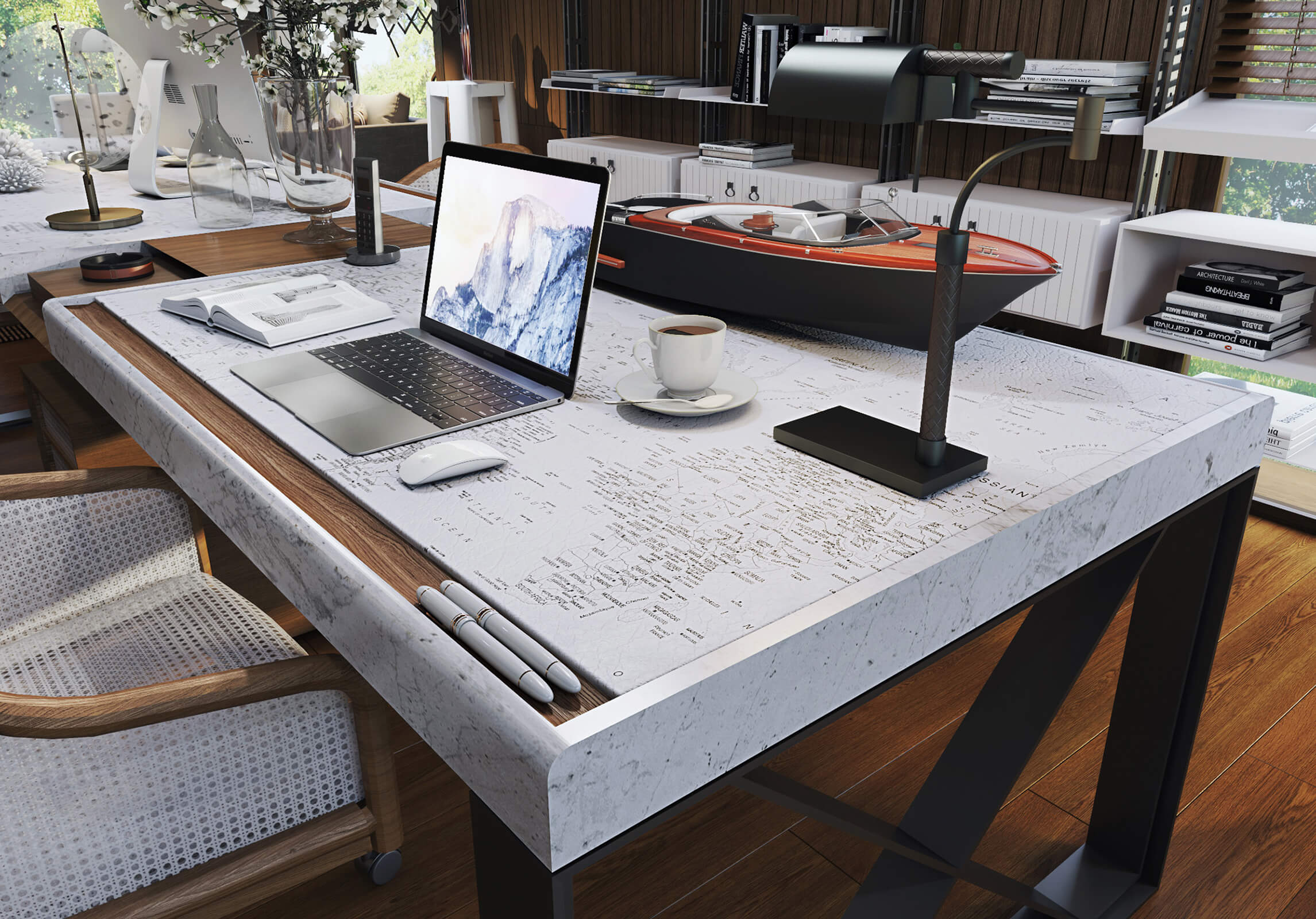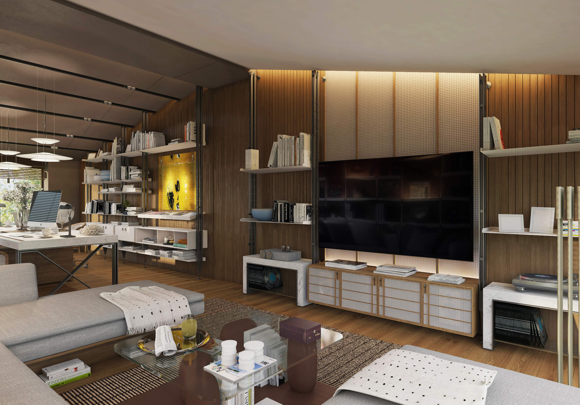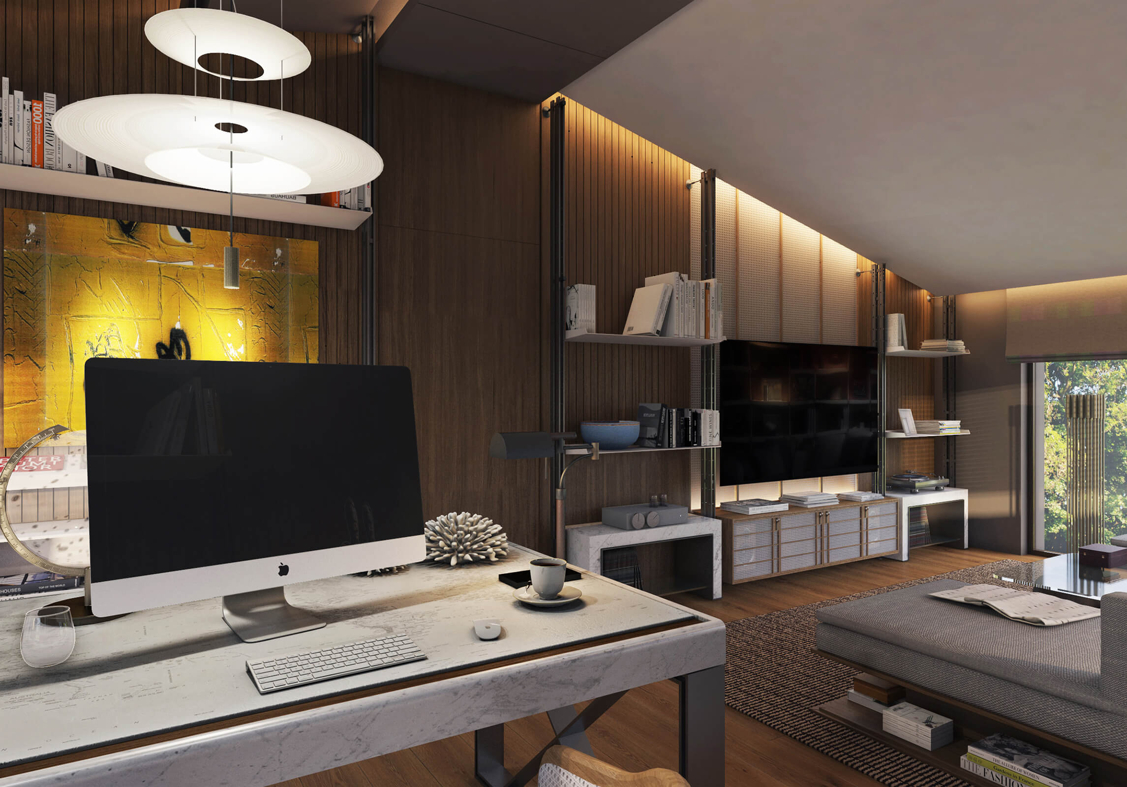 Across all their projects, KM’s design values seek to maximize the living potentiality of each space regardless of its function. Here in this attic a sloped ceiling, which can often be deemed an undesirable feature, inspired a unique design. Fragmented metal sheeted ceiling panels embedded with lighting were custom designed and give the space a distinct character with rhythm and dynamism. With walnut wall coverings, dark bronze and brown paint, a slightly darker palette lead the eye to the two large windows at both ends of the room. While one window faces the meticulously landscaped elegant garden of the home, the other embraces the ever changing beauty of the Bosphorus.