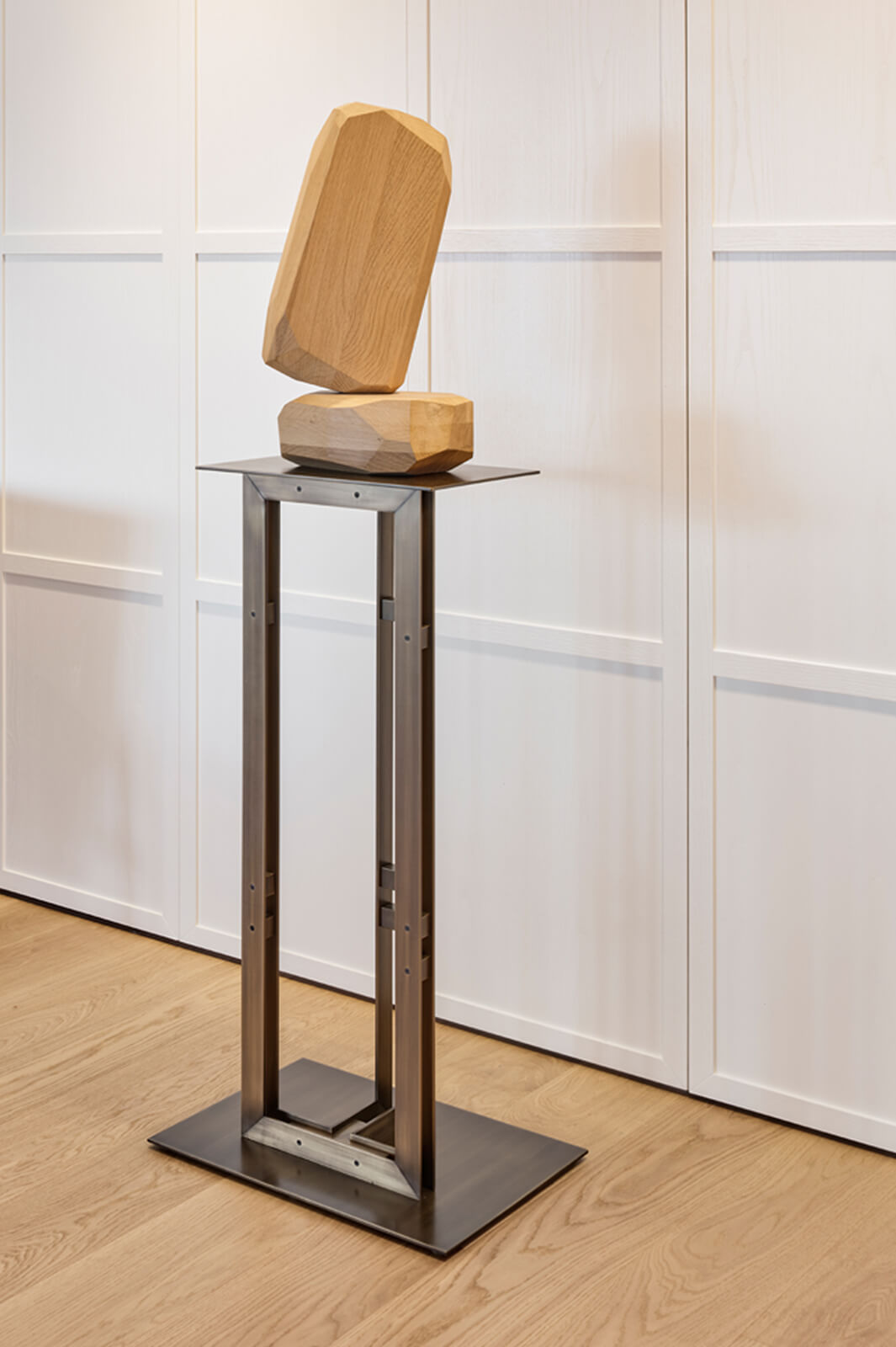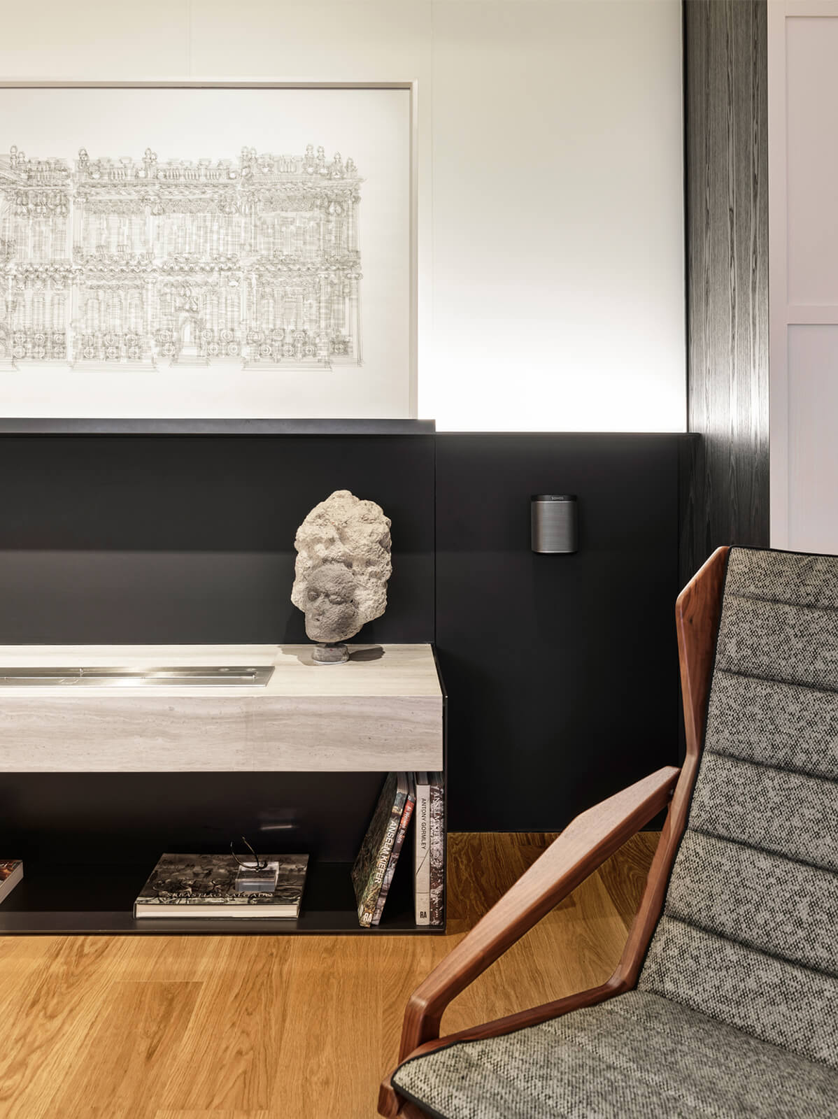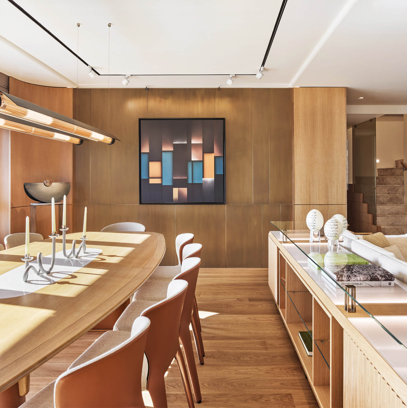 The lower floor is a unified common space consisting of a dining area, fireplace, living room and bar. All spaces flow into one another but are slightly separated. Artworks collected over the years, make a statement on the backdrops that were designed to make them stand out. The furnishings enhanced by the use of refined materials such as oak wood, patinated bronze, touches of genuine leather and serpeggiante marble, add a breath of luxury to the clean, contemporary aesthetic. All together, they form a modern ensemble, turning the space into a haven of peace in the heart of a super hectic city.