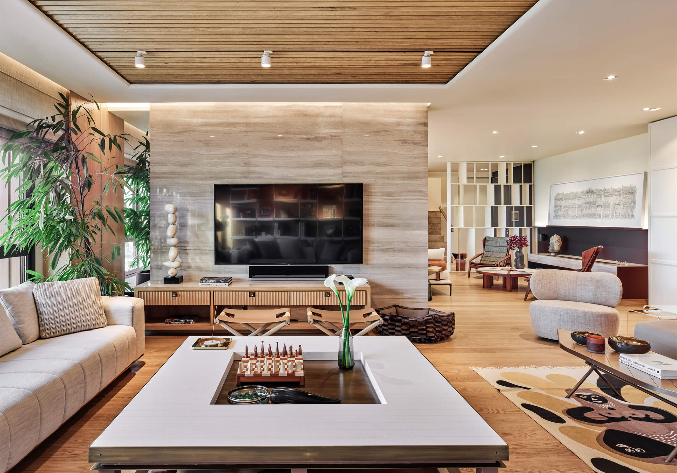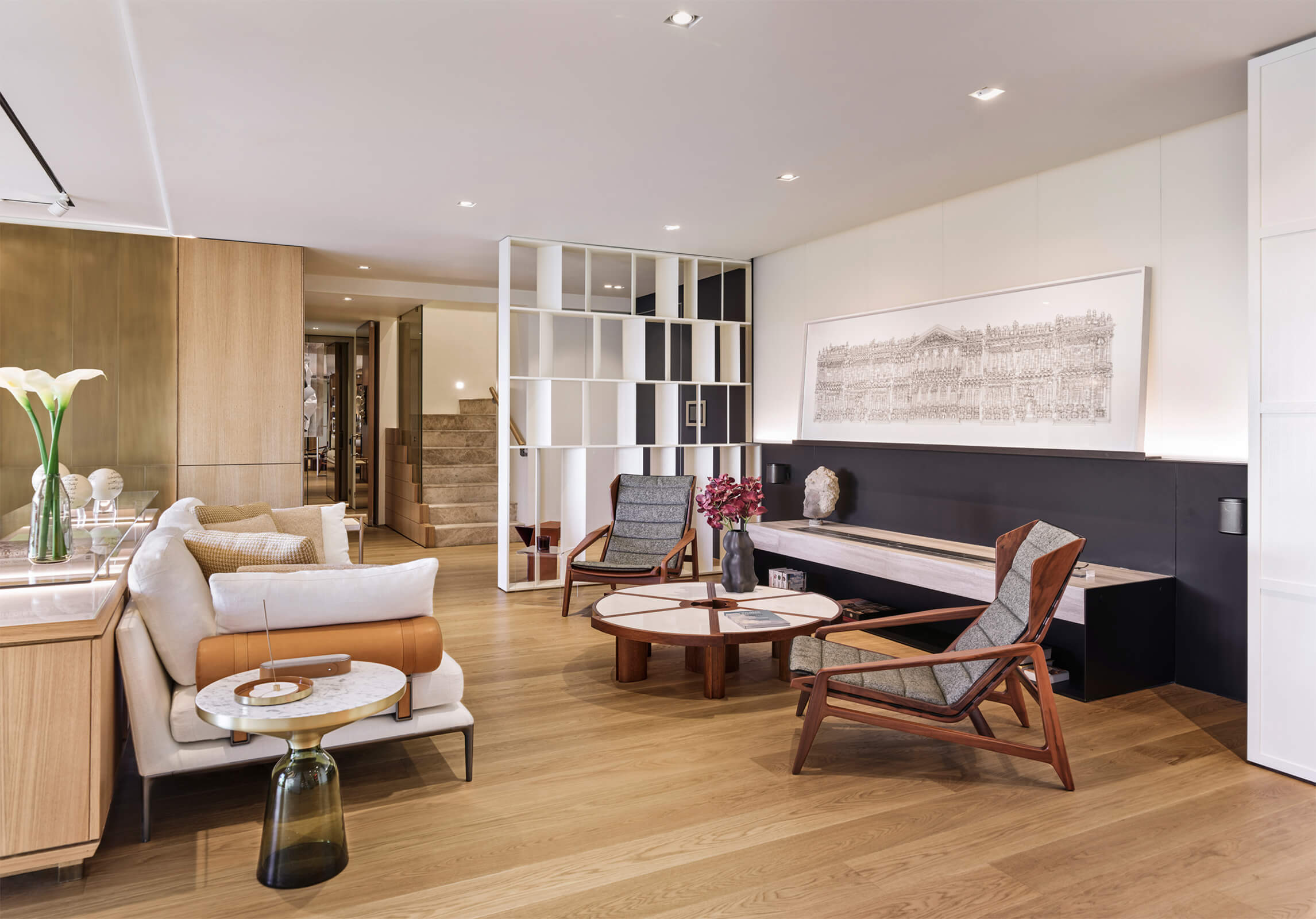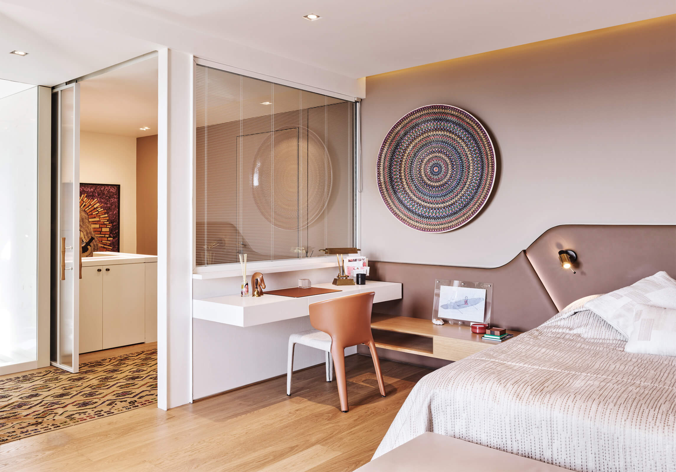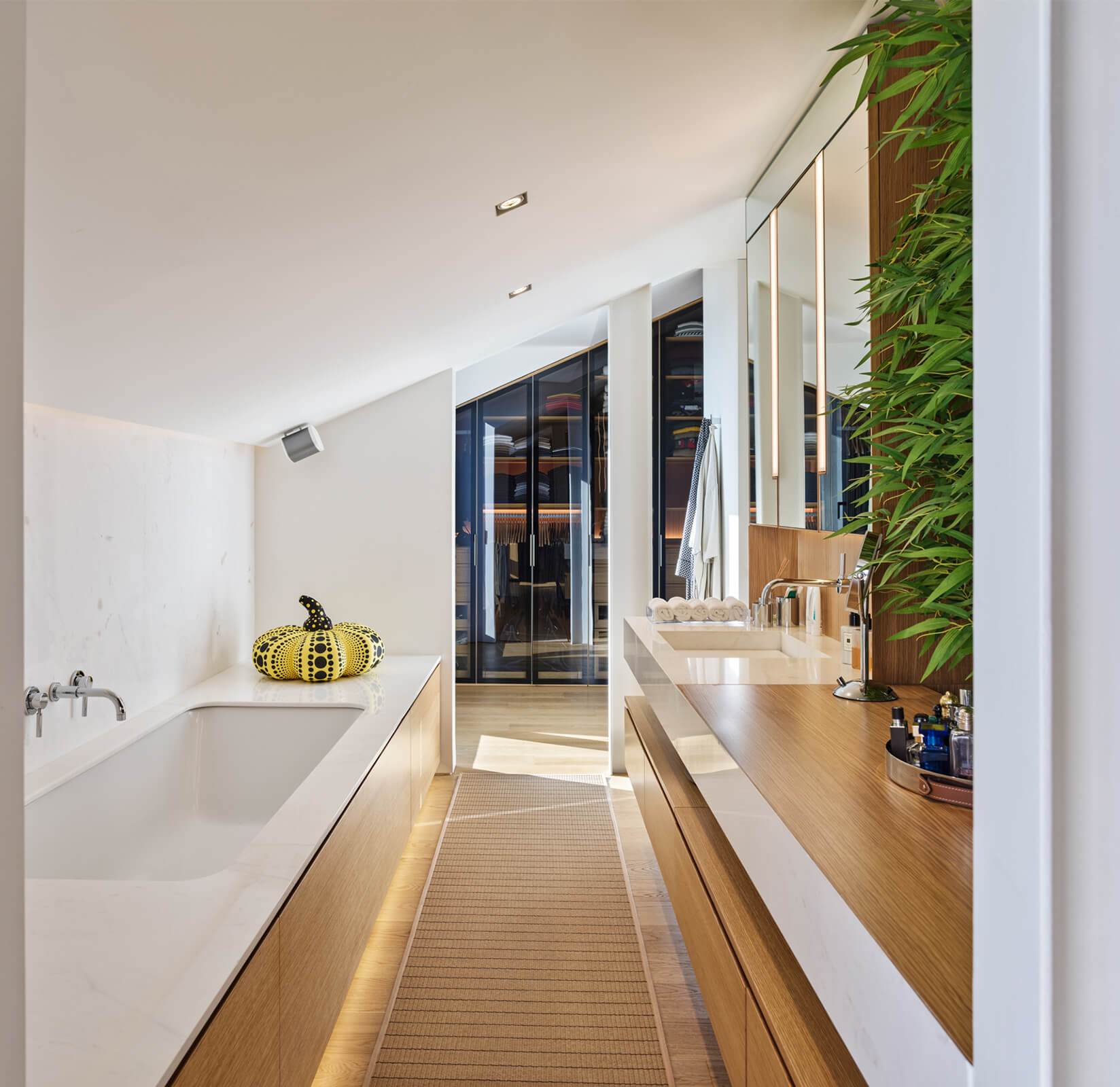 This townhouse situated very close to the financial district, atop Gayrettepe hill, overlooks both the city and the Bosphorus. The project was to unify two adjacent duplex penthouse flats into a single one, to reconfigure and open up space to enhance light and airiness. The upper floor consists of two bedroom suites, reached from separate staircases at both ends of the residence. Bedroom, bathroom and dressing rooms are seamlessly connected to each other, reminiscent of a five-star hotel room with the comfort of home.